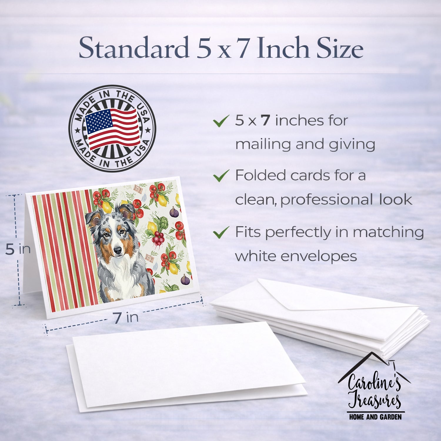 Shown here is the Blue Merle American Shepherd Vegetables Greeting Cards Pack of 8 from Caroline's Treasures featuring artwork of a American Shepherd in a Everyday design. The detailed illustration and vibrant colors make it a standout accent that celebrates both seasonal style and love for the subject. This image features a vibrant watercolor vegetable pattern with tomatoes, lemons, artichokes, figs, radishes, and leafy greens arranged in a repeating design, paired with classic red and green stripes. The bright, garden-fresh palette creates a cheerful, farmhouse-inspired look that feels lively, welcoming, and perfect for kitchen décor. Everyday décor celebrates personal style and the small moments that make a house feel like home. Thoughtful designs add warmth and personality that can be enjoyed year-round. Celebrate special moments with Caroline's Treasures Printed Greeting Card Pack. This pack includes eight beautifully folded 5x7 cards, accompanied by eight matching white envelopes. With blank interiors, these cards provide ample space for your personalized messages and heartfelt holiday greetings. Each card features captivating full-color artwork, meticulously printed in our facility on high-quality 80 lb cover stock or 216 GSM. The super smooth finish of the white cards enhances the visual impact of the artwork, creating a truly stunning presentation. Designed by our talented in-house artists or licensed artists, the artwork on these cards showcases their creativity and attention to detail. From vibrant illustrations to captivating designs, each card tells its own unique story. Whether it's for birthdays, anniversaries, holidays, or any special occasion, Caroline's Treasures Greeting Card Pack is the perfect way to convey your heartfelt sentiments. Share joy, love, and warm wishes with these exquisite cards and make every moment unforgettable. Perfect for: Writing personal messages, everyday correspondence, and thoughtful notes, Dogs-themed stationery collections, or year-round use for American Shepherd lovers. American Shepherds are intelligent, agile dogs known for their strong work ethic and loyal nature. Bred for herding and companionship, this breed thrives in active households and forms deep bonds with its family. Makes a heartfelt gift for: American Shepherd owners, Dogs lovers, Everyday gifts, pet parents, friends who adore their American Shepherd, or anyone celebrating Dogs.
