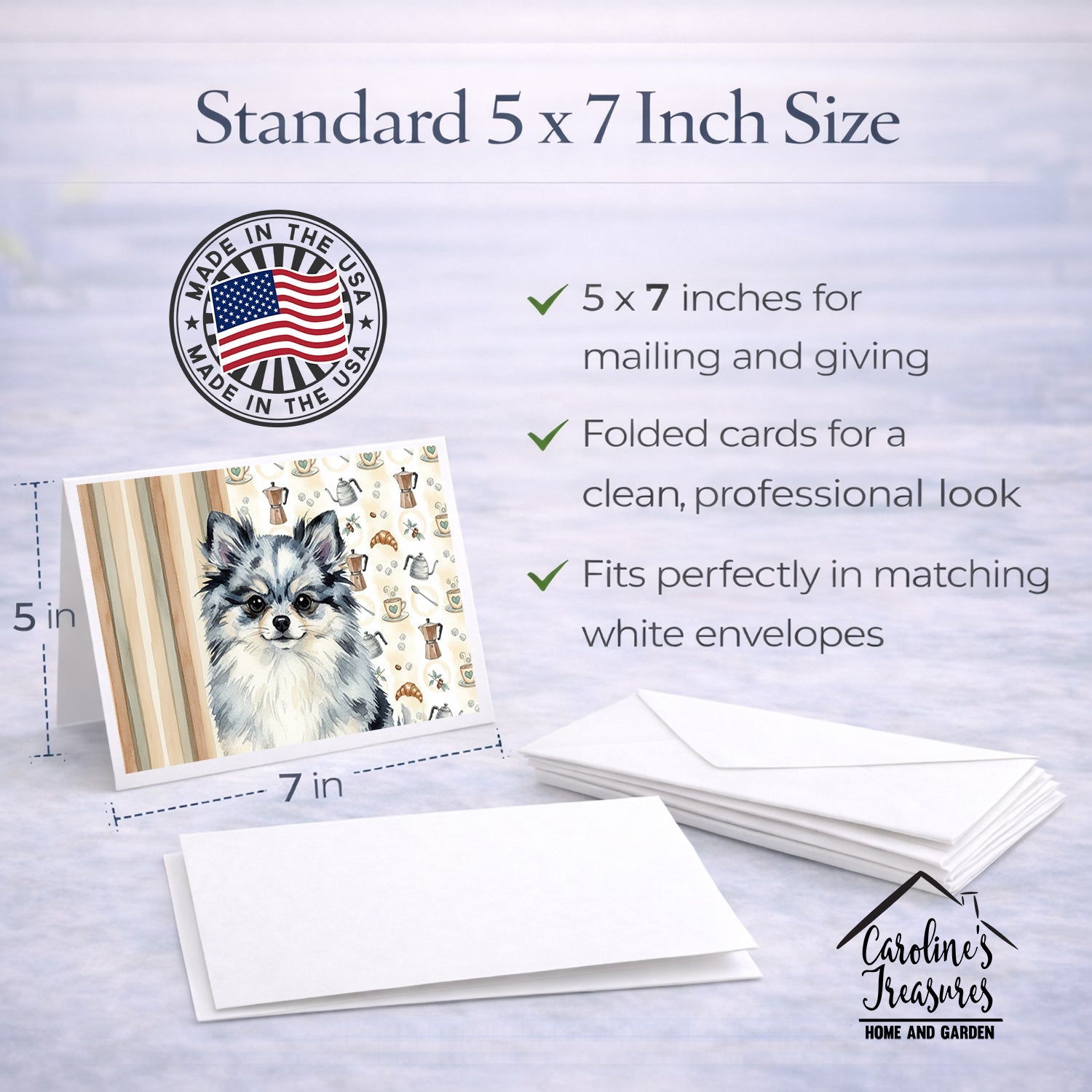 Shown here is the Blue Merle Pomeranian Coffee Bar Greeting Cards Pack of 8 from Caroline's Treasures featuring artwork of a Pomeranian in a Everyday design. The detailed illustration and vibrant colors make it a standout accent that celebrates both seasonal style and love for the subject. This image features a cozy watercolor coffee-themed pattern with illustrated mugs, moka pots, kettles, croissants, coffee beans, and sugar cubes arranged in a repeating design. Soft neutral tones with warm browns, creams, and subtle sage accents create an inviting, café-inspired look that feels comforting and relaxed. Everyday décor celebrates personal style and the small moments that make a house feel like home. Thoughtful designs add warmth and personality that can be enjoyed year-round. Celebrate special moments with Caroline's Treasures Printed Greeting Card Pack. This pack includes eight beautifully folded 5x7 cards, accompanied by eight matching white envelopes. With blank interiors, these cards provide ample space for your personalized messages and heartfelt holiday greetings. Each card features captivating full-color artwork, meticulously printed in our facility on high-quality 80 lb cover stock or 216 GSM. The super smooth finish of the white cards enhances the visual impact of the artwork, creating a truly stunning presentation. Designed by our talented in-house artists or licensed artists, the artwork on these cards showcases their creativity and attention to detail. From vibrant illustrations to captivating designs, each card tells its own unique story. Whether it's for birthdays, anniversaries, holidays, or any special occasion, Caroline's Treasures Greeting Card Pack is the perfect way to convey your heartfelt sentiments. Share joy, love, and warm wishes with these exquisite cards and make every moment unforgettable. Perfect for: Writing personal messages, everyday correspondence, and thoughtful notes, Dogs-themed stationery collections, or year-round use for Pomeranian lovers. Pomeranians are small companion dogs known for their fluffy coats and lively personality. This breed is cherished for its confidence, intelligence, and affectionate nature. Makes a heartfelt gift for: Pomeranian owners, Dogs lovers, Everyday gifts, pet parents, friends who adore their Pomeranian, or anyone celebrating Dogs.