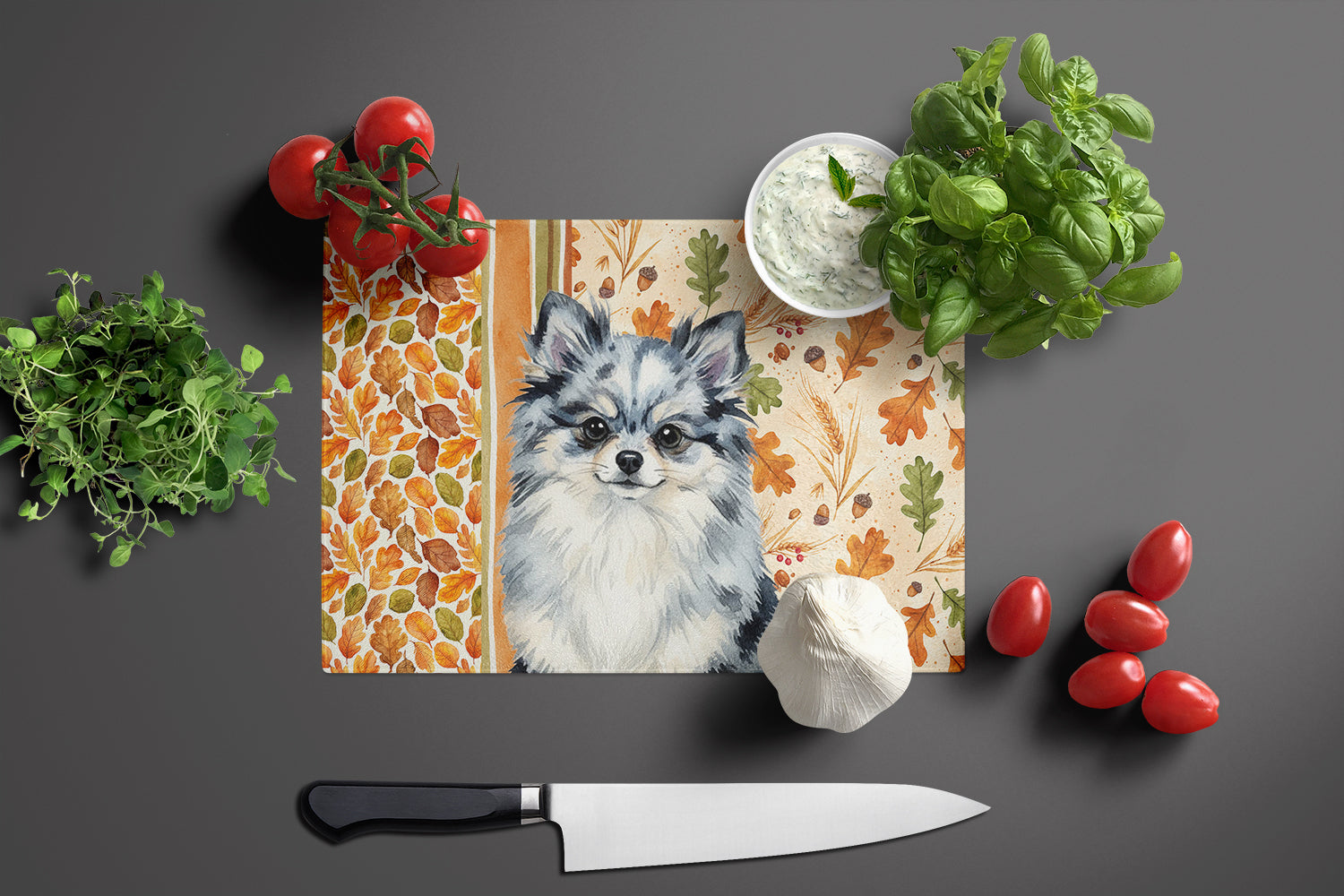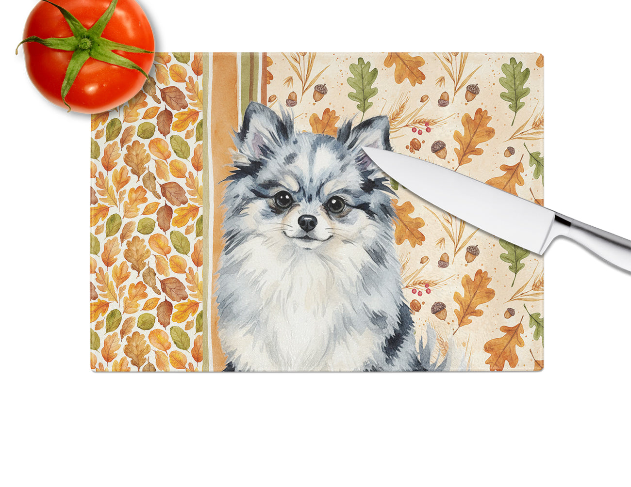 Glass Cutting Board featuring breed specific Pomeranian artwork. Celebrate Thanksgiving with this Thanksgiving Cutting Board. Introduce your kitchen to the vibrant, large Decorative Glass Cutting Board from Caroline's Treasures. Crafted from resilient tempered glass, this board is not only a utilitarian necessity but also a colorful art piece. With its generous dimensions of 15 inches in height and 12 inches in length, it offers ample space for all your cutting needs. Every piece showcases captivating artwork from distinguished artists, bringing an aesthetic edge to your kitchen. Beyond its attractive design, this cutting board ensures your countertop stays pristine and unscathed, owing to its heat-resistant properties. Engineered with user convenience in mind, it features non-skid feet for stability, and rounded corners for additional safety. Its robust construction renders it virtually unbreakable, guaranteeing longevity. The board comes with protective feet bumpers, maintaining its position during use. This product is recommended to be hand washed only. Proudly printed and assembled in the United States, this cutting board exemplifies superior craftsmanship. With Caroline's Treasures' Decorative Glass Cutting Board, you're investing in a blend of functionality and artistic flair.