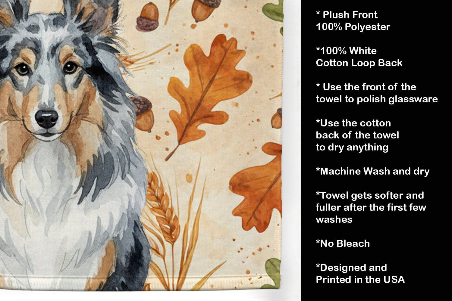 Kitchen Towel featuring breed specific Sheltie Shetland Sheepdog artwork. Celebrate Thanksgiving with this Thanksgiving Kitchen Towel. Bring cozy fall charm to your sink or powder room with a plush velour towel featuring original watercolor artwork. The front is a soft, color-rich minky polyester that polishes glassware to a brilliant shine; the back is 100% white cotton terry loop for quick absorbency on hands, dishes, and counters. Artwork is dyed into the fibers for lasting color that won’t crack or peel. Finished edges keep the shape wash after wash. Size: 15" x 25". Machine wash; tumble dry low. Designed and printed in the USA.