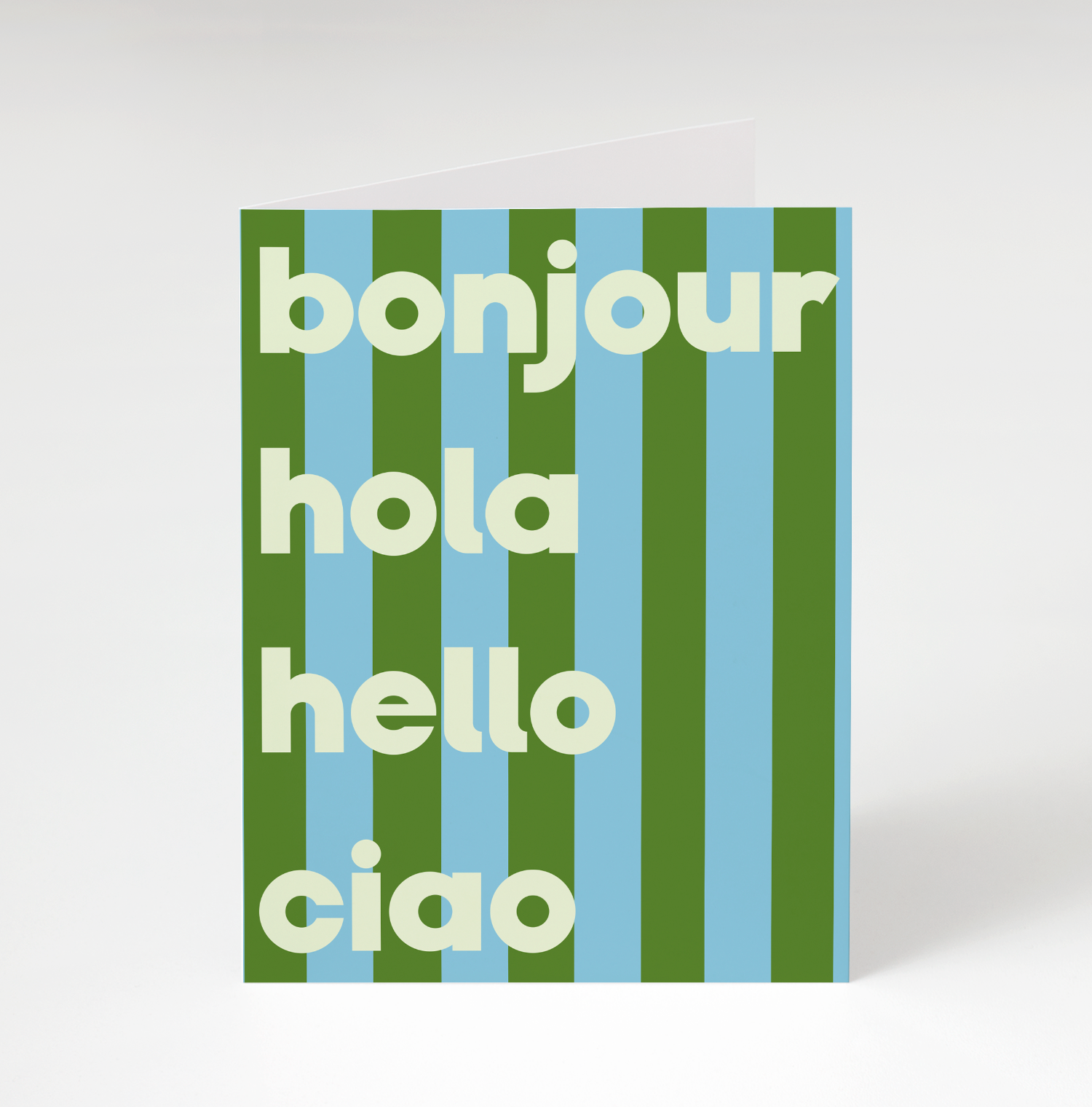 The Bonjour Hola Greeting Card in green brings a fun, multilingual twist to saying hello! Featuring bold, cream-colored text against a striking blue and green striped background, this card greets with a cheerful "bonjour, hola, hello, ciao." Perfect for any occasion, it’s a bright and stylish way to send a friendly message. Blank inside for your personal note!