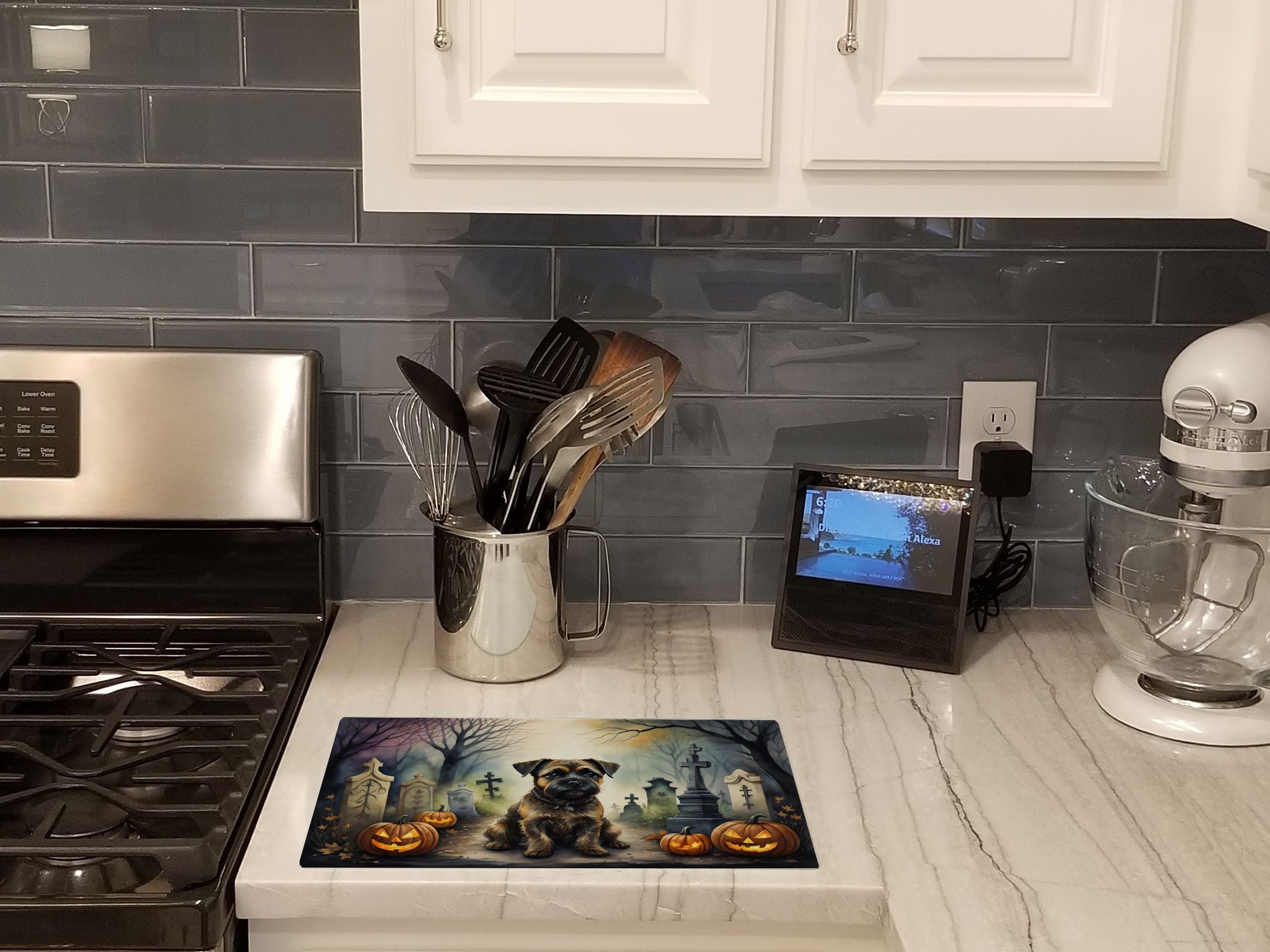 Decorate your space with our Halloween Border Terrier artwork on a Cutting Board. Introduce your kitchen to the vibrant, large Decorative Glass Cutting Board from Caroline's Treasures. Crafted from resilient tempered glass, this board is not only a utilitarian necessity but also a colorful art piece. With its generous dimensions of 15 inches in height and 12 inches in length, it offers ample space for all your cutting needs. Every piece showcases captivating artwork from distinguished artists, bringing an aesthetic edge to your kitchen. Beyond its attractive design, this cutting board ensures your countertop stays pristine and unscathed, owing to its heat-resistant properties. Engineered with user convenience in mind, it features non-skid feet for stability, and rounded corners for additional safety. Its robust construction renders it virtually unbreakable, guaranteeing longevity. The board comes with protective feet bumpers, maintaining its position during use. This product is recommended to be hand washed only. Proudly printed and assembled in the United States, this cutting board exemplifies superior craftsmanship. With Caroline's Treasures' Decorative Glass Cutting Board, you're investing in a blend of functionality and artistic flair.