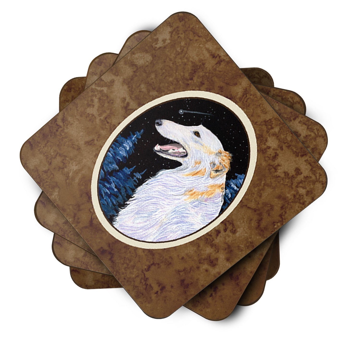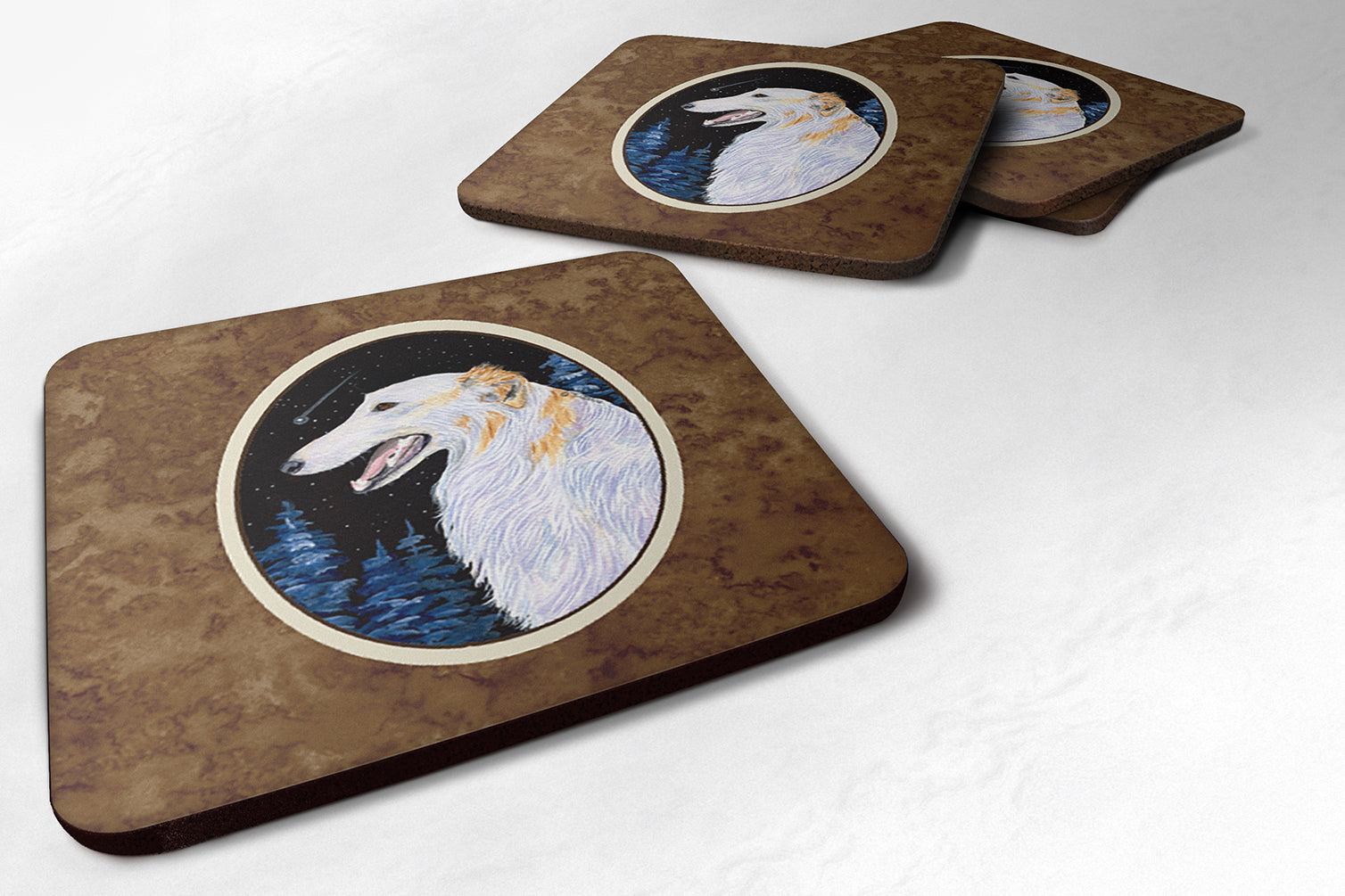 Decorate your space with our Borzoi/Russian Wolfhound artwork on a Coaster set. Presenting our Set of 4 Foam Coasters, a stylish and practical addition to your table setting. Each square coaster, measuring 3 1/2 inches by 3 1/2 inches, is perfectly sized to accommodate various drinkware, from coffee mugs to tumblers. These coasters stand out with their full-color artwork, permanently dyed onto the material for a vibrant and fade-resistant finish. They're not just functional, they're a fashionable statement, adding a touch of flair to any gathering or event. Our foam coasters serve a dual purpose - they protect your table from water stains and are perfect for both hot and cold drinks. The material used is similar to that of our high-quality mouse pads, ensuring durability and heat resistance. These coasters are easy to maintain - simply wash them in the top of your dishwasher and lay flat to dry. The design won't come off, ensuring they retain their vivid colors for years. Pair them with one of our insulated coolers or huggers for a cohesive, thoughtful gift set. Enhance your beverage experience with our Set of 4 Foam Coasters.