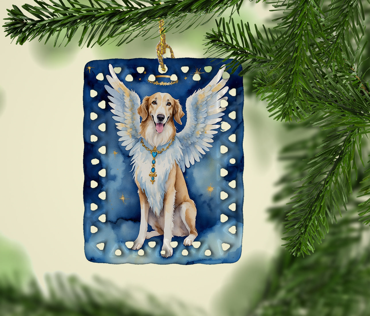 Porcelain Ornament featuring breed specific Borzoi Russian Wolfhound artwork. Celebrate Christmas with this Christmas Ornament. Add a unique, personal touch to your holiday decor with our Rectangular Lattice Porcelain Ornament. Perfect for creating cherished memories, this high-quality ornament shines under festive lights, reflecting warmth and joy throughout your Christmas tree. Crafted with a glossy finish, it showcases vibrant, full-color artwork contributed by our talented artists, ensuring your tree is adorned with a burst of color and holiday spirit. What sets this Porcelain Ornament apart is its customizable white back. Use a paint pen or permanent marker to write a heartfelt message, commemorate a special year, or mark an unforgettable date, turning this ornament into a keepsake that will be treasured for years to come. For best results, allow any personalization to dry thoroughly before handling. Each ornament comes complete with a delicate gold cord, making it easy to hang and display. Proudly made in the USA, this ornament measures 3.375 x 2.625 inches and is a thoughtful gift for pet sitters, teachers, family members, or anyone who would appreciate a little extra holiday magic. Bring style, charm, and a touch of personal meaning to your Christmas tree with this beautifully designed ornament..