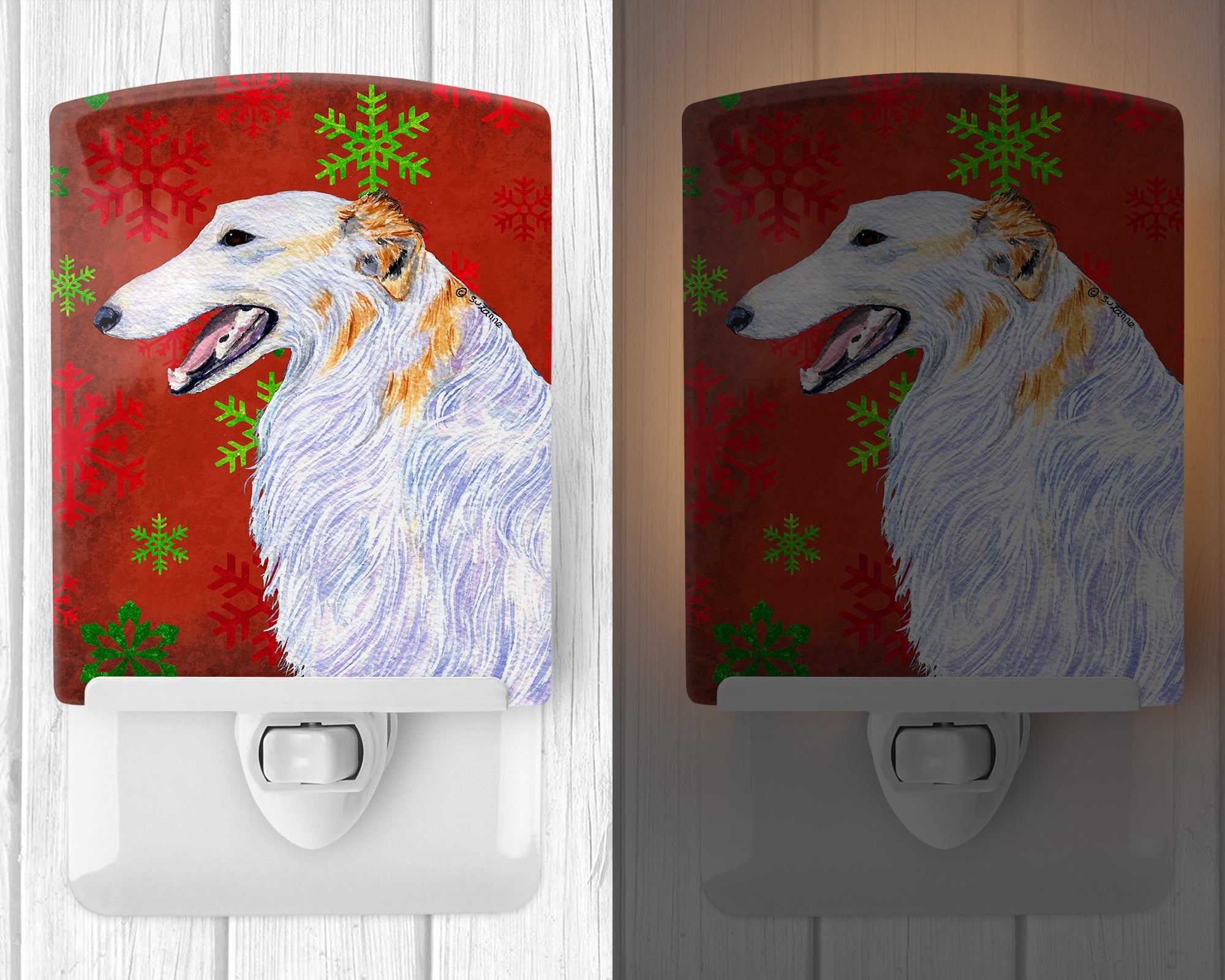 Decorate your space with our Christmas Borzoi/Russian Wolfhound artwork on a Night Light. Introduce a splash of artistic flair and subtle illumination to your space with the Decorative Ceramic Night Light from Caroline's Treasures. Perfect for any room, this night light seamlessly blends functionality with an aesthetic appeal, offering a stylish solution to brighten up dark corners of your home or office. Boasting a six-inch high by four-inch wide ceramic tile at the front, it showcases vivid, full-color artwork from distinguished artists, transforming a simple utility into a vibrant art piece. The artwork is securely encased in a robust metal holder, ensuring durability and longevity. Two screws are provided to firmly affix the tile into the holder. The holder extends three inches deep, housing an included bulb that emits a soft, welcoming glow. This product meets all safety standards, as evidenced by its UL approval. Proudly made in the United States from imported components, this Decorative Ceramic Night Light is not just a functional device; it's a statement piece that enhances the ambiance of your surroundings.