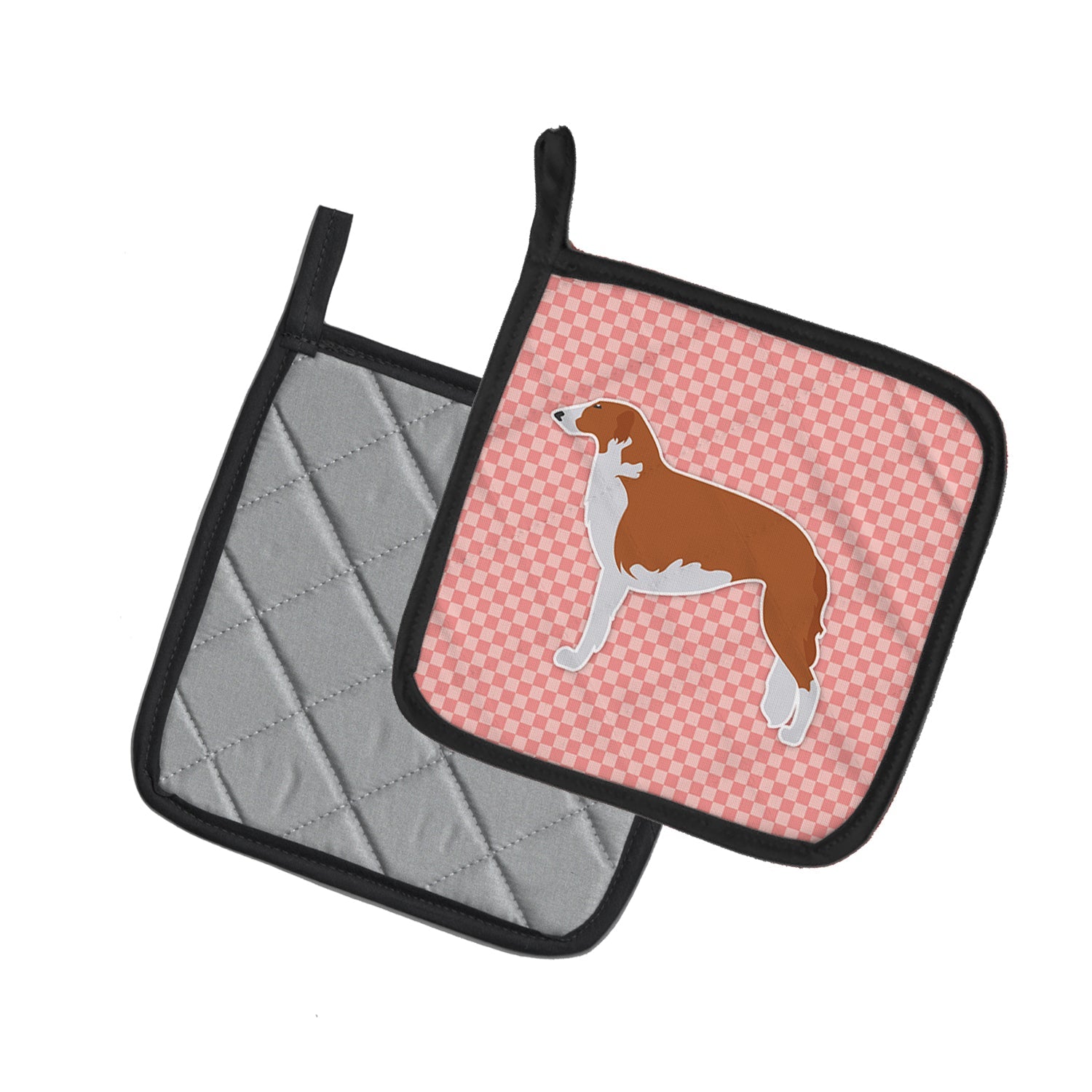 Decorate your space with our Borzoi/Russian Wolfhound artwork on a Pair of Pot Holders. A Pair of Pot Holders to match your kitchen decor. Made in the USA these are thick and functional. Full color artwork decorates the front polyester fabric of the hot pad and accented by a black trim. Use these at as a trivet for your Thanksgiving or Christmas tablescape. Filled with insulated fabric and quilted for durability. These colorful pot holders will make a great gift for your favorite home cook or executive chef. Each pot holder measures approximately 7 1/2 inches by 7 1/2 inches. A hanging tab is included.