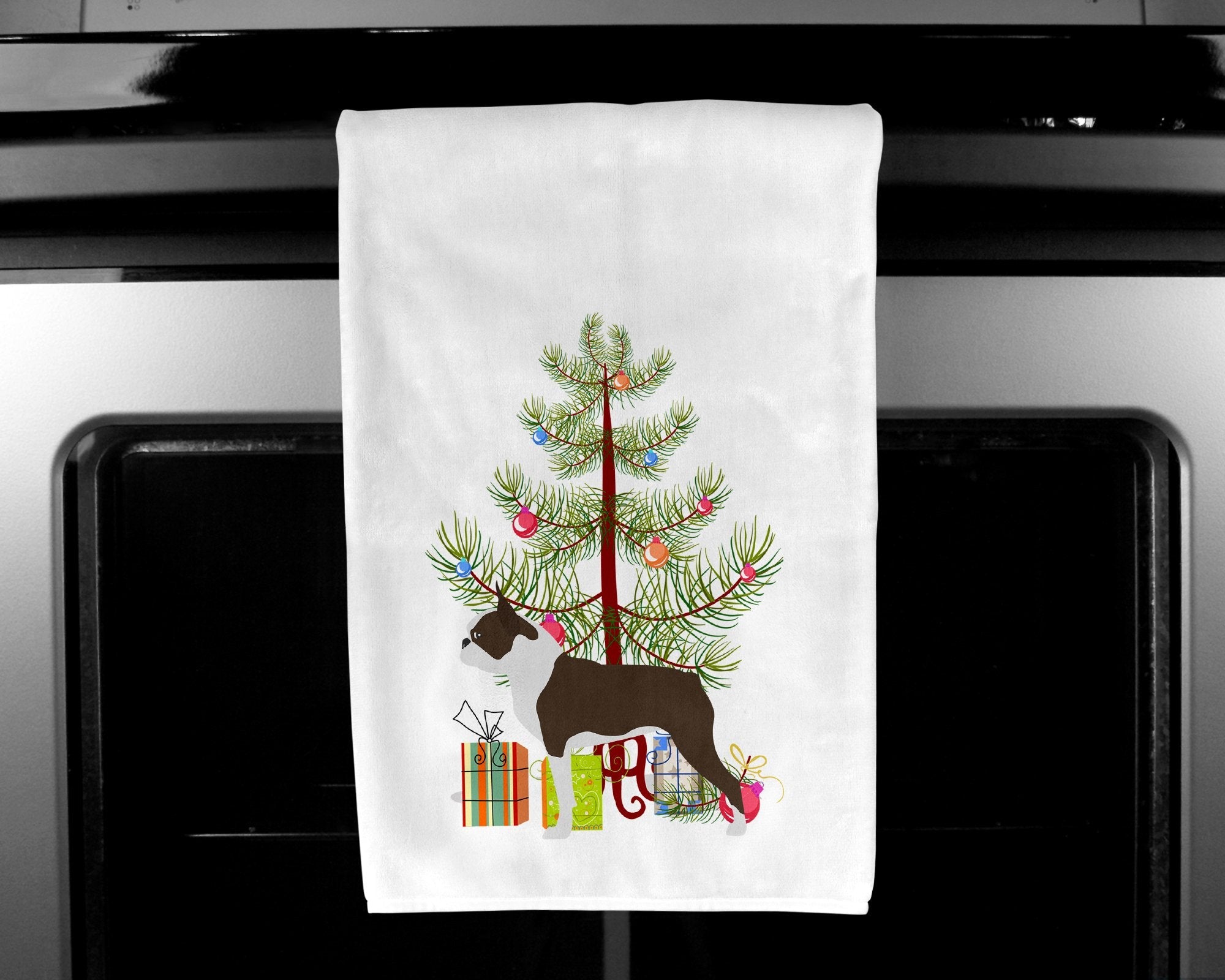 Decorate your space with our Christmas Boston Terrier artwork on a Kitchen Cotton Towels. Spruce up your kitchen decor with Caroline's Treasures Decorative White Kitchen Towel Set. This set of two dish towels showcases beautiful artwork from one of our talented artists, making them both practical and visually appealing. These towels are crafted from 100% cotton, offering excellent absorbency and durability, making them ideal for any kitchen task. Each white towel measures 19 inches by 28 inches, providing ample coverage for drying dishes or wiping up spills. The standout feature of these towels is the full-color artwork design printed on each one. They can serve as a vibrant accent in your kitchen, turning a functional item into a delightful piece of decor. When it comes to care, these towels are machine washable in cold water and can be dried on low heat. Remember to always use a pressing cloth when pressing the design, and avoid using bleach on the decorated towel. The Decorative White Kitchen Towel Set makes a great gift or a stylish addition to your own kitchen.