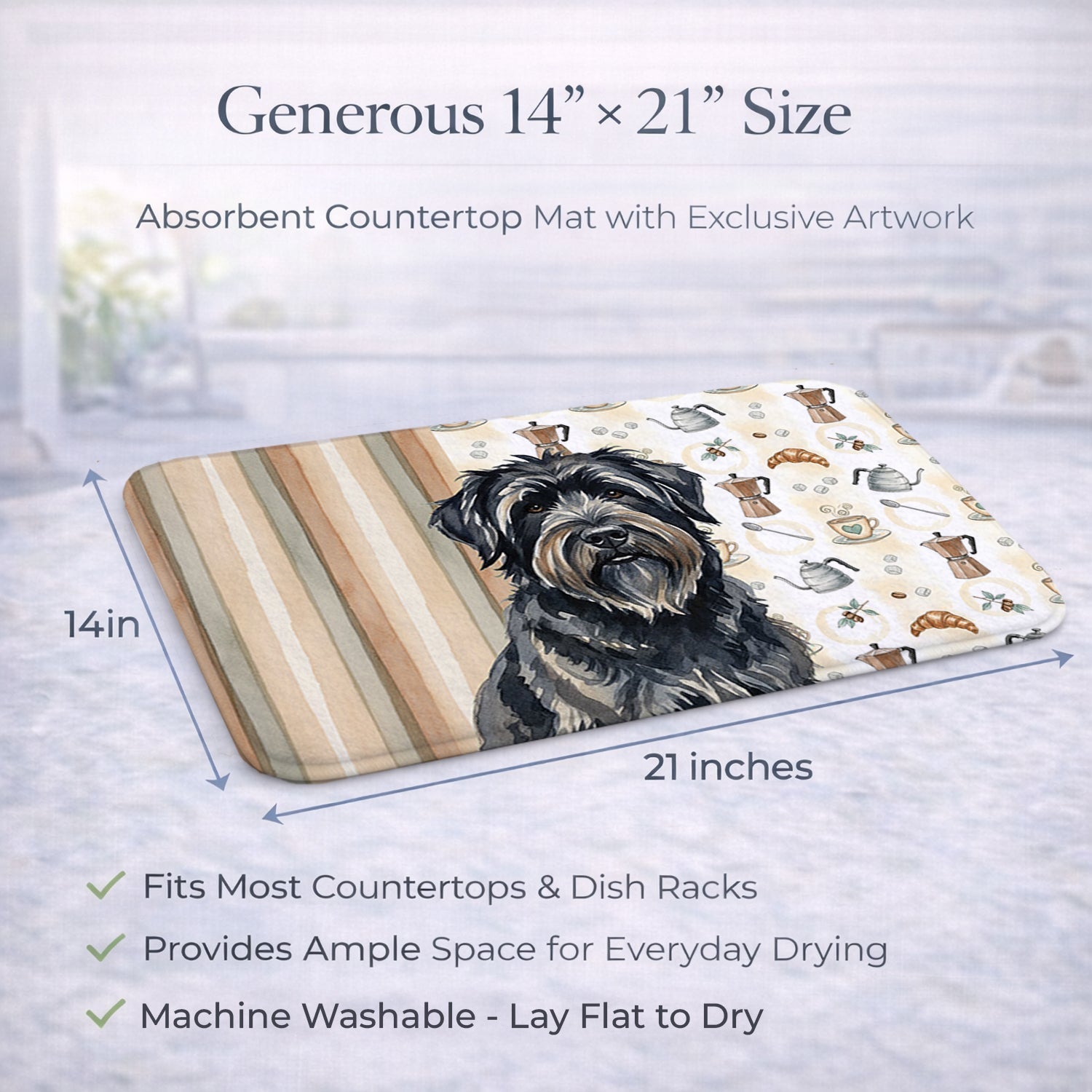 Shown here is the Bouvier des Flandres Coffee Bar Dish Drying Mat from Caroline's Treasures featuring artwork of a Bouvier des Flandres in a Everyday design. The detailed illustration and vibrant colors make it a standout accent that celebrates both seasonal style and love for the subject. This image features a cozy watercolor coffee-themed pattern with illustrated mugs, moka pots, kettles, croissants, coffee beans, and sugar cubes arranged in a repeating design. Soft neutral tones with warm browns, creams, and subtle sage accents create an inviting, café-inspired look that feels comforting and relaxed. Everyday décor celebrates personal style and the small moments that make a house feel like home. Thoughtful designs add warmth and personality that can be enjoyed year-round. Say goodbye to messy countertops and soggy dish towels with our innovative dish drying mat. Our high-quality dish drying pad is designed to keep your countertops dry while offering a stylish and efficient solution. Whether you're air drying dishes, glasses, stemware, silverware, pots, pans, bottles, or even fruits and vegetables, our dish mat is the perfect choice. The 14 inches x 21 inches size fits most counters and dish drying racks, and the non-slip design ensures stability. Made with water-absorbent polyester and a polyurethane foam insert, our dish drying mat is not only functional but also durable. It's machine washable and printed in the USA for long-lasting use. The beautiful artwork adds flair to your kitchen decor, making it a perfect housewarming gift or present for any occasion. Upgrade your kitchen experience with our absorbent and versatile dish drying mat. Perfect for: Kitchen counters and sinks, everyday dish drying and countertop protection, Dogs-themed homes, or year-round use for Bouvier des Flandres lovers. Bouviers des Flandres are powerful herding dogs known for their intelligence and protective instincts. This versatile working breed is respected for its loyalty and steady temperament. Makes a heartfelt gift for: Bouvier des Flandres owners, Dogs lovers, Everyday gifts, pet parents, friends who adore their Bouvier des Flandres, or anyone celebrating Dogs.