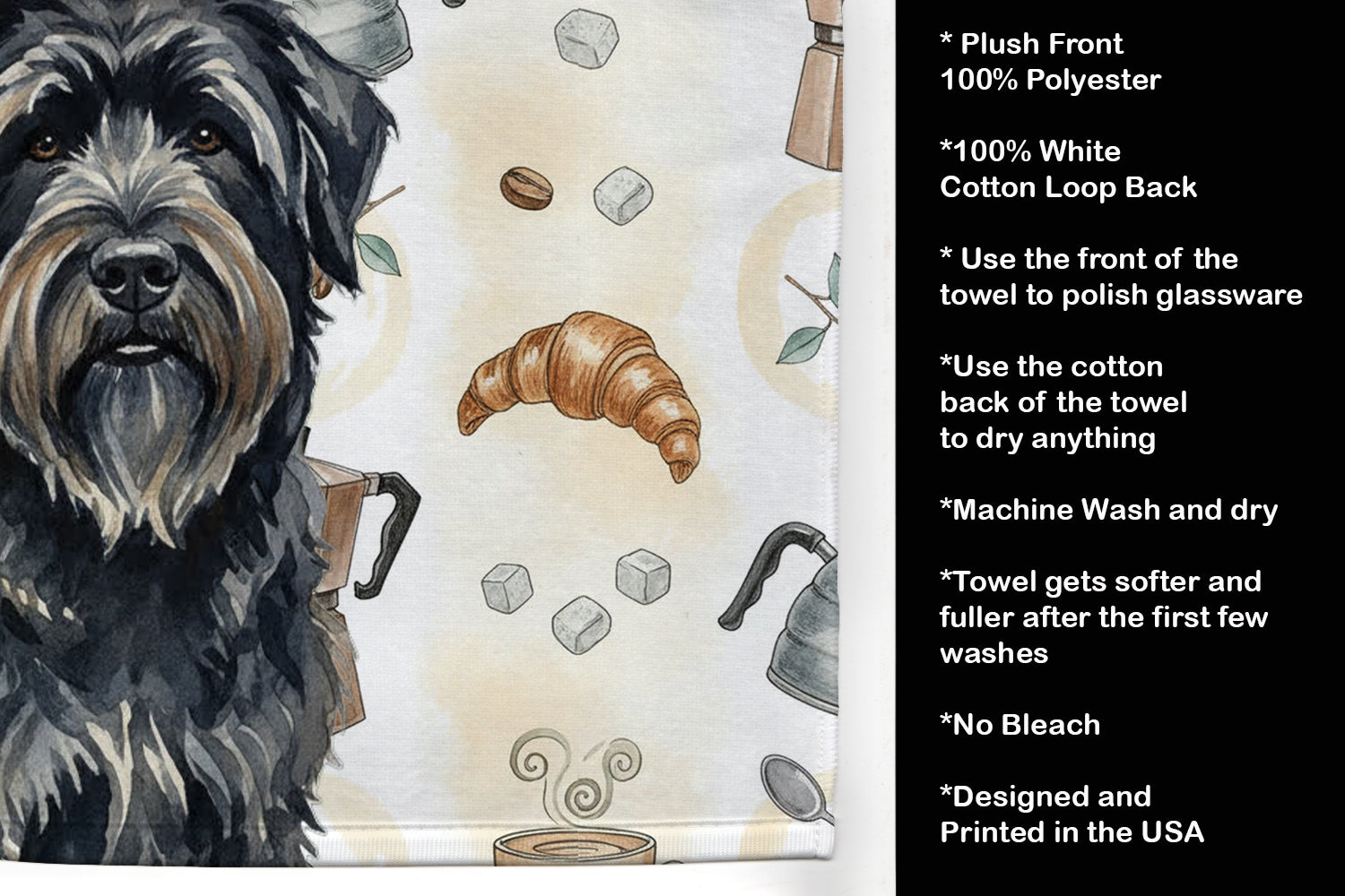 Kitchen Towel featuring breed specific Bouvier des Flandres artwork. Start your morning with charm and function thanks to our Coffee Time Kitchen Towel Collection. Featuring playful watercolor artwork of coffee pots, cups, croissants, and a dog portrait, these towels bring warmth and personality to your kitchen or bath. Crafted with a plush minky polyester front that polishes glassware to a shine, and a 100% cotton terry loop back for absorbency, they combine durability with practicality. Artwork is permanently dyed into the fibers to keep colors fresh wash after wash. Measuring 15" x 25", these machine-washable towels are finished with bound edges to hold their shape. Designed and printed in the USA, they’re perfect for kitchens, coffee bars, guest baths, or as thoughtful gifts for dog lovers and coffee enthusiasts alike.