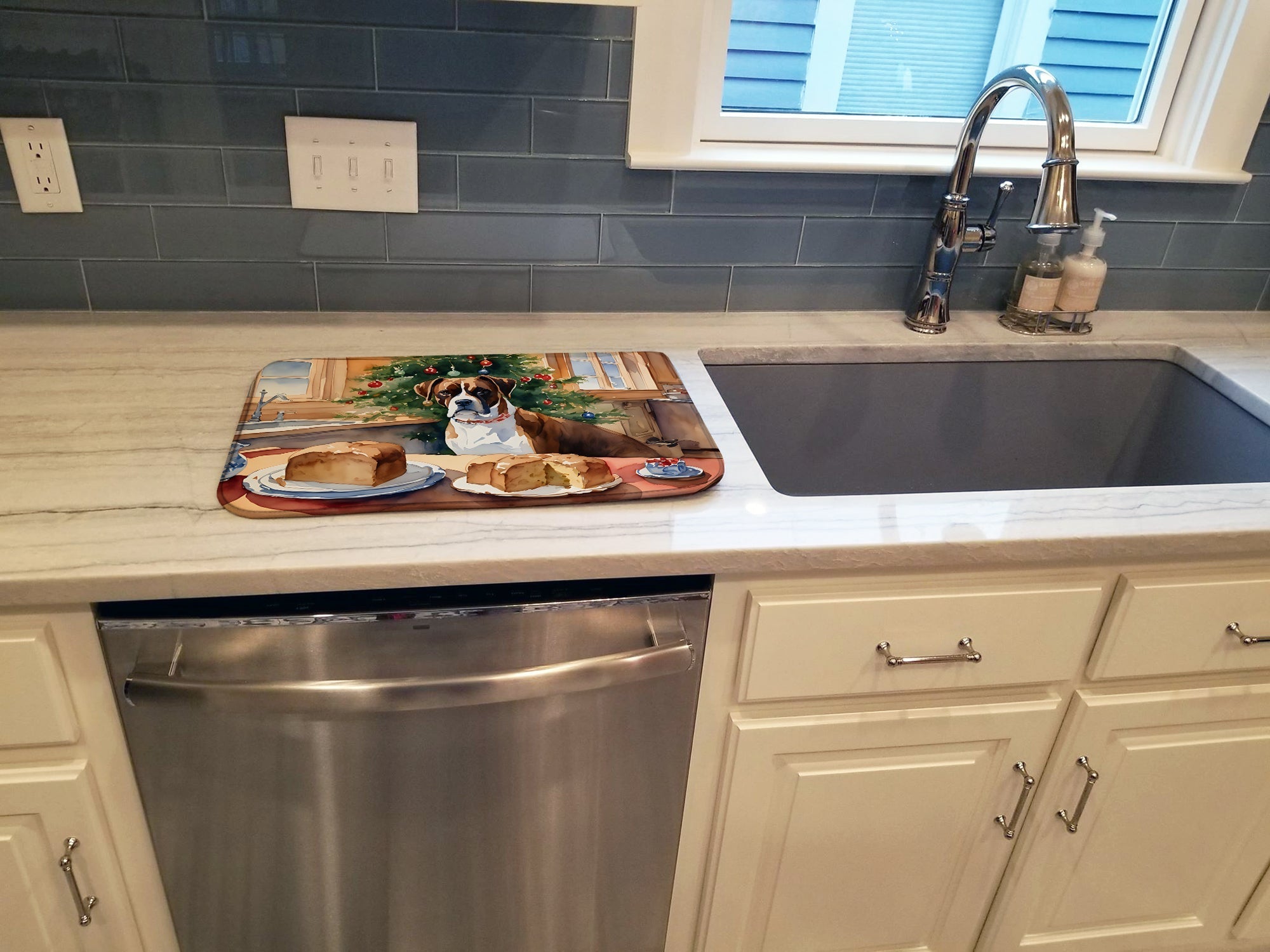 Dish Drying Mat featuring breed specific Boxer artwork. Celebrate Christmas with this Christmas Dish Drying Mat. Say goodbye to messy countertops and soggy dish towels with our innovative dish drying mat. Our high-quality dish drying pad is designed to keep your countertops dry while offering a stylish and efficient solution. Whether you're air drying dishes, glasses, stemware, silverware, pots, pans, bottles, or even fruits and vegetables, our dish mat is the perfect choice. The 14 inches x 22 inches size fits most counters and dish drying racks, and the non-slip design ensures stability. Made with water-absorbent polyester and a polyurethane foam insert, our dish drying mat is not only functional but also durable. It's machine washable and printed in the USA for long-lasting use. The beautiful artwork adds flair to your kitchen decor, making it a perfect housewarming gift or present for any occasion. Upgrade your kitchen experience with our absorbent and versatile dish drying mat.