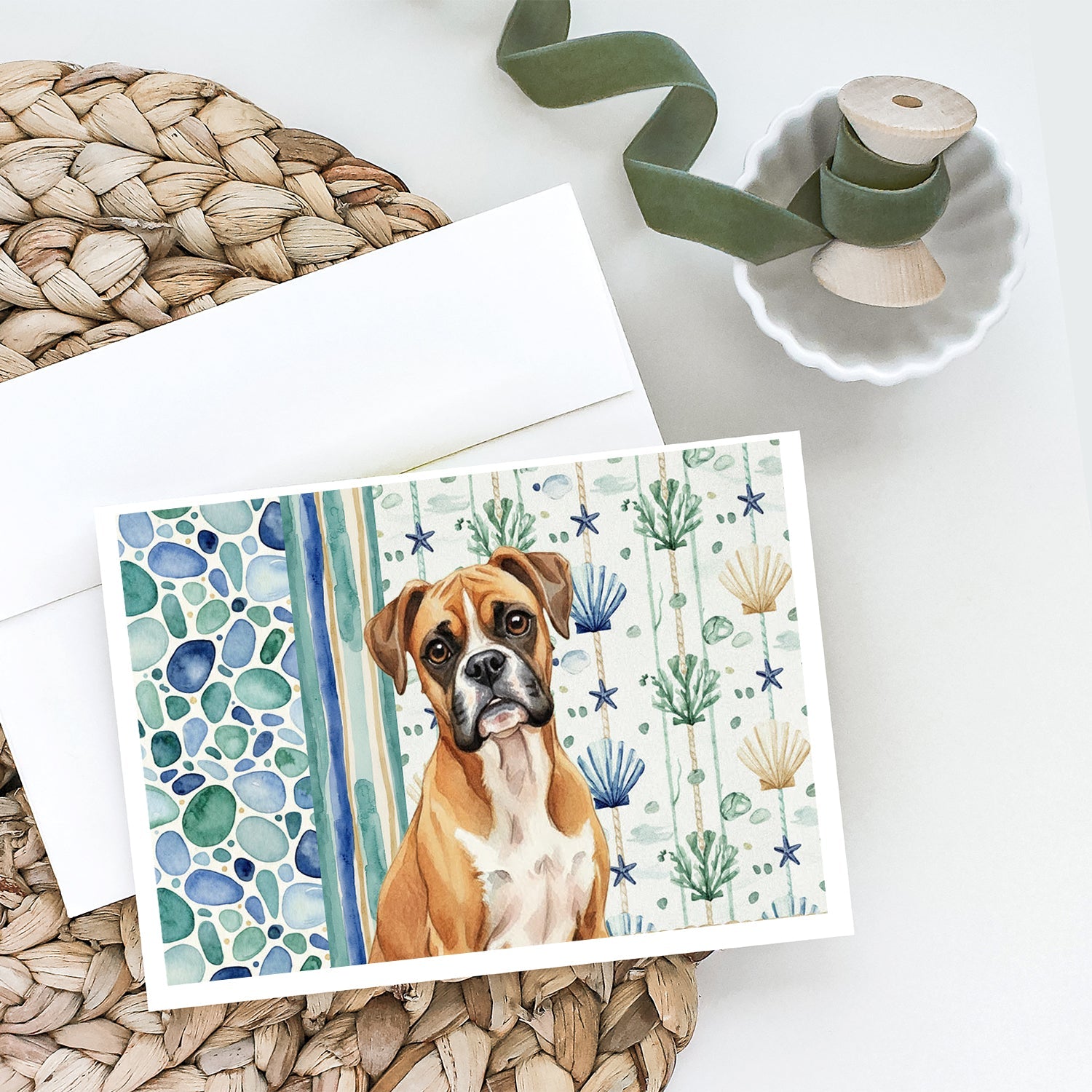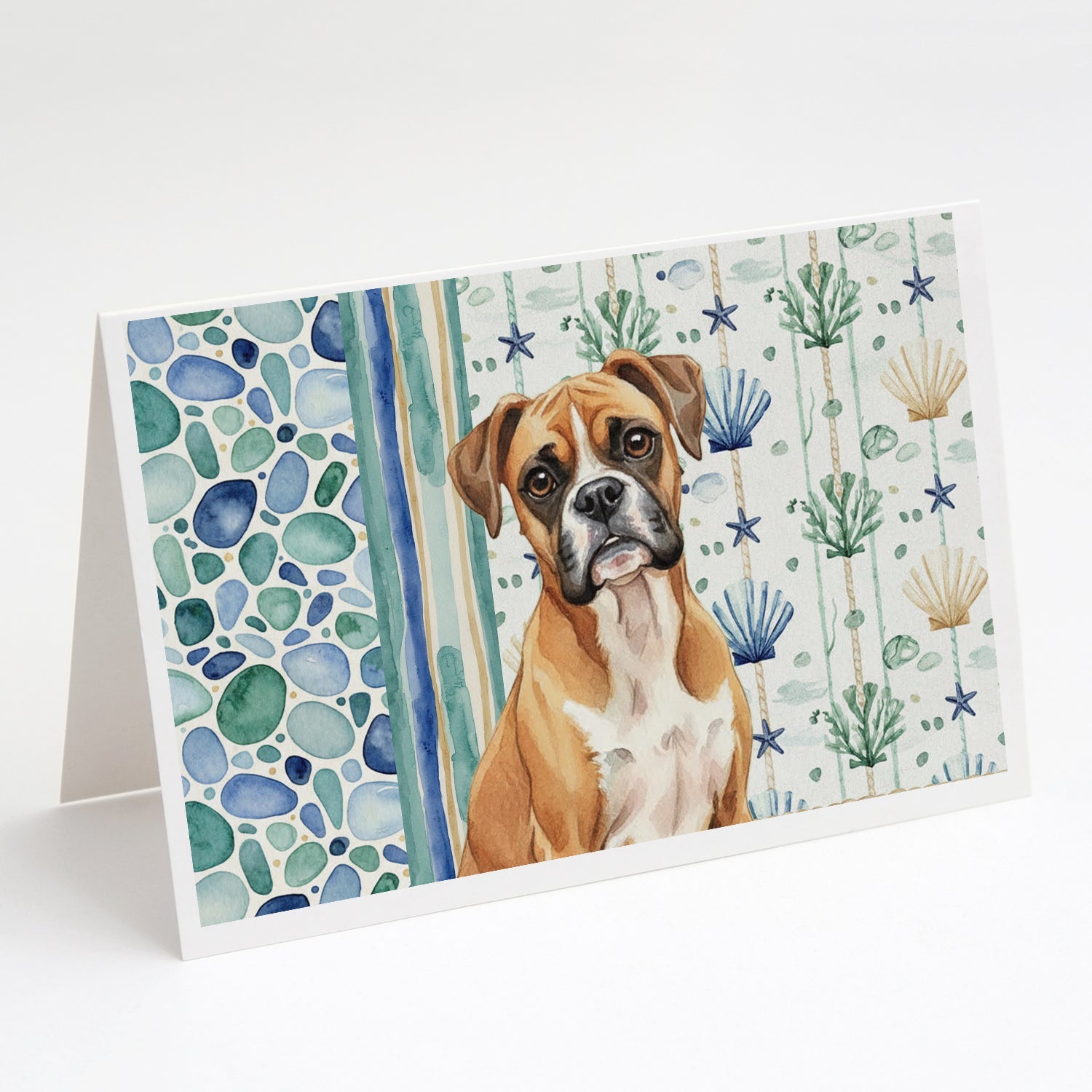 Shown here is the Boxer Coastal Sea Glass Greeting Cards Pack of 8 from Caroline's Treasures featuring artwork of a Boxer in a Everyday design. The detailed illustration and vibrant colors make it a standout accent that celebrates both seasonal style and love for the subject. This image features a calming coastal watercolor pattern with soft seashells, seaweed, starfish, and pebble-inspired accents arranged in a repeating design. The soothing palette of blues, greens, and sandy neutrals creates a relaxed, beach-inspired look that adds a fresh and tranquil feel to any space. Everyday décor celebrates personal style and the small moments that make a house feel like home. Thoughtful designs add warmth and personality that can be enjoyed year-round. Celebrate special moments with Caroline's Treasures Printed Greeting Card Pack. This pack includes eight beautifully folded 5x7 cards, accompanied by eight matching white envelopes. With blank interiors, these cards provide ample space for your personalized messages and heartfelt holiday greetings. Each card features captivating full-color artwork, meticulously printed in our facility on high-quality 80 lb cover stock or 216 GSM. The super smooth finish of the white cards enhances the visual impact of the artwork, creating a truly stunning presentation. Designed by our talented in-house artists or licensed artists, the artwork on these cards showcases their creativity and attention to detail. From vibrant illustrations to captivating designs, each card tells its own unique story. Whether it's for birthdays, anniversaries, holidays, or any special occasion, Caroline's Treasures Greeting Card Pack is the perfect way to convey your heartfelt sentiments. Share joy, love, and warm wishes with these exquisite cards and make every moment unforgettable. Perfect for: Writing personal messages, everyday correspondence, and thoughtful notes, Dogs-themed stationery collections, or year-round use for Boxer lovers. Boxers are energetic, playful dogs known for their strength and affectionate nature. This popular breed is loved for its loyalty, enthusiasm, and strong bond with families. Makes a heartfelt gift for: Boxer owners, Dogs lovers, Everyday gifts, pet parents, friends who adore their Boxer, or anyone celebrating Dogs.