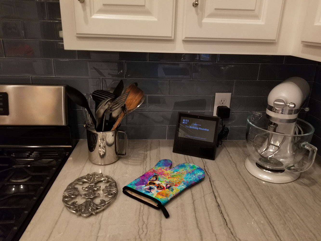 Decorate your space with our Boxer artwork on a Oven Mitt. Bring a bit of Summer into your home with a Summer Oven Mitt. Presenting our Large Right Hand Thick Heat Resistant Oven Mitt, an indispensable tool for any culinary enthusiast. This mitt boasts layers of quilted protection on both sides, providing outstanding resistance against extreme heat. Embellished with beautifully printed artwork, it adds an extra dash of charm to your kitchen decor. At about 12 inches long and 8 1/2 inches wide, this oven mitt offers a generous fit, accommodating a diverse range of hand sizes. Its design is enhanced by a sleek Black bias tape trim, finished with a convenient hoop for easy hanging. Fresh out of the packaging, the quilting process may give the mitt a stiff feel, but rest assured, it will soften with use and washing. Our mitt is crafted with a unique center fabric, Insul-Bright, a composite material made from polyester fibers, needle-punched through a nonwoven substrate and a reflective metallized film. This smart material resists both conduction and radiant energy, reflecting heat back to its source, all while remaining breathable. Our oven mitt is machine washable and safe for tumble drying. It's a perfect gift for your favorite Chef, BBQ enthusiast, or just a little treat for yourself! Experience safety, style, and convenience rolled into one with this exceptional oven mitt.