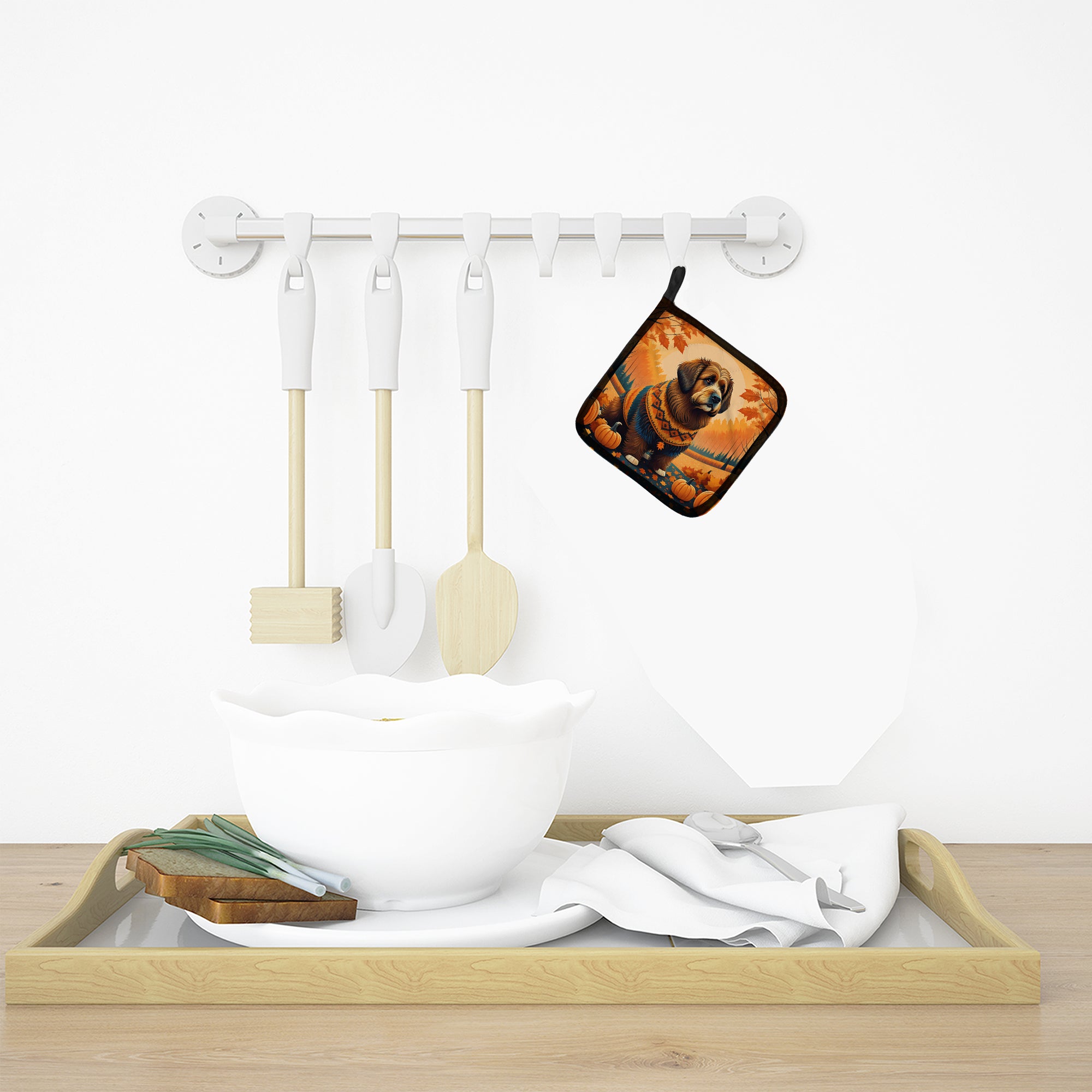 Decorate your space with our Briard artwork on a Pair of Pot Holders. Bring a bit of Fall into your home with a Fall Pair of Pot Holders. A Pair of Pot Holders to match your kitchen decor. Made in the USA these are thick and functional. Full color artwork decorates the front polyester fabric of the hot pad and accented by a black trim. Use these at as a trivet for your Thanksgiving or Christmas tablescape. Filled with insulated fabric and quilted for durability. These colorful pot holders will make a great gift for your favorite home cook or executive chef. Each pot holder measures approximately 7 1/2 inches by 7 1/2 inches. A hanging tab is included.