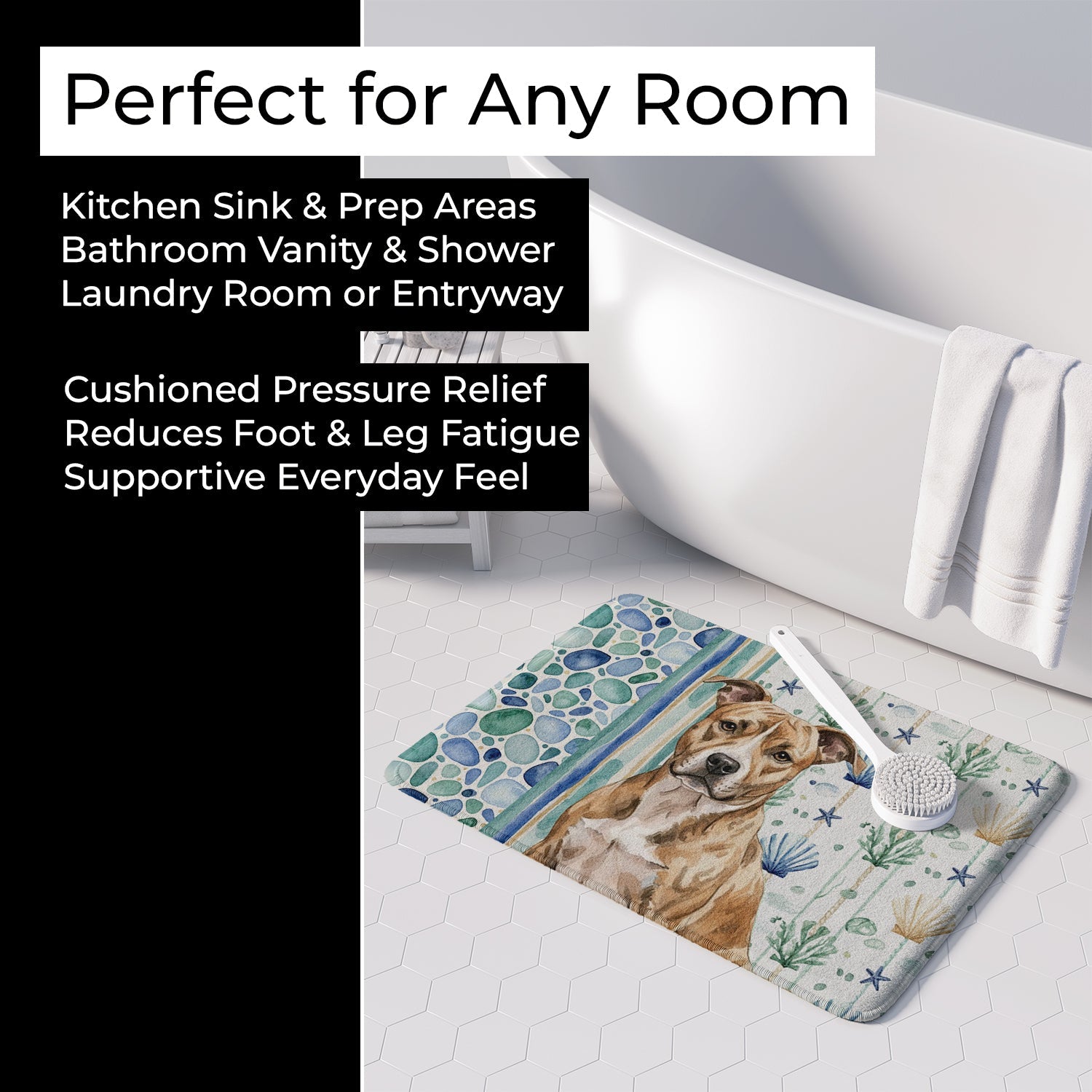 Shown here is the Brindle American Staffordshire Terrier Coastal Sea Glass Memory Foam Kitchen Mat from Caroline's Treasures featuring artwork of a American Staffordshire Terrier in a Everyday design. The detailed illustration and vibrant colors make it a standout accent that celebrates both seasonal style and love for the subject. This image features a calming coastal watercolor pattern with soft seashells, seaweed, starfish, and pebble-inspired accents arranged in a repeating design. The soothing palette of blues, greens, and sandy neutrals creates a relaxed, beach-inspired look that adds a fresh and tranquil feel to any space. Everyday décor celebrates personal style and the small moments that make a house feel like home. Thoughtful designs add warmth and personality that can be enjoyed year-round. Transform your floor into a work of art with Caroline's Treasures' Memory Foam Mat. This mat offers not only a stunning visual appeal but also a luxurious, plush feel that's incredibly comfortable to the touch. It's a versatile, machine-washable mat designed for both bath and kitchen use, ensuring you experience the best in comfort and convenience. Care Instructions: Maintaining this memory foam mat is a breeze. Simply follow the care instructions on the product tag. It's recommended to wash in cold water and dry on a low-temperature setting in the dryer. This ensures the mat retains its quality and longevity, allowing you to enjoy its beauty and comfort for a long time. Caroline's Treasures' Memory Foam Mat Machine Washable is the perfect blend of artistry, comfort, and practicality, making it a standout addition to any space. Upgrade your home decor with this versatile and stylish mat today. American Staffordshire Terriers are muscular dogs with confident posture. Their strong build reflects loyalty and courage. Makes a heartfelt gift for: American Staffordshire Terrier owners, Dogs lovers, Everyday gifts, pet parents, friends who adore their American Staffordshire Terrier, or anyone celebrating Dogs.