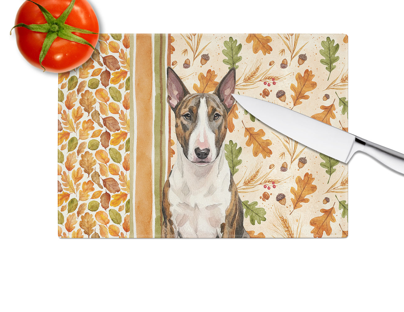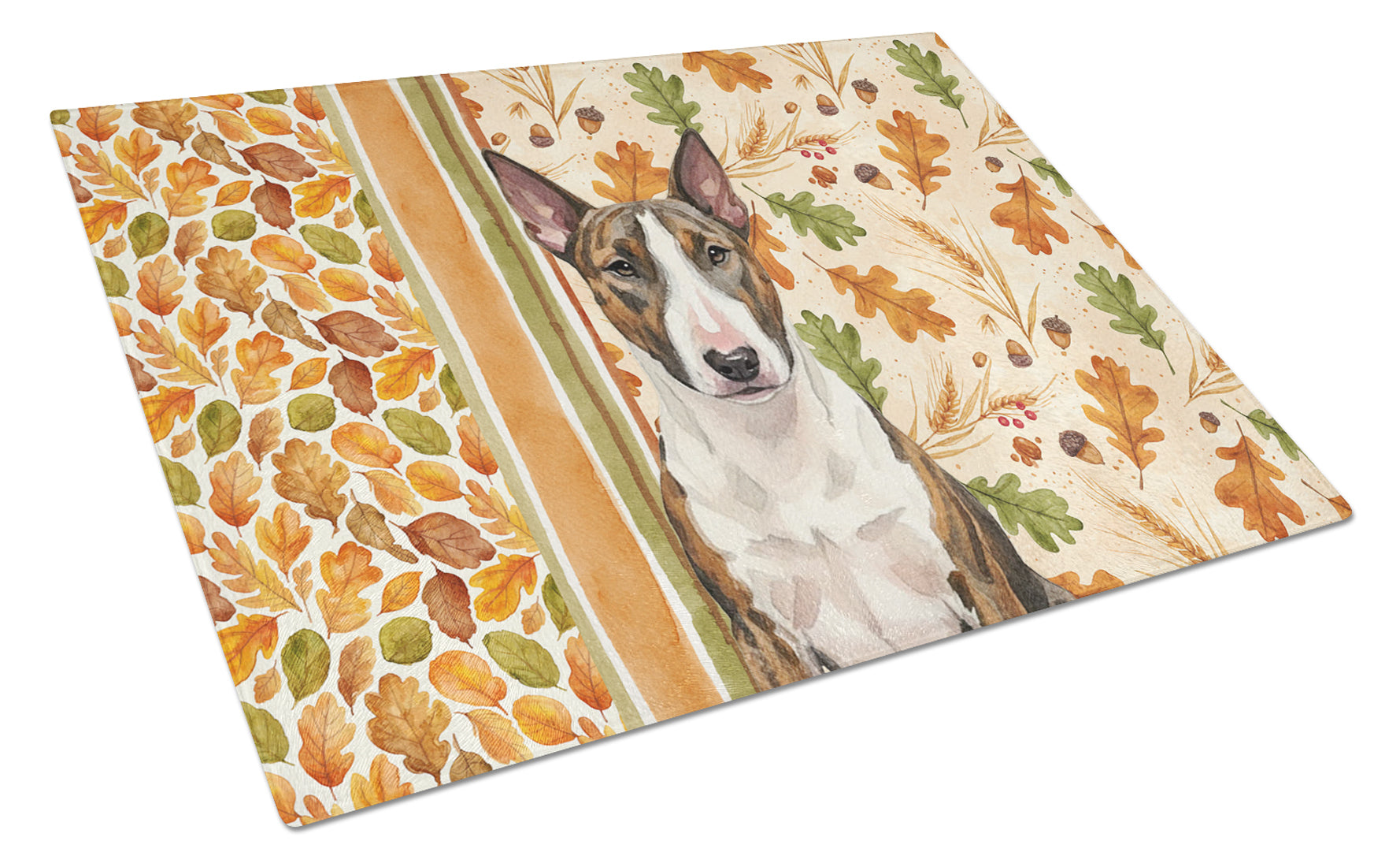 Glass Cutting Board featuring breed specific Bull Terrier artwork. Celebrate Thanksgiving with this Thanksgiving Cutting Board. Introduce your kitchen to the vibrant, large Decorative Glass Cutting Board from Caroline's Treasures. Crafted from resilient tempered glass, this board is not only a utilitarian necessity but also a colorful art piece. With its generous dimensions of 15 inches in height and 12 inches in length, it offers ample space for all your cutting needs. Every piece showcases captivating artwork from distinguished artists, bringing an aesthetic edge to your kitchen. Beyond its attractive design, this cutting board ensures your countertop stays pristine and unscathed, owing to its heat-resistant properties. Engineered with user convenience in mind, it features non-skid feet for stability, and rounded corners for additional safety. Its robust construction renders it virtually unbreakable, guaranteeing longevity. The board comes with protective feet bumpers, maintaining its position during use. This product is recommended to be hand washed only. Proudly printed and assembled in the United States, this cutting board exemplifies superior craftsmanship. With Caroline's Treasures' Decorative Glass Cutting Board, you're investing in a blend of functionality and artistic flair.