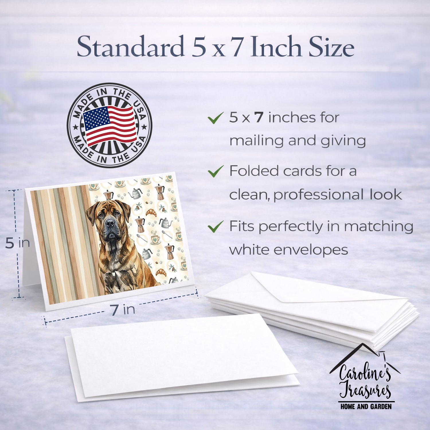 Shown here is the Brindle Boerboel Coffee Bar Greeting Cards Pack of 8 from Caroline's Treasures featuring artwork of a Boerboel in a Everyday design. The detailed illustration and vibrant colors make it a standout accent that celebrates both seasonal style and love for the subject. This image features a cozy watercolor coffee-themed pattern with illustrated mugs, moka pots, kettles, croissants, coffee beans, and sugar cubes arranged in a repeating design. Soft neutral tones with warm browns, creams, and subtle sage accents create an inviting, café-inspired look that feels comforting and relaxed. Everyday décor celebrates personal style and the small moments that make a house feel like home. Thoughtful designs add warmth and personality that can be enjoyed year-round. Celebrate special moments with Caroline's Treasures Printed Greeting Card Pack. This pack includes eight beautifully folded 5x7 cards, accompanied by eight matching white envelopes. With blank interiors, these cards provide ample space for your personalized messages and heartfelt holiday greetings. Each card features captivating full-color artwork, meticulously printed in our facility on high-quality 80 lb cover stock or 216 GSM. The super smooth finish of the white cards enhances the visual impact of the artwork, creating a truly stunning presentation. Designed by our talented in-house artists or licensed artists, the artwork on these cards showcases their creativity and attention to detail. From vibrant illustrations to captivating designs, each card tells its own unique story. Whether it's for birthdays, anniversaries, holidays, or any special occasion, Caroline's Treasures Greeting Card Pack is the perfect way to convey your heartfelt sentiments. Share joy, love, and warm wishes with these exquisite cards and make every moment unforgettable. Perfect for: Writing personal messages, everyday correspondence, and thoughtful notes, Dogs-themed stationery collections, or year-round use for Boerboel lovers. Boerboels are large guardian dogs known for their confidence, strength, and loyalty. This protective breed forms strong bonds with its family and is respected for its calm vigilance. Makes a heartfelt gift for: Boerboel owners, Dogs lovers, Everyday gifts, pet parents, friends who adore their Boerboel, or anyone celebrating Dogs.