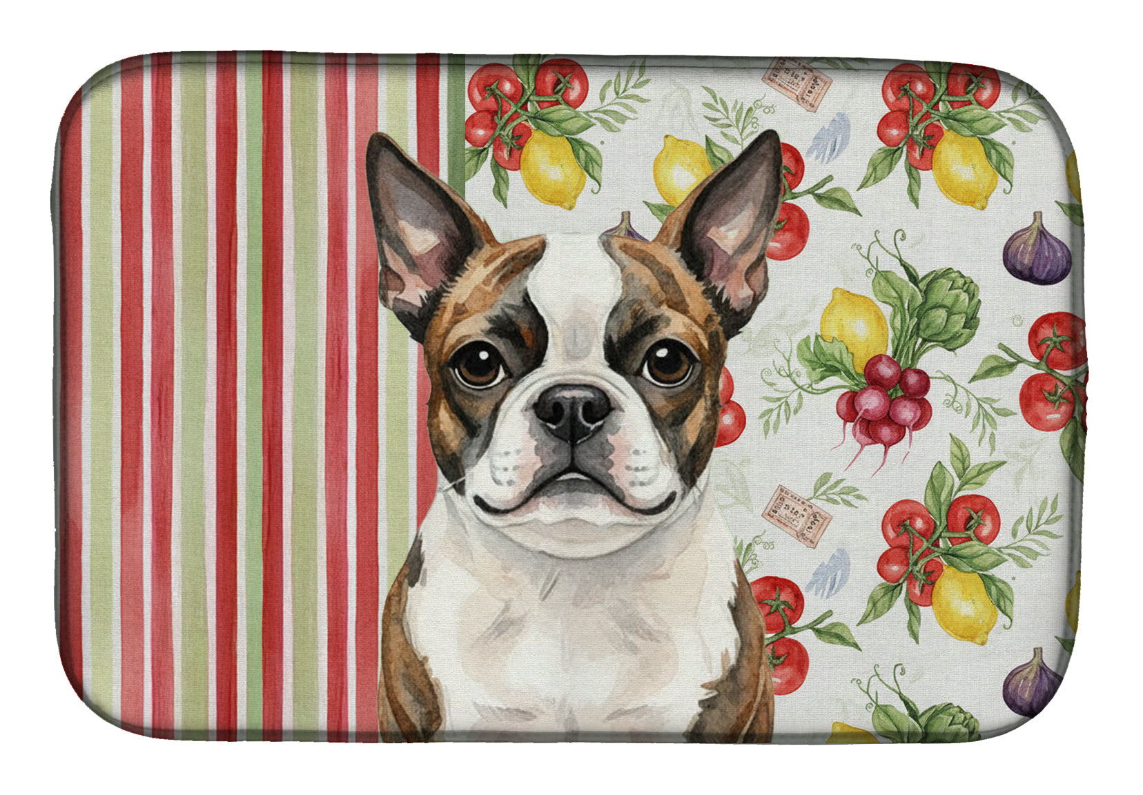 Shown here is the Brindle Boston Terrier Vegetables Dish Drying Mat from Caroline's Treasures featuring artwork of a Boston Terrier in a Everyday design. The detailed illustration and vibrant colors make it a standout accent that celebrates both seasonal style and love for the subject. This image features a vibrant watercolor vegetable pattern with tomatoes, lemons, artichokes, figs, radishes, and leafy greens arranged in a repeating design, paired with classic red and green stripes. The bright, garden-fresh palette creates a cheerful, farmhouse-inspired look that feels lively, welcoming, and perfect for kitchen décor. Everyday décor celebrates personal style and the small moments that make a house feel like home. Thoughtful designs add warmth and personality that can be enjoyed year-round. Say goodbye to messy countertops and soggy dish towels with our innovative dish drying mat. Our high-quality dish drying pad is designed to keep your countertops dry while offering a stylish and efficient solution. Whether you're air drying dishes, glasses, stemware, silverware, pots, pans, bottles, or even fruits and vegetables, our dish mat is the perfect choice. The 14 inches x 21 inches size fits most counters and dish drying racks, and the non-slip design ensures stability. Made with water-absorbent polyester and a polyurethane foam insert, our dish drying mat is not only functional but also durable. It's machine washable and printed in the USA for long-lasting use. The beautiful artwork adds flair to your kitchen decor, making it a perfect housewarming gift or present for any occasion. Upgrade your kitchen experience with our absorbent and versatile dish drying mat. Perfect for: Kitchen counters and sinks, everyday dish drying and countertop protection, Dogs-themed homes, or year-round use for Boston Terrier lovers. Boston Terriers are friendly companion dogs known for their tuxedo-like markings and cheerful personality. Often called the American Gentleman, this breed is loved for its affectionate and lively nature. Makes a heartfelt gift for: Boston Terrier owners, Dogs lovers, Everyday gifts, pet parents, friends who adore their Boston Terrier, or anyone celebrating Dogs.