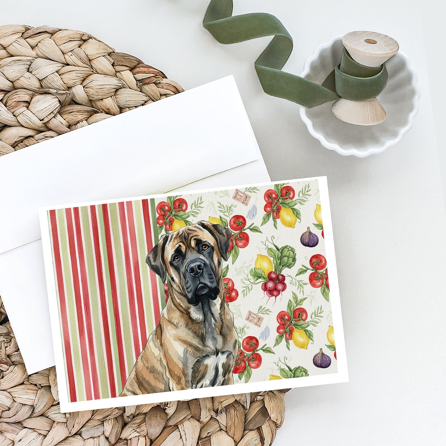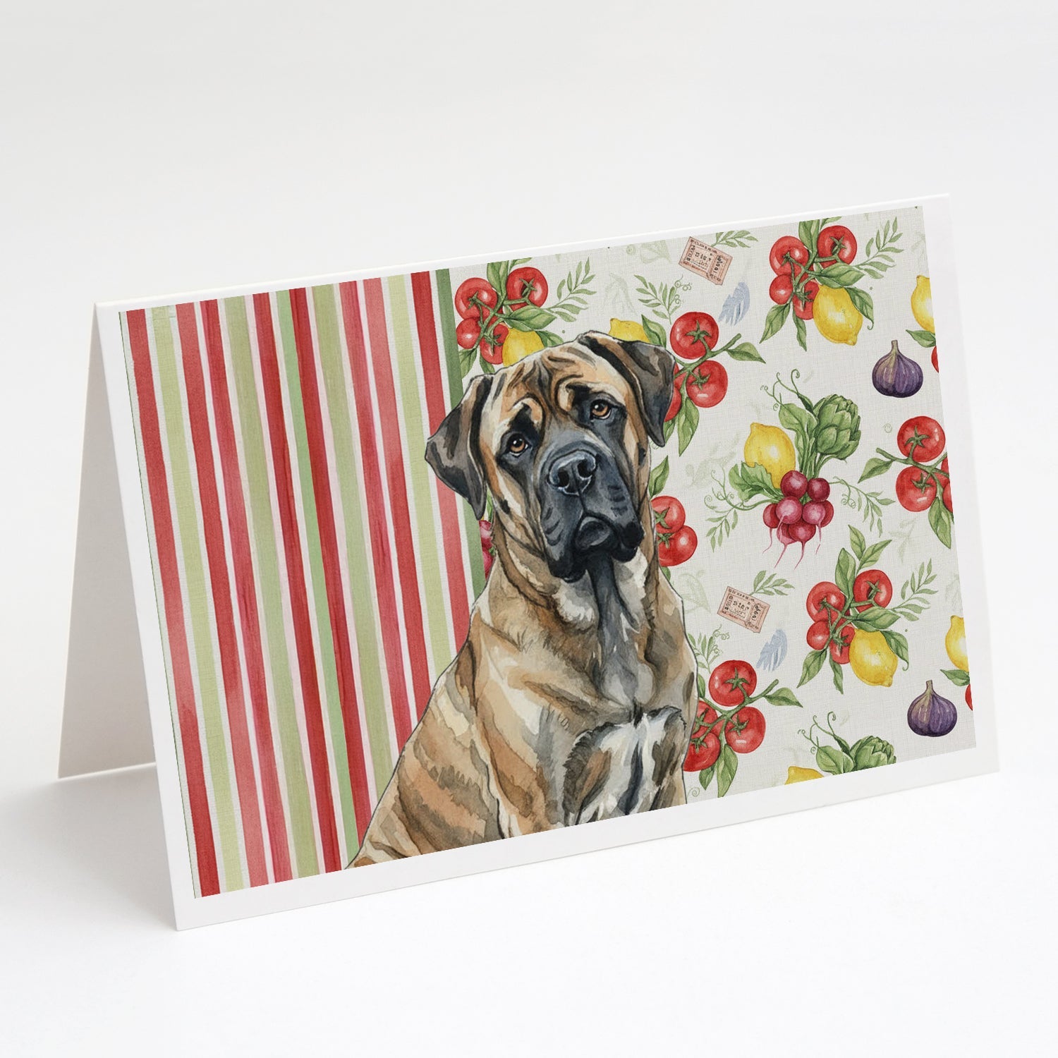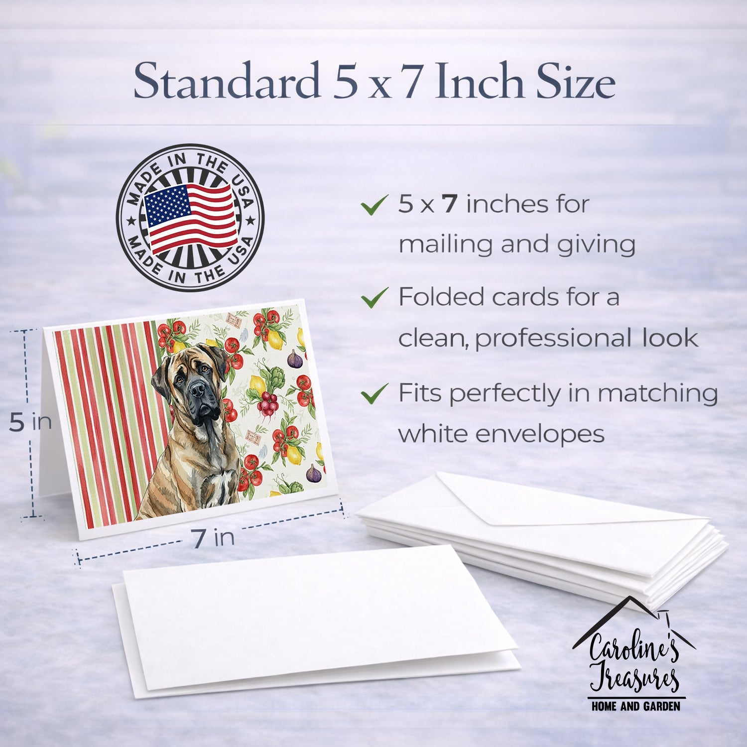 Shown here is the Brindle Mastiff Vegetables Greeting Cards Pack of 8 from Caroline's Treasures featuring artwork of a Mastiff in a Everyday design. The detailed illustration and vibrant colors make it a standout accent that celebrates both seasonal style and love for the subject. This image features a vibrant watercolor vegetable pattern with tomatoes, lemons, artichokes, figs, radishes, and leafy greens arranged in a repeating design, paired with classic red and green stripes. The bright, garden-fresh palette creates a cheerful, farmhouse-inspired look that feels lively, welcoming, and perfect for kitchen décor. Everyday décor celebrates personal style and the small moments that make a house feel like home. Thoughtful designs add warmth and personality that can be enjoyed year-round. Celebrate special moments with Caroline's Treasures Printed Greeting Card Pack. This pack includes eight beautifully folded 5x7 cards, accompanied by eight matching white envelopes. With blank interiors, these cards provide ample space for your personalized messages and heartfelt holiday greetings. Each card features captivating full-color artwork, meticulously printed in our facility on high-quality 80 lb cover stock or 216 GSM. The super smooth finish of the white cards enhances the visual impact of the artwork, creating a truly stunning presentation. Designed by our talented in-house artists or licensed artists, the artwork on these cards showcases their creativity and attention to detail. From vibrant illustrations to captivating designs, each card tells its own unique story. Whether it's for birthdays, anniversaries, holidays, or any special occasion, Caroline's Treasures Greeting Card Pack is the perfect way to convey your heartfelt sentiments. Share joy, love, and warm wishes with these exquisite cards and make every moment unforgettable. Perfect for: Writing personal messages, everyday correspondence, and thoughtful notes, Dogs-themed stationery collections, or year-round use for Mastiff lovers. Mastiffs are massive guardian dogs known for their calm temperament and protective instincts. This ancient breed is respected for its loyalty, patience, and steady presence. Makes a heartfelt gift for: Mastiff owners, Dogs lovers, Everyday gifts, pet parents, friends who adore their Mastiff, or anyone celebrating Dogs.