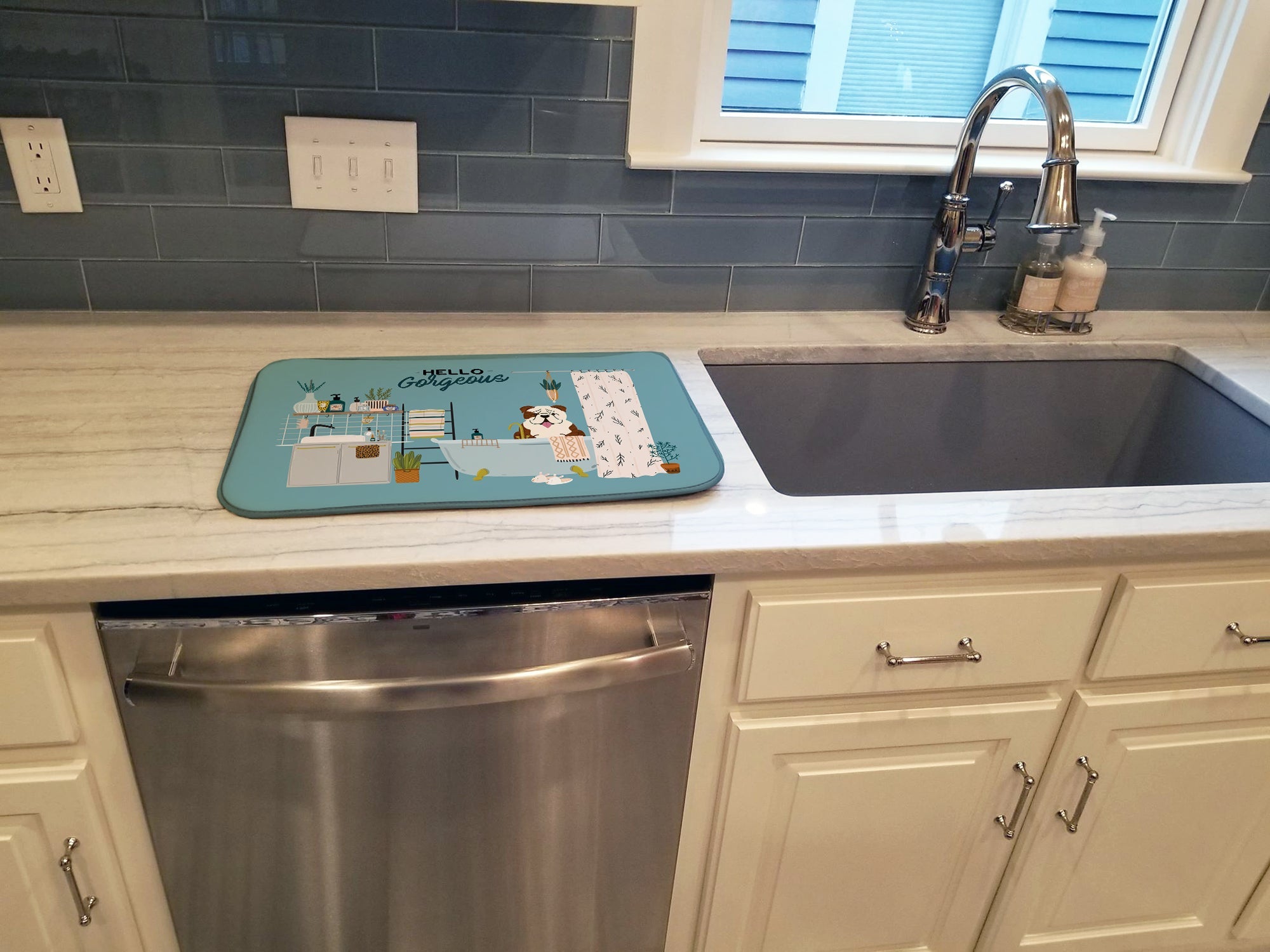 Decorate your space with our Bulldog, English Bulldog artwork on a Dish Drying Mat. Say goodbye to messy countertops and soggy dish towels with our innovative dish drying mat. Our high-quality dish drying pad is designed to keep your countertops dry while offering a stylish and efficient solution. Whether you're air drying dishes, glasses, stemware, silverware, pots, pans, bottles, or even fruits and vegetables, our dish mat is the perfect choice. The 14 inches x 22 inches size fits most counters and dish drying racks, and the non-slip design ensures stability. Made with water-absorbent polyester and a polyurethane foam insert, our dish drying mat is not only functional but also durable. It's machine washable and printed in the USA for long-lasting use. The beautiful artwork adds flair to your kitchen decor, making it a perfect housewarming gift or present for any occasion. Upgrade your kitchen experience with our absorbent and versatile dish drying mat.