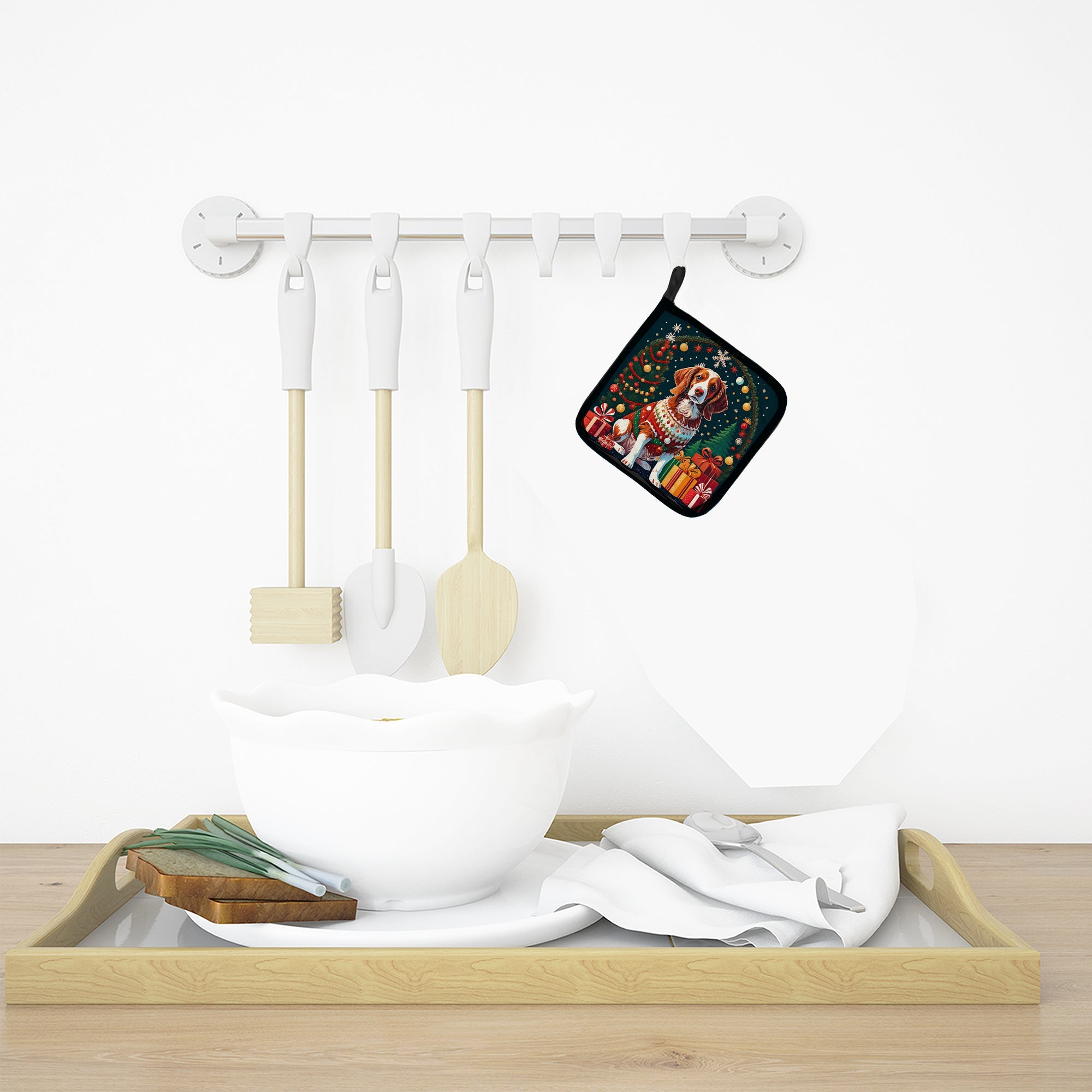 Decorate your space with our Christmas Brittany Spaniel artwork on a Pair of Pot Holders. A Pair of Pot Holders to match your kitchen decor. Made in the USA these are thick and functional. Full color artwork decorates the front polyester fabric of the hot pad and accented by a black trim. Use these at as a trivet for your Thanksgiving or Christmas tablescape. Filled with insulated fabric and quilted for durability. These colorful pot holders will make a great gift for your favorite home cook or executive chef. Each pot holder measures approximately 7 1/2 inches by 7 1/2 inches. A hanging tab is included.