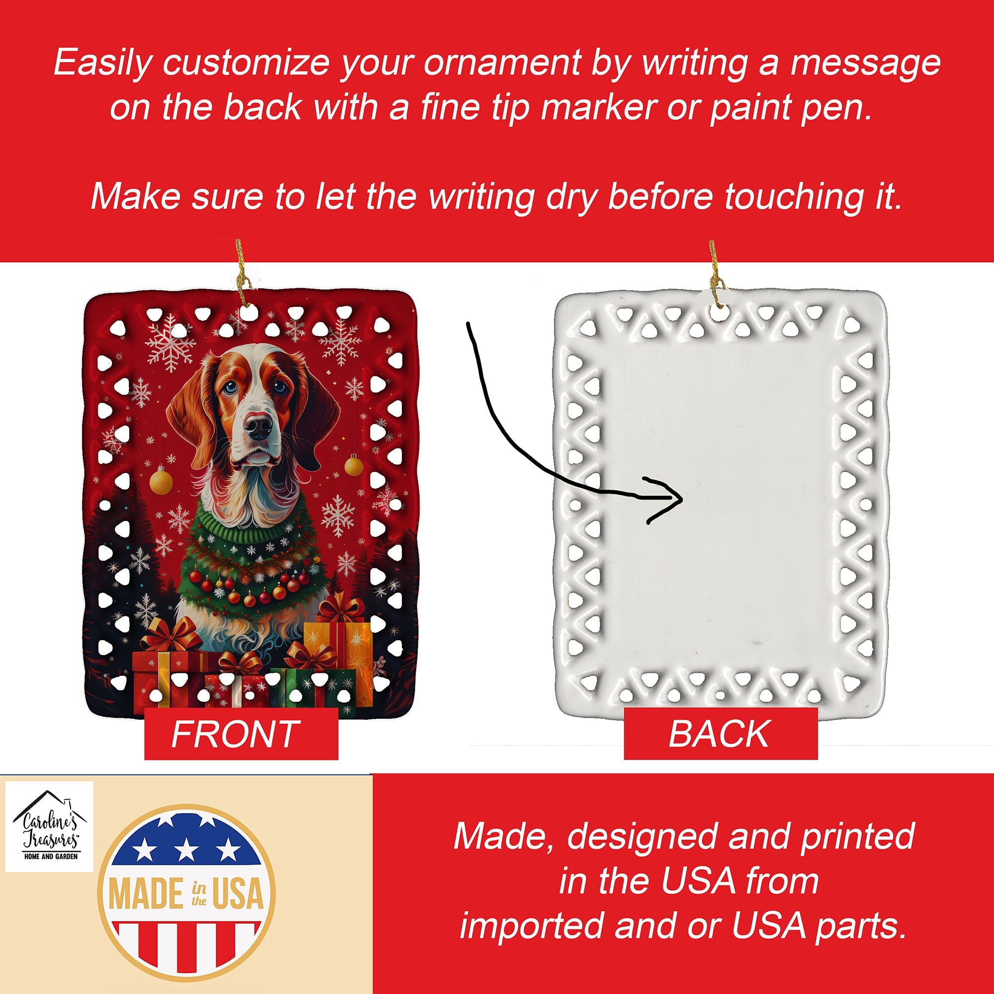 Porcelain Ornament featuring breed specific Brittany artwork. Celebrate Christmas with this Christmas Ornament. Add a unique, personal touch to your holiday decor with our Rectangular Lattice Porcelain Ornament. Perfect for creating cherished memories, this high-quality ornament shines under festive lights, reflecting warmth and joy throughout your Christmas tree. Crafted with a glossy finish, it showcases vibrant, full-color artwork contributed by our talented artists, ensuring your tree is adorned with a burst of color and holiday spirit. What sets this Porcelain Ornament apart is its customizable white back. Use a paint pen or permanent marker to write a heartfelt message, commemorate a special year, or mark an unforgettable date, turning this ornament into a keepsake that will be treasured for years to come. For best results, allow any personalization to dry thoroughly before handling. Each ornament comes complete with a delicate gold cord, making it easy to hang and display. Proudly made in the USA, this ornament measures 3.375 x 2.625 inches and is a thoughtful gift for pet sitters, teachers, family members, or anyone who would appreciate a little extra holiday magic. Bring style, charm, and a touch of personal meaning to your Christmas tree with this beautifully designed ornament..