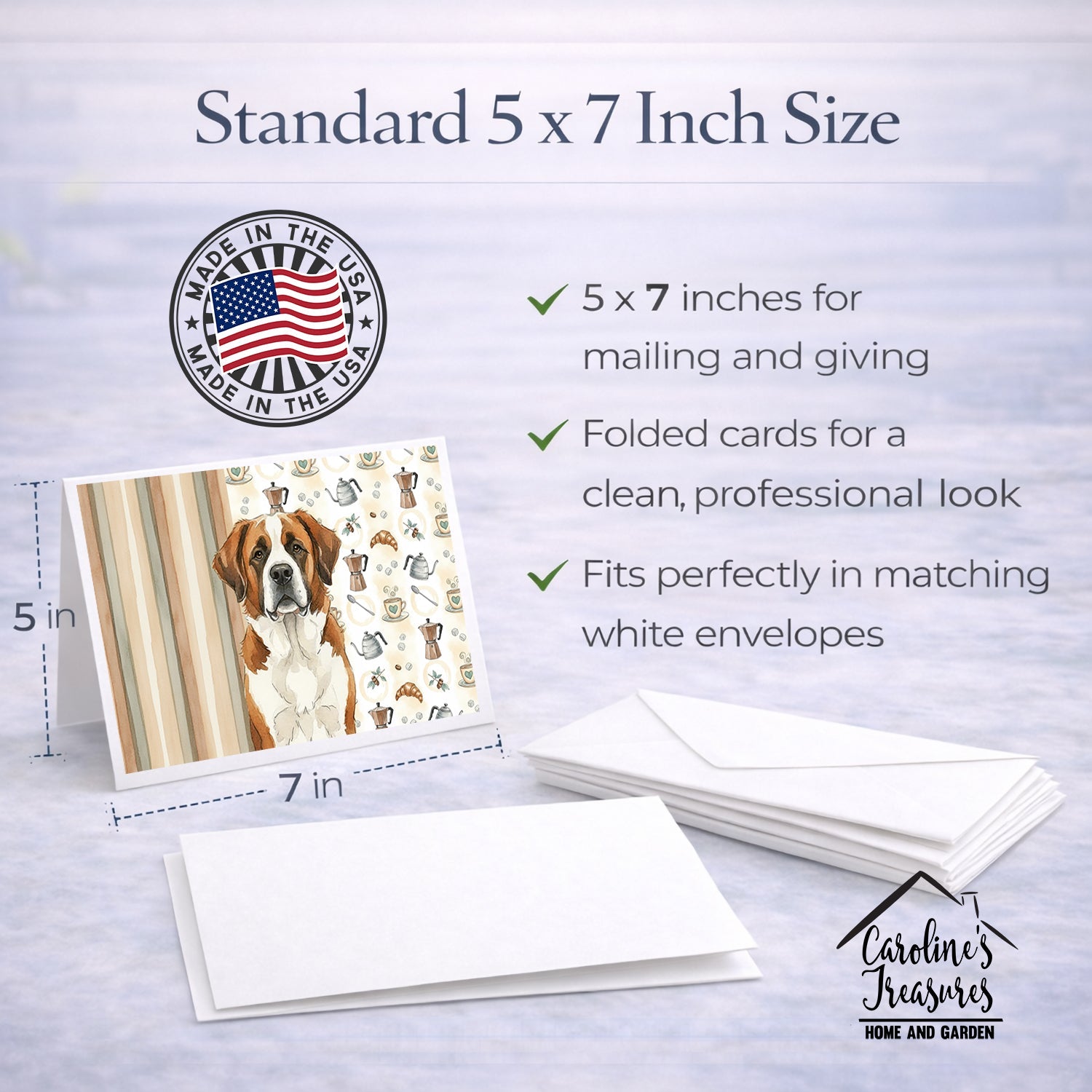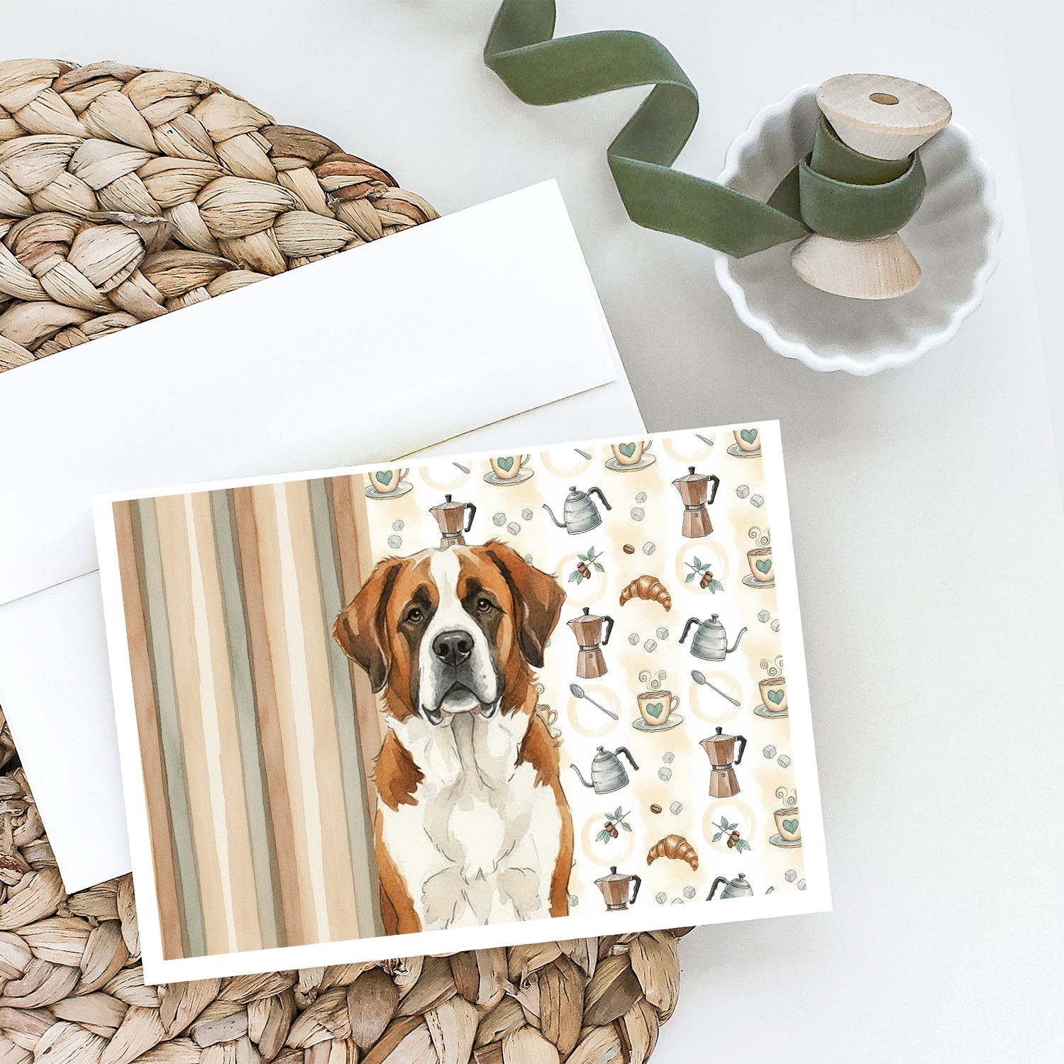 Shown here is the Brown and White Saint Bernard Coffee Bar Greeting Cards Pack of 8 from Caroline's Treasures featuring artwork of a Saint Bernard in a Everyday design. The detailed illustration and vibrant colors make it a standout accent that celebrates both seasonal style and love for the subject. This image features a cozy watercolor coffee-themed pattern with illustrated mugs, moka pots, kettles, croissants, coffee beans, and sugar cubes arranged in a repeating design. Soft neutral tones with warm browns, creams, and subtle sage accents create an inviting, café-inspired look that feels comforting and relaxed. Everyday décor celebrates personal style and the small moments that make a house feel like home. Thoughtful designs add warmth and personality that can be enjoyed year-round. Celebrate special moments with Caroline's Treasures Printed Greeting Card Pack. This pack includes eight beautifully folded 5x7 cards, accompanied by eight matching white envelopes. With blank interiors, these cards provide ample space for your personalized messages and heartfelt holiday greetings. Each card features captivating full-color artwork, meticulously printed in our facility on high-quality 80 lb cover stock or 216 GSM. The super smooth finish of the white cards enhances the visual impact of the artwork, creating a truly stunning presentation. Designed by our talented in-house artists or licensed artists, the artwork on these cards showcases their creativity and attention to detail. From vibrant illustrations to captivating designs, each card tells its own unique story. Whether it's for birthdays, anniversaries, holidays, or any special occasion, Caroline's Treasures Greeting Card Pack is the perfect way to convey your heartfelt sentiments. Share joy, love, and warm wishes with these exquisite cards and make every moment unforgettable. Perfect for: Writing personal messages, everyday correspondence, and thoughtful notes, Dogs-themed stationery collections, or year-round use for Saint Bernard lovers. Saint Bernards are giant working dogs known for their gentle temperament and strength. This iconic breed is admired for its patience, loyalty, and calm, friendly presence. Makes a heartfelt gift for: Saint Bernard owners, Dogs lovers, Everyday gifts, pet parents, friends who adore their Saint Bernard, or anyone celebrating Dogs.