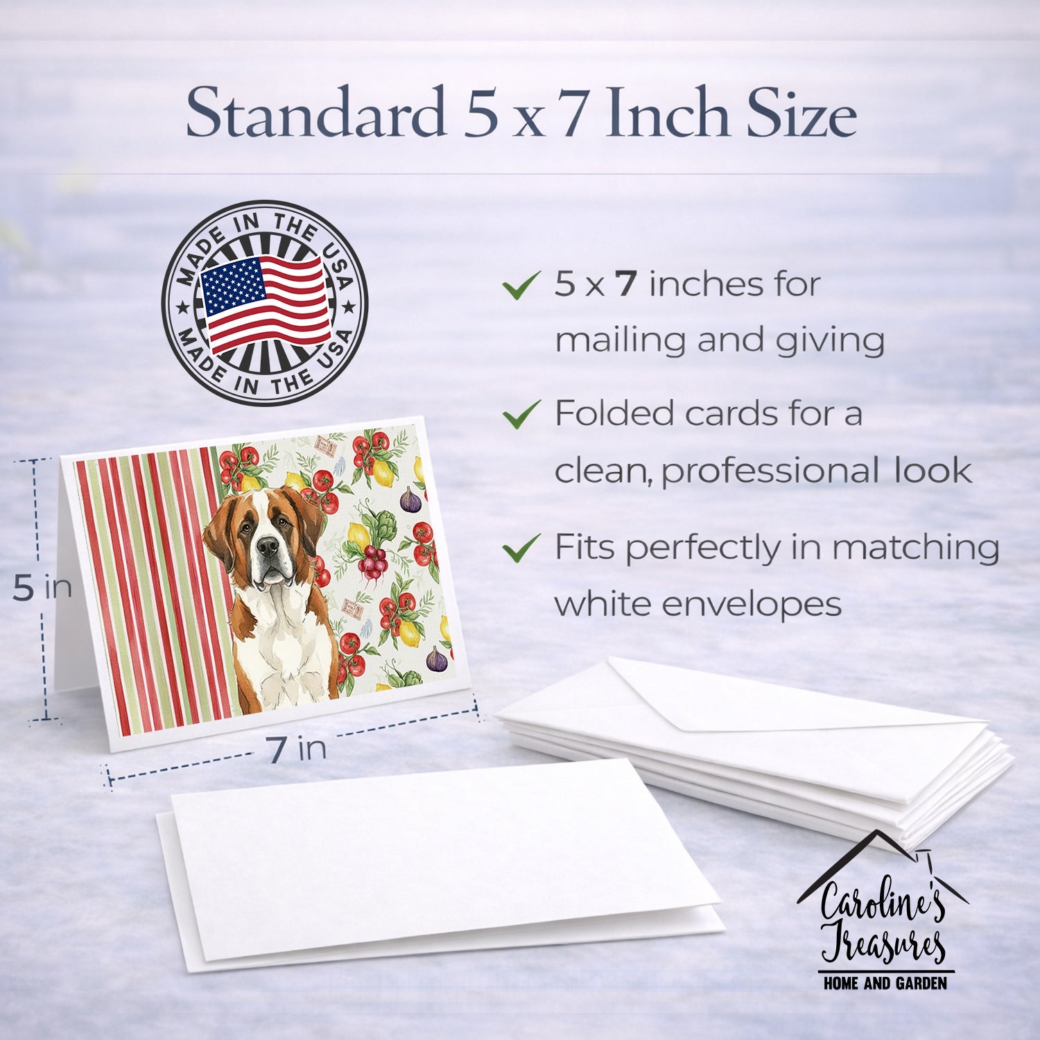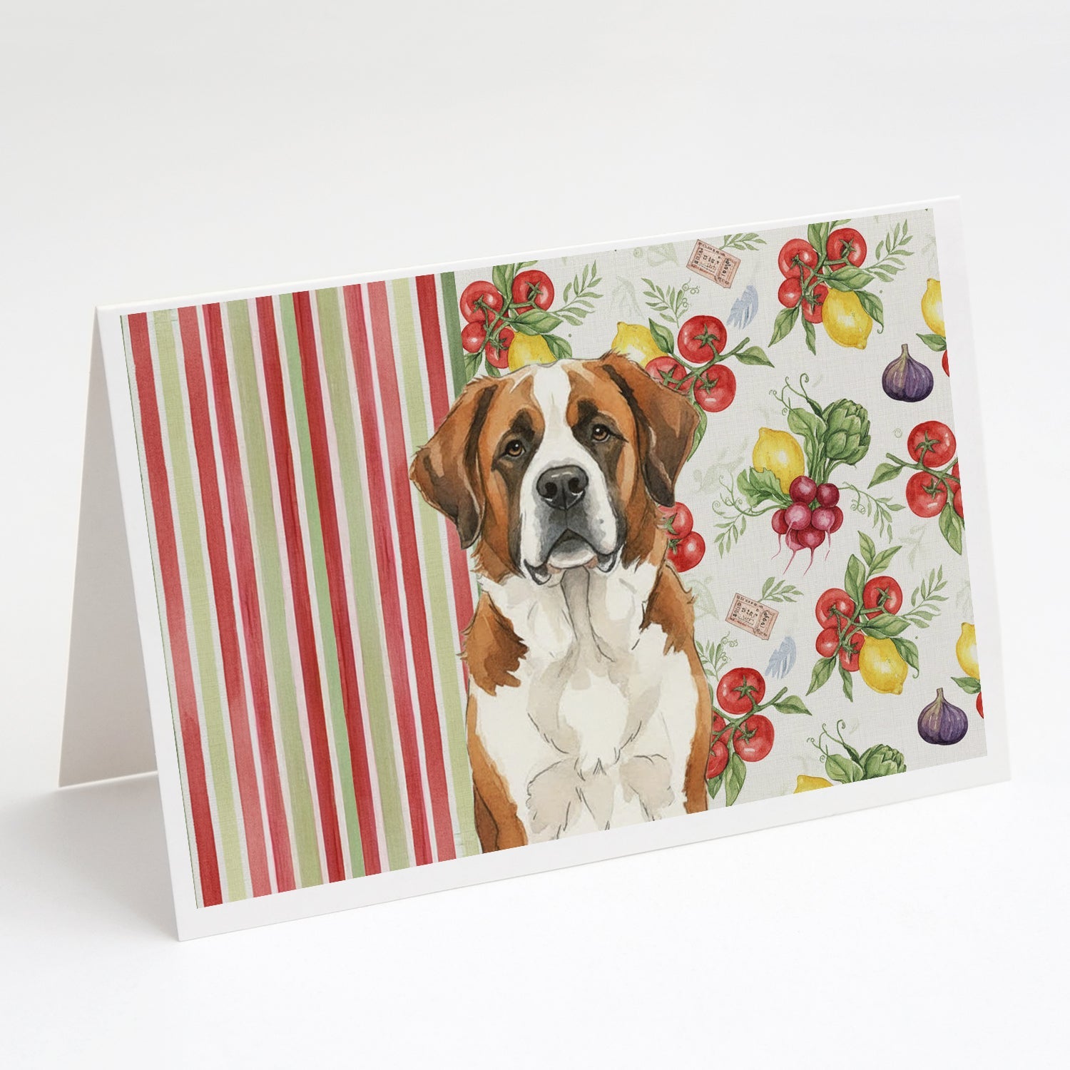 Shown here is the Brown and White Saint Bernard Vegetables Greeting Cards Pack of 8 from Caroline's Treasures featuring artwork of a Saint Bernard in a Everyday design. The detailed illustration and vibrant colors make it a standout accent that celebrates both seasonal style and love for the subject. This image features a vibrant watercolor vegetable pattern with tomatoes, lemons, artichokes, figs, radishes, and leafy greens arranged in a repeating design, paired with classic red and green stripes. The bright, garden-fresh palette creates a cheerful, farmhouse-inspired look that feels lively, welcoming, and perfect for kitchen décor. Everyday décor celebrates personal style and the small moments that make a house feel like home. Thoughtful designs add warmth and personality that can be enjoyed year-round. Celebrate special moments with Caroline's Treasures Printed Greeting Card Pack. This pack includes eight beautifully folded 5x7 cards, accompanied by eight matching white envelopes. With blank interiors, these cards provide ample space for your personalized messages and heartfelt holiday greetings. Each card features captivating full-color artwork, meticulously printed in our facility on high-quality 80 lb cover stock or 216 GSM. The super smooth finish of the white cards enhances the visual impact of the artwork, creating a truly stunning presentation. Designed by our talented in-house artists or licensed artists, the artwork on these cards showcases their creativity and attention to detail. From vibrant illustrations to captivating designs, each card tells its own unique story. Whether it's for birthdays, anniversaries, holidays, or any special occasion, Caroline's Treasures Greeting Card Pack is the perfect way to convey your heartfelt sentiments. Share joy, love, and warm wishes with these exquisite cards and make every moment unforgettable. Perfect for: Writing personal messages, everyday correspondence, and thoughtful notes, Dogs-themed stationery collections, or year-round use for Saint Bernard lovers. Saint Bernards are giant working dogs known for their gentle temperament and strength. This iconic breed is admired for its patience, loyalty, and calm, friendly presence. Makes a heartfelt gift for: Saint Bernard owners, Dogs lovers, Everyday gifts, pet parents, friends who adore their Saint Bernard, or anyone celebrating Dogs.