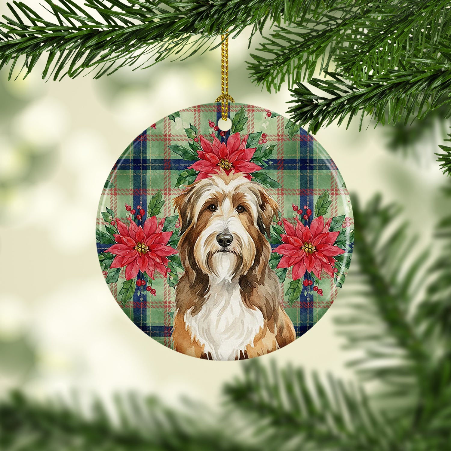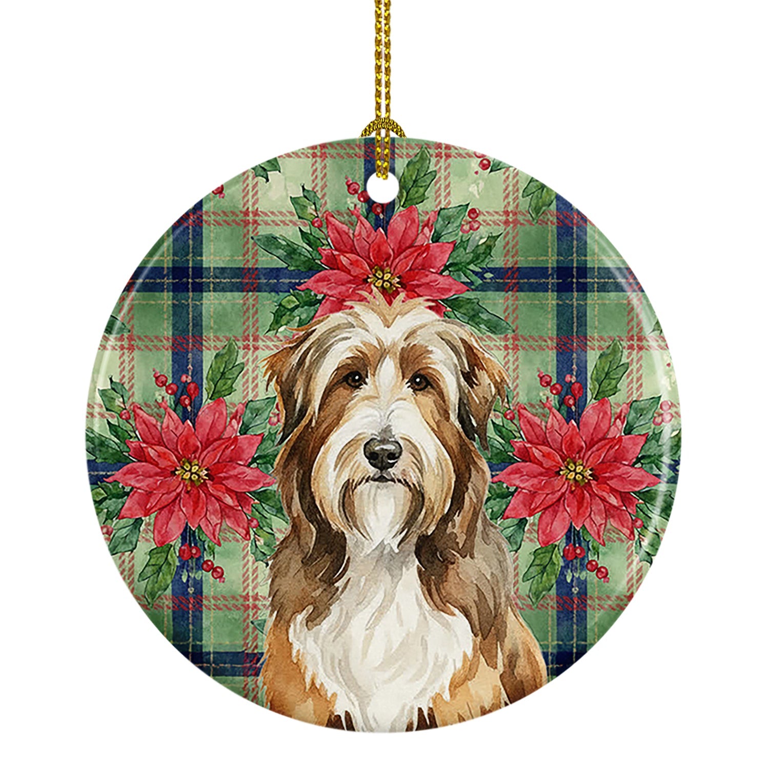 Brown Bearded Collie Christmas PoinsettIas Ceramic Ornament