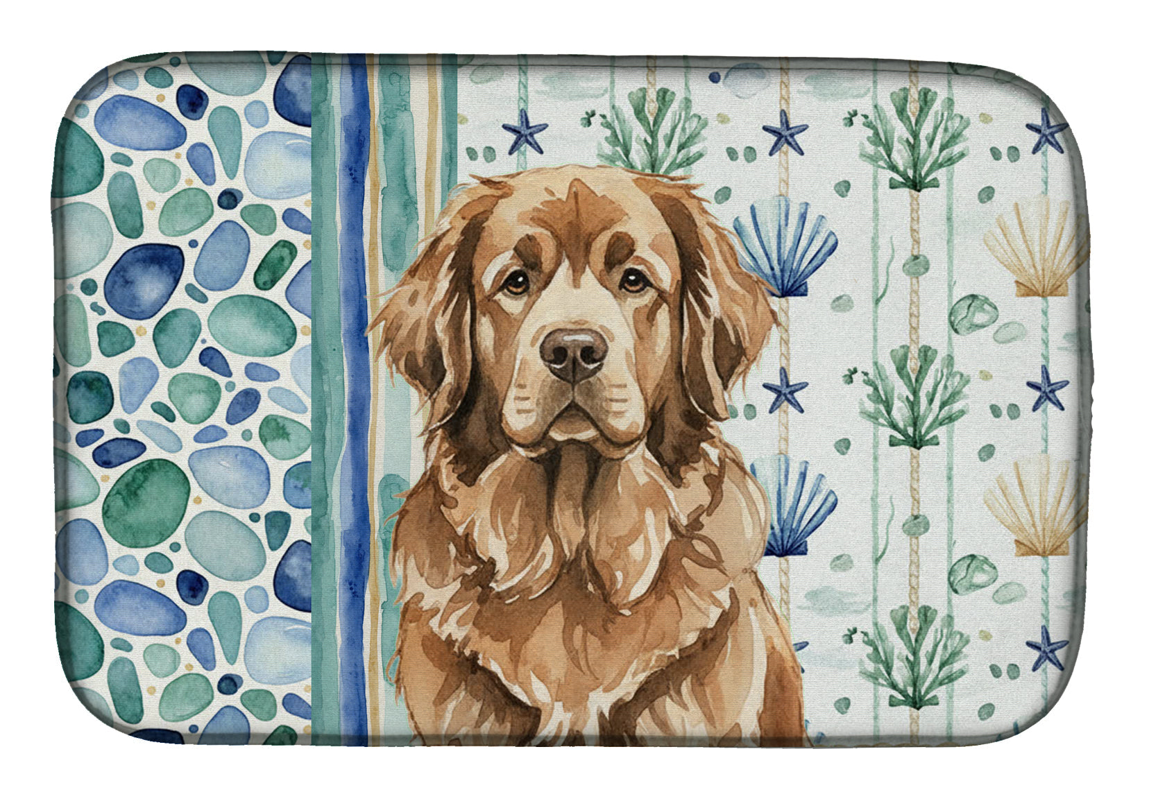 Shown here is the Brown Newfoundland Coastal Sea Glass Dish Drying Mat from Caroline's Treasures featuring artwork of a Newfoundland in a Everyday design. The detailed illustration and vibrant colors make it a standout accent that celebrates both seasonal style and love for the subject. This image features a calming coastal watercolor pattern with soft seashells, seaweed, starfish, and pebble-inspired accents arranged in a repeating design. The soothing palette of blues, greens, and sandy neutrals creates a relaxed, beach-inspired look that adds a fresh and tranquil feel to any space. Everyday décor celebrates personal style and the small moments that make a house feel like home. Thoughtful designs add warmth and personality that can be enjoyed year-round. Say goodbye to messy countertops and soggy dish towels with our innovative dish drying mat. Our high-quality dish drying pad is designed to keep your countertops dry while offering a stylish and efficient solution. Whether you're air drying dishes, glasses, stemware, silverware, pots, pans, bottles, or even fruits and vegetables, our dish mat is the perfect choice. The 14 inches x 21 inches size fits most counters and dish drying racks, and the non-slip design ensures stability. Made with water-absorbent polyester and a polyurethane foam insert, our dish drying mat is not only functional but also durable. It's machine washable and printed in the USA for long-lasting use. The beautiful artwork adds flair to your kitchen decor, making it a perfect housewarming gift or present for any occasion. Upgrade your kitchen experience with our absorbent and versatile dish drying mat. Perfect for: Kitchen counters and sinks, everyday dish drying and countertop protection, Dogs-themed homes, or year-round use for Newfoundland lovers. Newfoundlands are gentle working dogs known for their strength and sweet temperament. Often called Newfies, this breed is cherished for its loyalty, patience, and calm confidence. Makes a heartfelt gift for: Newfoundland owners, Dogs lovers, Everyday gifts, pet parents, friends who adore their Newfoundland, or anyone celebrating Dogs.