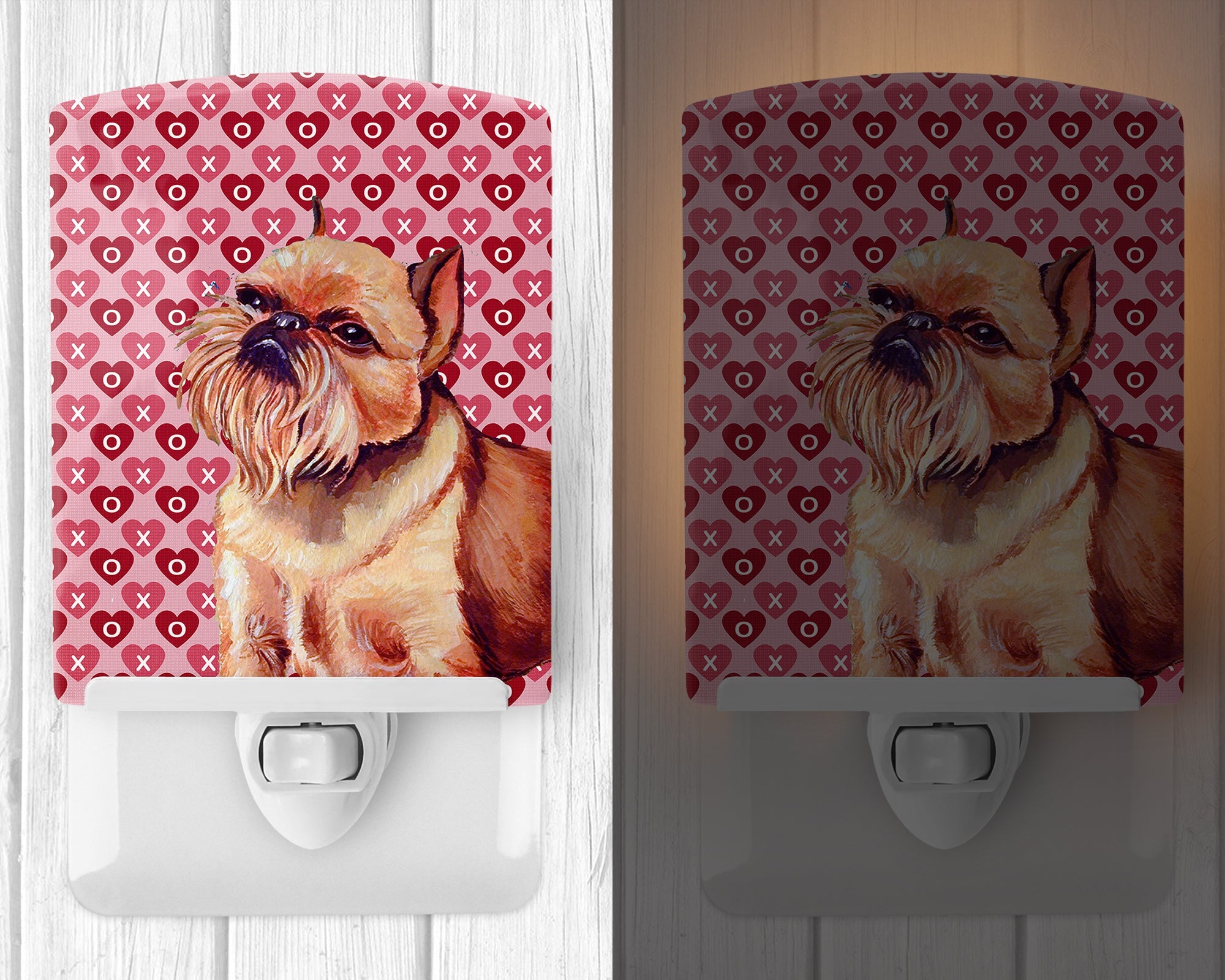 Decorate your space with our Valentine's Day Brussels Griffon artwork on a Night Light. Introduce a splash of artistic flair and subtle illumination to your space with the Decorative Ceramic Night Light from Caroline's Treasures. Perfect for any room, this night light seamlessly blends functionality with an aesthetic appeal, offering a stylish solution to brighten up dark corners of your home or office. Boasting a six-inch high by four-inch wide ceramic tile at the front, it showcases vivid, full-color artwork from distinguished artists, transforming a simple utility into a vibrant art piece. The artwork is securely encased in a robust metal holder, ensuring durability and longevity. Two screws are provided to firmly affix the tile into the holder. The holder extends three inches deep, housing an included bulb that emits a soft, welcoming glow. This product meets all safety standards, as evidenced by its UL approval. Proudly made in the United States from imported components, this Decorative Ceramic Night Light is not just a functional device; it's a statement piece that enhances the ambiance of your surroundings.