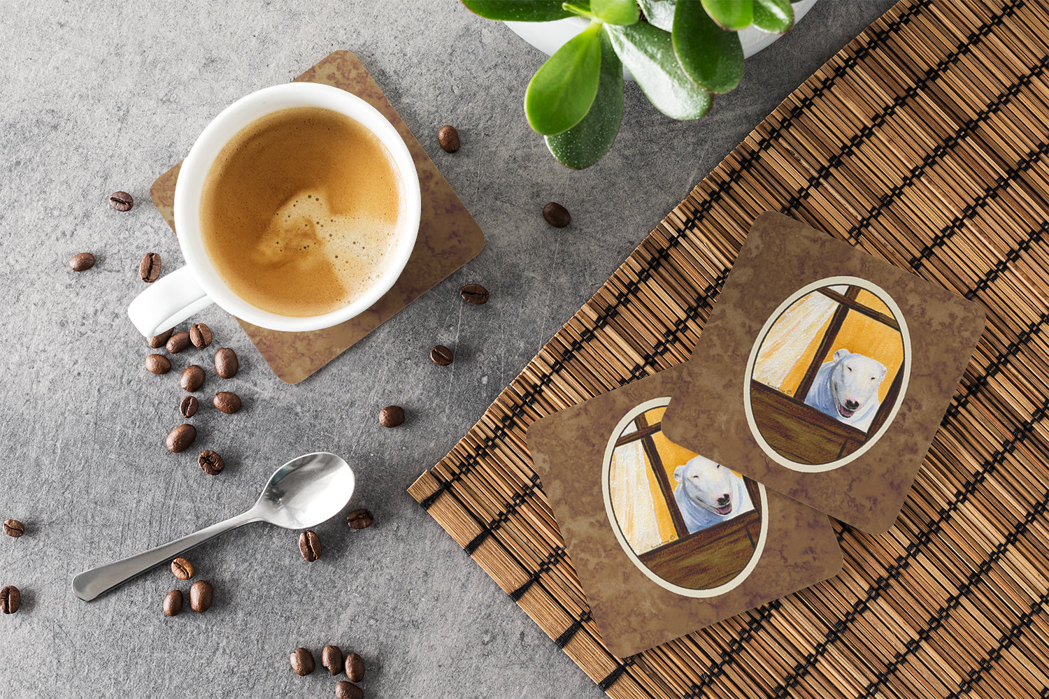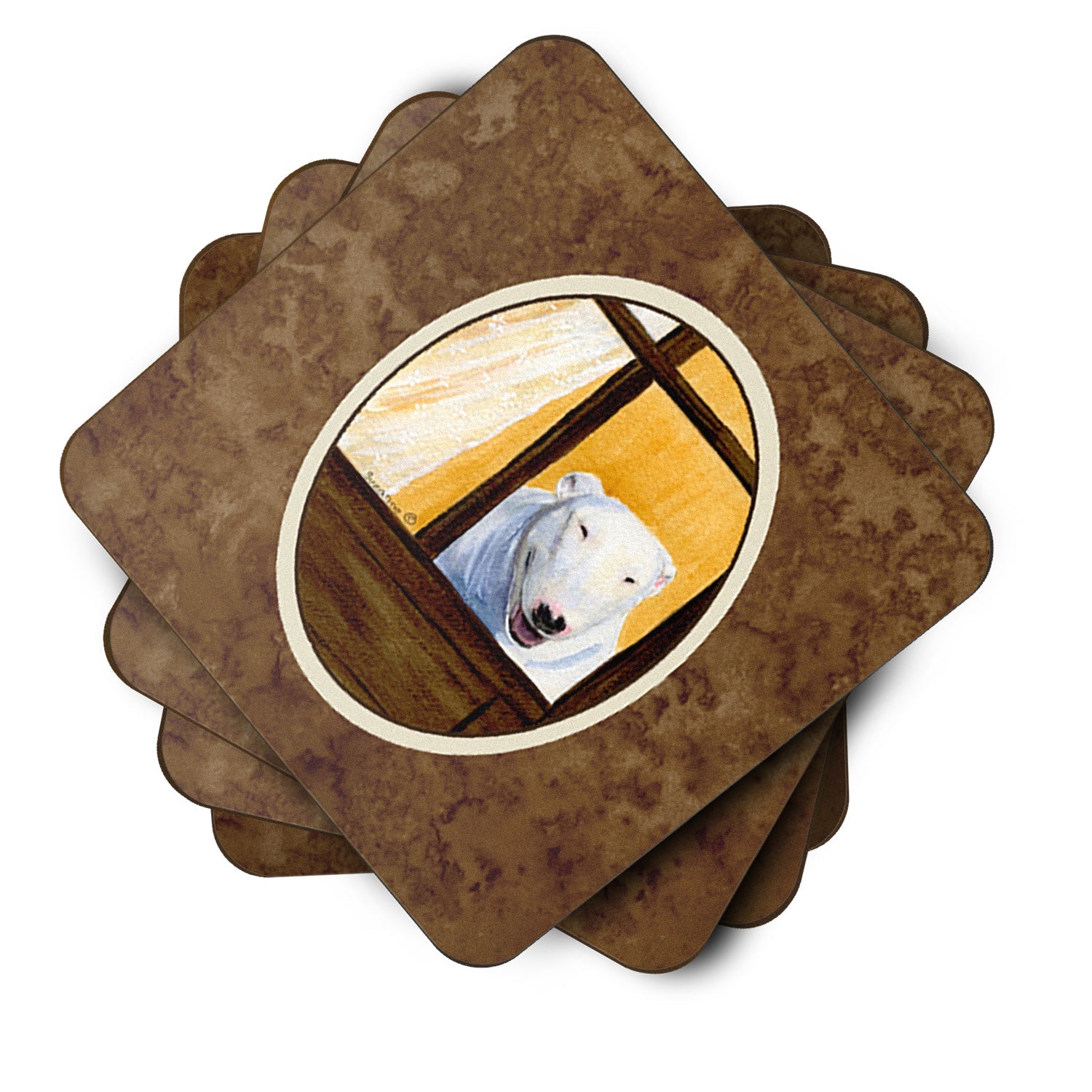 Decorate your space with our Bull Terrier artwork on a Coaster set. Presenting our Set of 4 Foam Coasters, a stylish and practical addition to your table setting. Each square coaster, measuring 3 1/2 inches by 3 1/2 inches, is perfectly sized to accommodate various drinkware, from coffee mugs to tumblers. These coasters stand out with their full-color artwork, permanently dyed onto the material for a vibrant and fade-resistant finish. They're not just functional, they're a fashionable statement, adding a touch of flair to any gathering or event. Our foam coasters serve a dual purpose - they protect your table from water stains and are perfect for both hot and cold drinks. The material used is similar to that of our high-quality mouse pads, ensuring durability and heat resistance. These coasters are easy to maintain - simply wash them in the top of your dishwasher and lay flat to dry. The design won't come off, ensuring they retain their vivid colors for years. Pair them with one of our insulated coolers or huggers for a cohesive, thoughtful gift set. Enhance your beverage experience with our Set of 4 Foam Coasters.