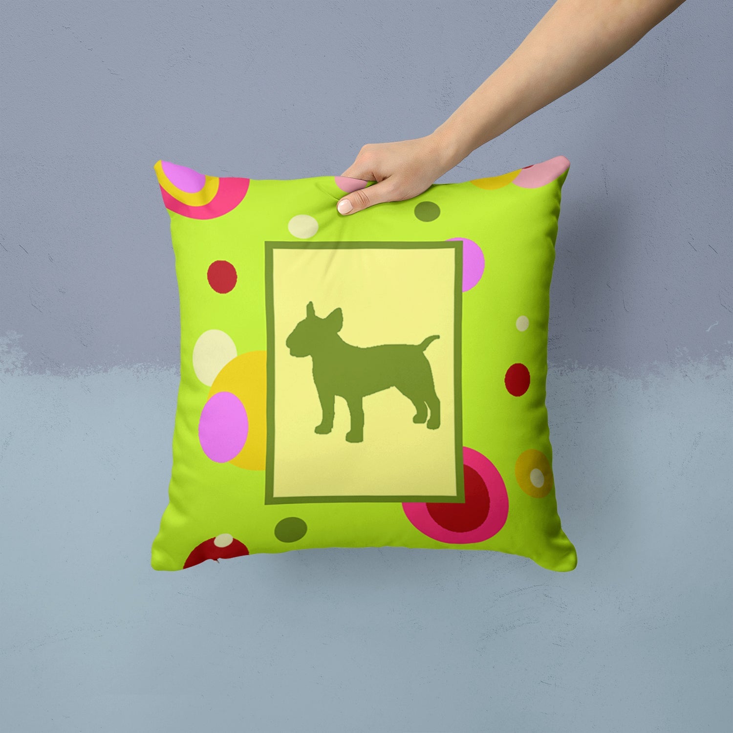 Decorate your space with our Bull Terrier artwork on a Pillow. Add a touch of vibrancy and comfort to your outdoor seating with Caroline's Treasures Fabric Decorative Pillow. Measuring approximately 14 inches by 14 inches, this outdoor pillow is crafted to elevate the appeal of your patio furniture, infusing it with vivid color and artistic flair. The pillow includes a 100% Polyester Fabric sham filled with a quality pillow form to provide superior comfort. Innovatively made from our brand new material, specifically woven for its water resistance, this pillow is designed for durability. The soft canvas fabric offers versatility in use, fit for your indoor couch or your outdoor patio, porch, or veranda. The fabric is dyed with colorfast dyes built for resilience against weather conditions, ensuring the pillow retains its beauty over time. Constructed by sewing three fabric pieces to create a sham, the polyester insert is then nestled inside to form the pillow, resulting in an overstuffed pillow that maintains its shape. Both the sham and the pillow insert are proudly made in the United States. As the pillows are handcrafted, there may be minor variations in size, further enhancing their unique charm. Experience comfort in style with Caroline's Treasures Fabric Decorative Pillow.