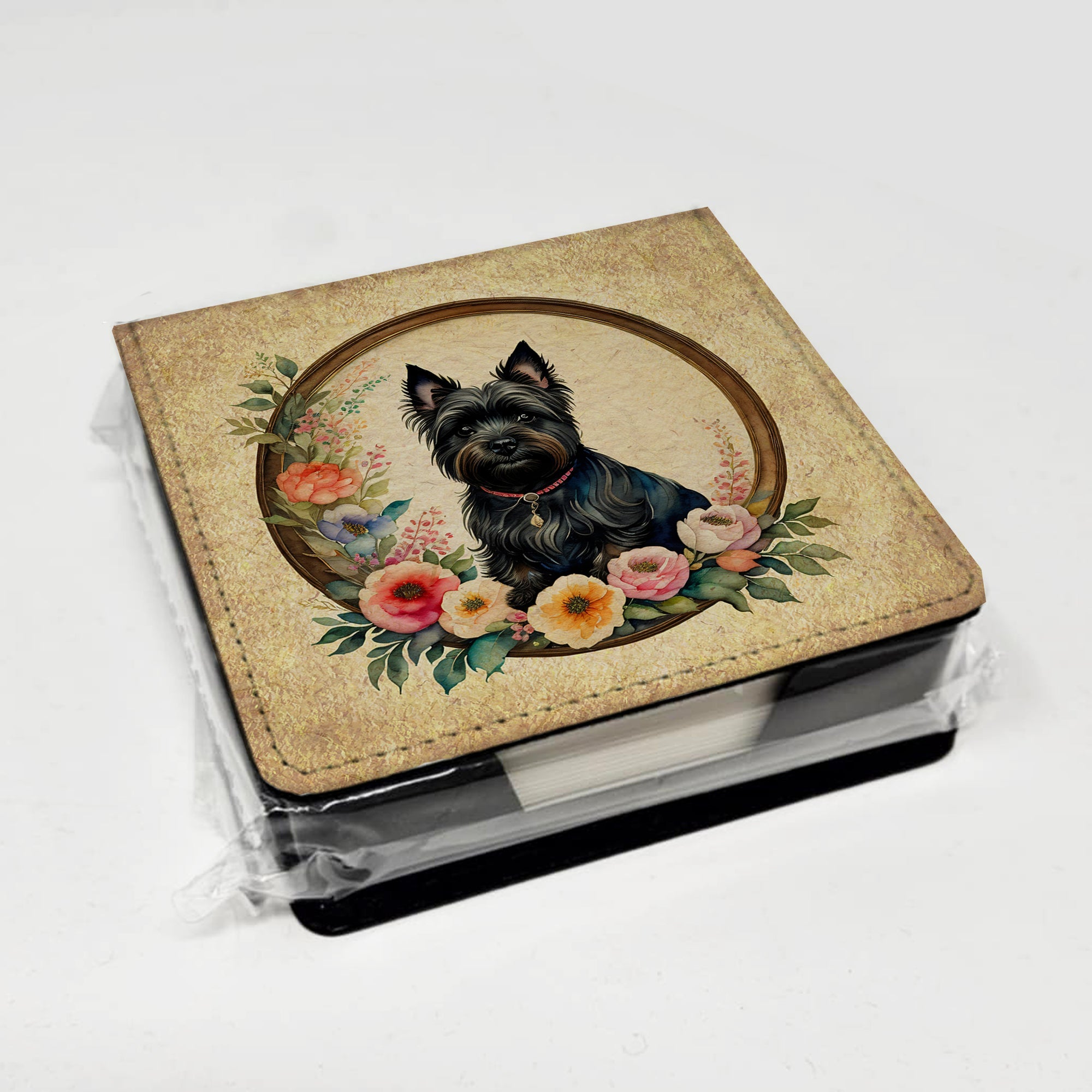 PU Leather Note Paper Holder featuring breed specific Cairn Terrier artwork. Elevate your workspace with this PU Leather Note Paper Holder, crafted to resemble luxurious leather without the use of animal products. Made from durable synthetic PU leather, it offers both a premium look and eco-friendly appeal. This note holder, compactly sized at 4.25 x 4.25 x 1.25 inches, includes about 160 sheets of 3.75 x 3.75-inch note paper—ideal for quick notes and reminders. An exclusive artist-designed cover makes each holder uniquely vibrant, adding a splash of color and personality to any desk or office. The discrete design keeps note paper hidden, maintaining a neat and organized workspace. Perfect as a gift or for personal use, this stylish holder is refillable with standard paper, ensuring long-lasting utility. A must-have for anyone seeking a sophisticated, artful touch to their workspace while supporting animal-friendly products. Add style, organization, and creativity to your everyday routine with this elegant note paper holder.