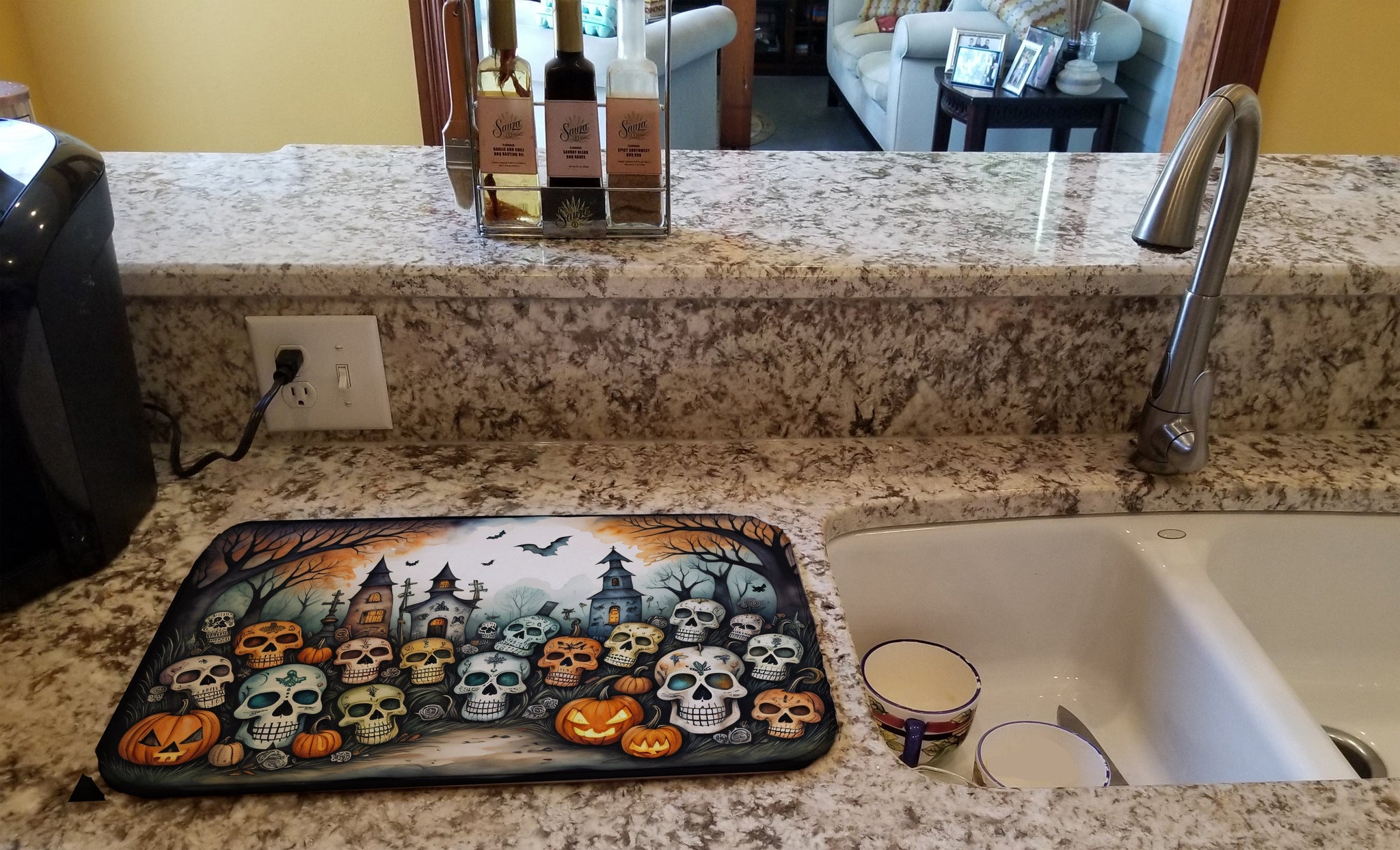 Celebrate Halloween with this Halloween Dish Drying Mat. Say goodbye to messy countertops and soggy dish towels with our innovative dish drying mat. Our high-quality dish drying pad is designed to keep your countertops dry while offering a stylish and efficient solution. Whether you're air drying dishes, glasses, stemware, silverware, pots, pans, bottles, or even fruits and vegetables, our dish mat is the perfect choice. The 14 inches x 22 inches size fits most counters and dish drying racks, and the non-slip design ensures stability. Made with water-absorbent polyester and a polyurethane foam insert, our dish drying mat is not only functional but also durable. It's machine washable and printed in the USA for long-lasting use. The beautiful artwork adds flair to your kitchen decor, making it a perfect housewarming gift or present for any occasion. Upgrade your kitchen experience with our absorbent and versatile dish drying mat.