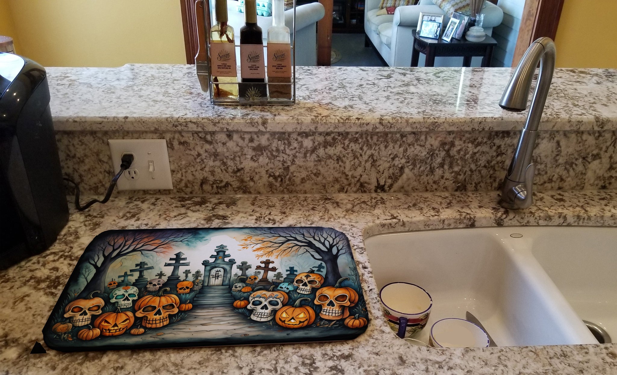 Celebrate Halloween with this Halloween Dish Drying Mat. Say goodbye to messy countertops and soggy dish towels with our innovative dish drying mat. Our high-quality dish drying pad is designed to keep your countertops dry while offering a stylish and efficient solution. Whether you're air drying dishes, glasses, stemware, silverware, pots, pans, bottles, or even fruits and vegetables, our dish mat is the perfect choice. The 14 inches x 22 inches size fits most counters and dish drying racks, and the non-slip design ensures stability. Made with water-absorbent polyester and a polyurethane foam insert, our dish drying mat is not only functional but also durable. It's machine washable and printed in the USA for long-lasting use. The beautiful artwork adds flair to your kitchen decor, making it a perfect housewarming gift or present for any occasion. Upgrade your kitchen experience with our absorbent and versatile dish drying mat.