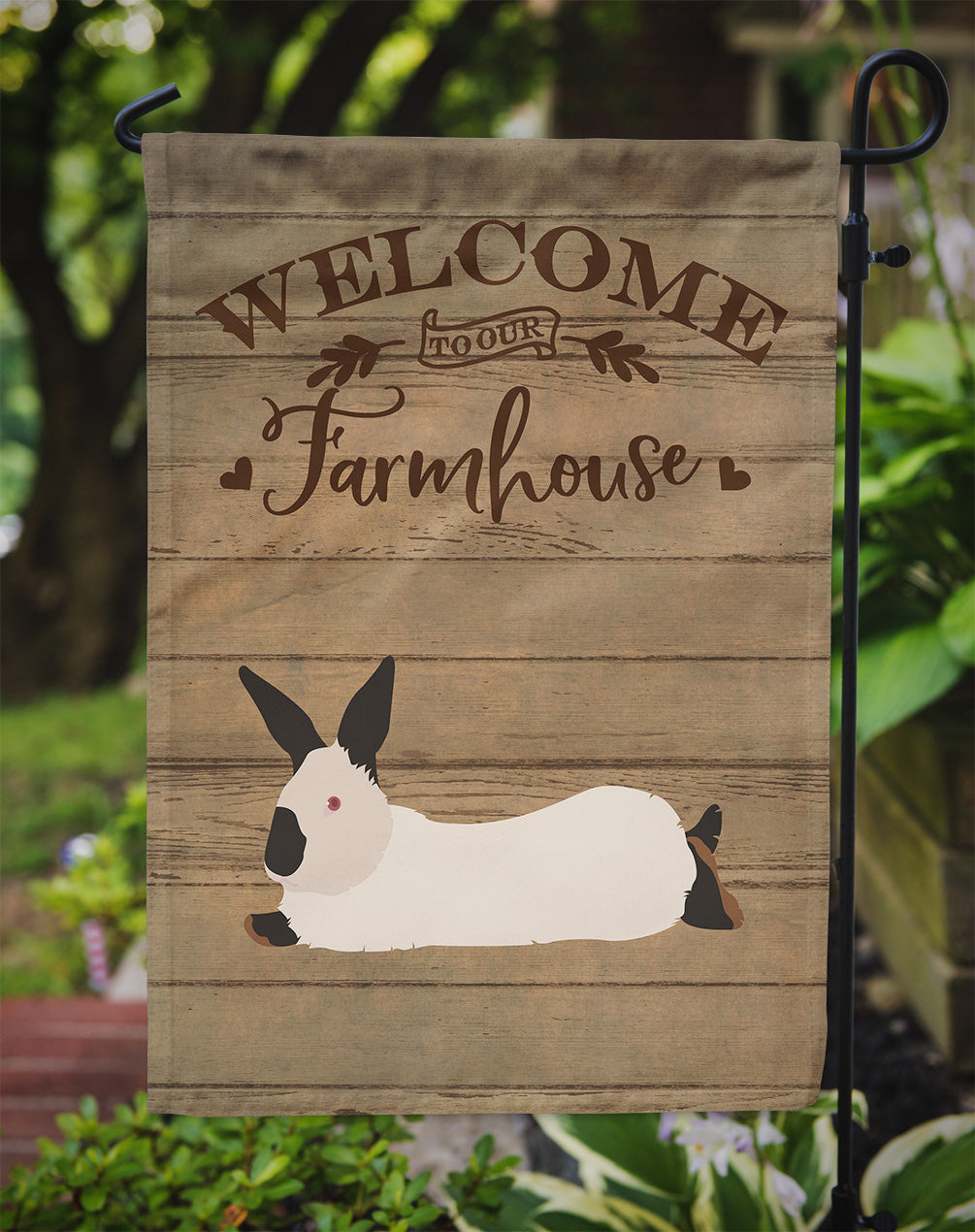 Decorate your space with our California White Rabbit artwork on a Garden Flag. Enhance the beauty of your garden, patio, or yard with Caroline's Treasures Decorative Garden Flag, proudly made in the USA. Crafted from two pieces of thick, double-sided polyester fabric, this 2-ply garden flag is designed to withstand various weather conditions, making it water-resistant and weatherproof. Featuring correctly readable words on both sides, this garden flag offers a delightful visual experience from any angle. With its heavier weight, it stands out among other garden flags, ensuring stability and durability even in wind, rain, and snow. Measuring approximately 11 1/4 inches by 15 1/2 inches, this flag allows you to personalize your outdoor decor. It comes with a 1 1/2-inch sleeve sewn in, allowing easy attachment to any standard garden flag stand or garden size porch hanger (sold separately). Make a statement in your outdoor space with Caroline's Treasures Decorative Garden Flag, a vibrant and high-quality flag that adds color and personality to your surroundings. Proudly made in the USA, it's a symbol of quality craftsmanship and attention to detail.