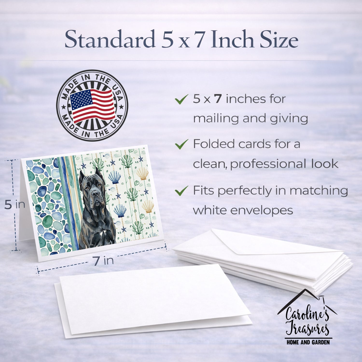 Shown here is the Cane Corso Coastal Sea Glass Greeting Cards Pack of 8 from Caroline's Treasures featuring artwork of a Cairn Terrier in a Everyday design. The detailed illustration and vibrant colors make it a standout accent that celebrates both seasonal style and love for the subject. This image features a calming coastal watercolor pattern with soft seashells, seaweed, starfish, and pebble-inspired accents arranged in a repeating design. The soothing palette of blues, greens, and sandy neutrals creates a relaxed, beach-inspired look that adds a fresh and tranquil feel to any space. Everyday décor celebrates personal style and the small moments that make a house feel like home. Thoughtful designs add warmth and personality that can be enjoyed year-round. Celebrate special moments with Caroline's Treasures Printed Greeting Card Pack. This pack includes eight beautifully folded 5x7 cards, accompanied by eight matching white envelopes. With blank interiors, these cards provide ample space for your personalized messages and heartfelt holiday greetings. Each card features captivating full-color artwork, meticulously printed in our facility on high-quality 80 lb cover stock or 216 GSM. The super smooth finish of the white cards enhances the visual impact of the artwork, creating a truly stunning presentation. Designed by our talented in-house artists or licensed artists, the artwork on these cards showcases their creativity and attention to detail. From vibrant illustrations to captivating designs, each card tells its own unique story. Whether it's for birthdays, anniversaries, holidays, or any special occasion, Caroline's Treasures Greeting Card Pack is the perfect way to convey your heartfelt sentiments. Share joy, love, and warm wishes with these exquisite cards and make every moment unforgettable. Perfect for: Writing personal messages, everyday correspondence, and thoughtful notes, Dogs-themed stationery collections, or year-round use for Cairn Terrier lovers. Cairn Terriers are small, confident dogs known for their alert expression and spirited personality. This hardy terrier breed is admired for its courage, intelligence, and affectionate loyalty. Makes a heartfelt gift for: Cairn Terrier owners, Dogs lovers, Everyday gifts, pet parents, friends who adore their Cairn Terrier, or anyone celebrating Dogs.