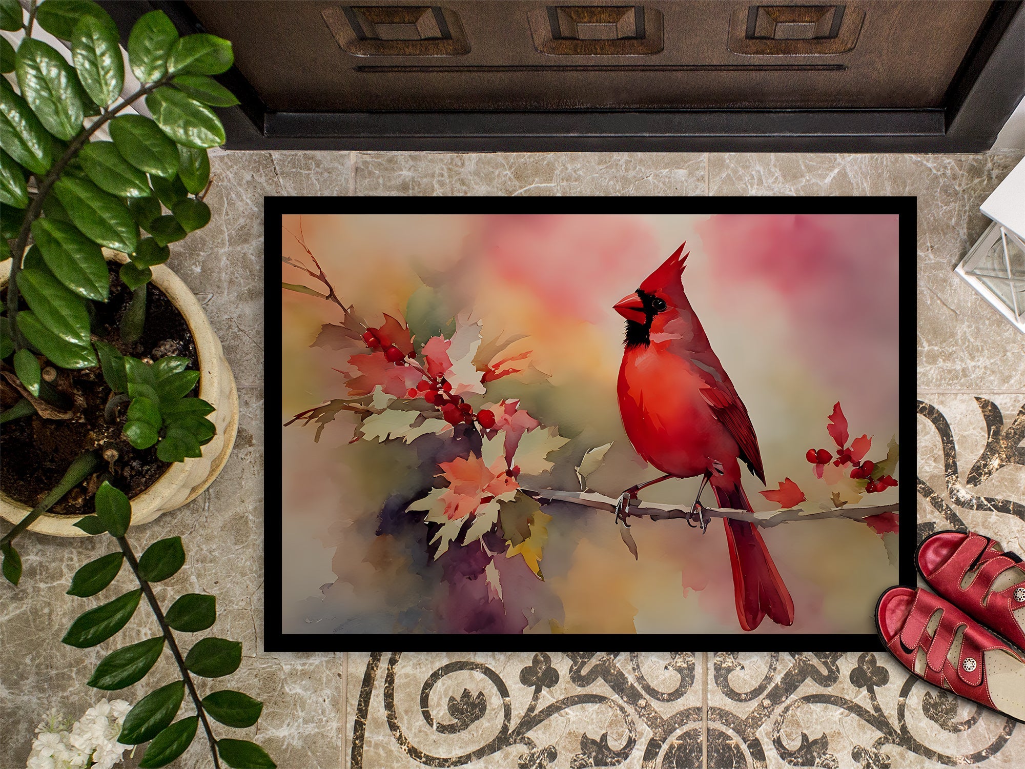 Decorate your space with our Cardinal artwork on a Doormat. Welcome your guests in style with our Artwork Door Mat, designed to withstand almost any weather condition. This mat, measuring approximately 24 by 36 inches, is held together by durable black binding tape. Its top layer, composed of polyester felt, is dyed with the eye-catching image you see on the mat. A few layers below provide the mat with stability, while its rubber bottom is stamped to help prevent slipping and ensures safety. Our mat works wonderfully as both an indoor or outdoor door mat. For cleaning, simply hose it off with water or use a power washer - no need for any cleaner that produces suds. Avoid scrubbing with a brush, instead, opt for the vacuum on floor setting. Designed manufactured and printed in the USA, this mat is a perfect addition to your porch, outdoor kitchen, entryway, or any indoor space. Its unique design makes it a charming decorative rug that greets your guests and adds a stylish touch to your home decor.