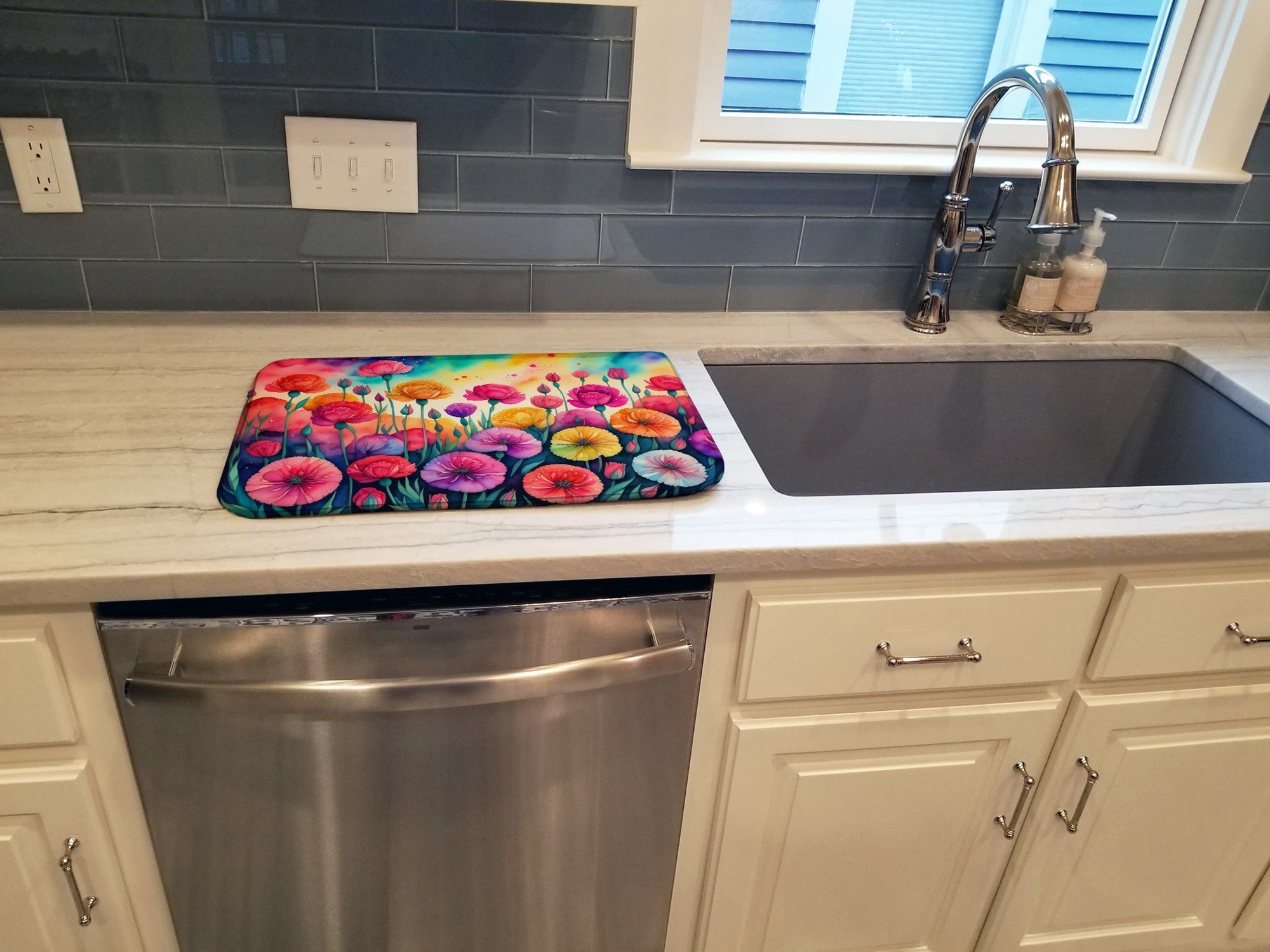 Say goodbye to messy countertops and soggy dish towels with our innovative dish drying mat. Our high-quality dish drying pad is designed to keep your countertops dry while offering a stylish and efficient solution. Whether you're air drying dishes, glasses, stemware, silverware, pots, pans, bottles, or even fruits and vegetables, our dish mat is the perfect choice. The 14 inches x 22 inches size fits most counters and dish drying racks, and the non-slip design ensures stability. Made with water-absorbent polyester and a polyurethane foam insert, our dish drying mat is not only functional but also durable. It's machine washable and printed in the USA for long-lasting use. The beautiful artwork adds flair to your kitchen decor, making it a perfect housewarming gift or present for any occasion. Upgrade your kitchen experience with our absorbent and versatile dish drying mat.
