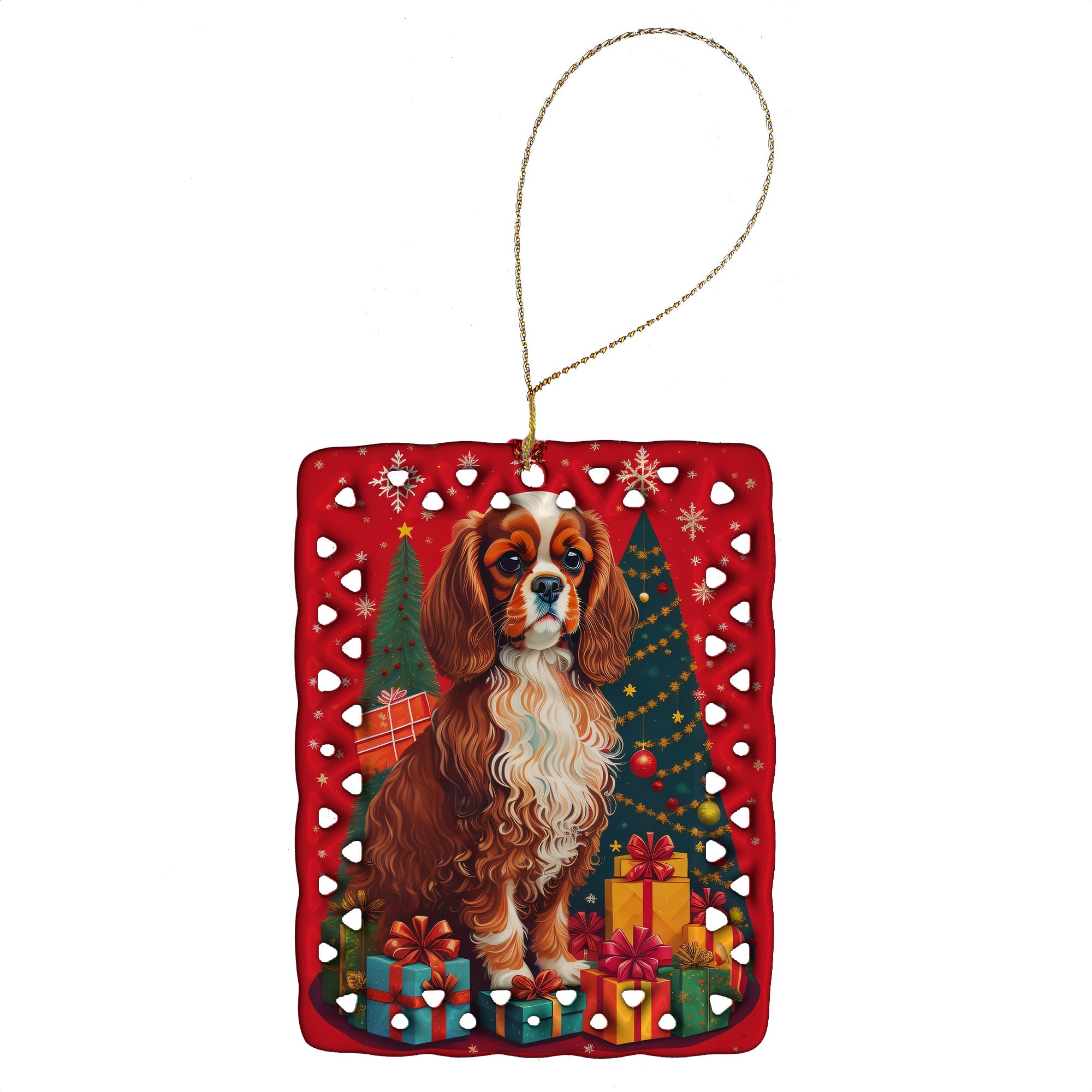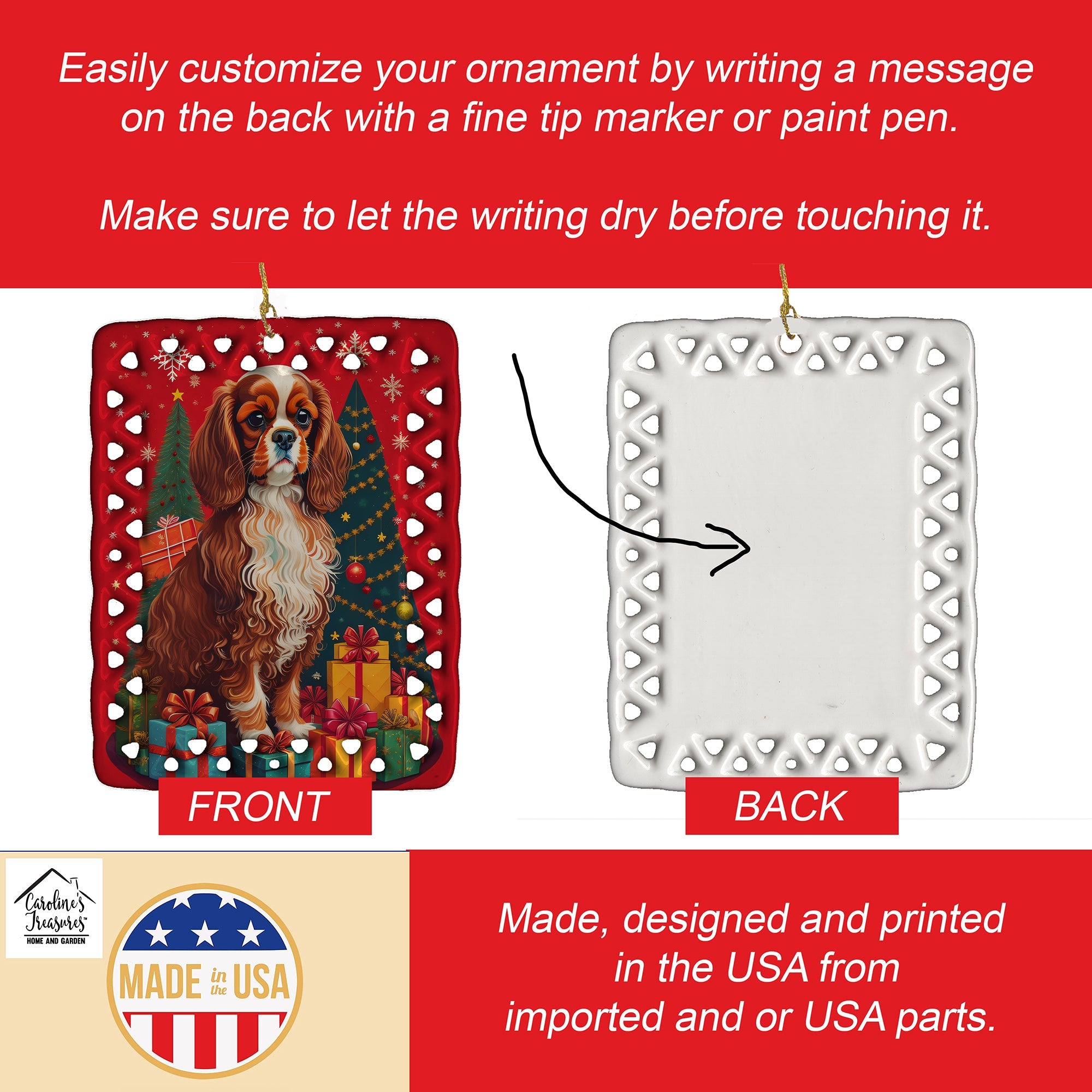 Porcelain Ornament featuring breed specific Cavalier Spaniel artwork. Celebrate Christmas with this Christmas Ornament. Add a unique, personal touch to your holiday decor with our Rectangular Lattice Porcelain Ornament. Perfect for creating cherished memories, this high-quality ornament shines under festive lights, reflecting warmth and joy throughout your Christmas tree. Crafted with a glossy finish, it showcases vibrant, full-color artwork contributed by our talented artists, ensuring your tree is adorned with a burst of color and holiday spirit. What sets this Porcelain Ornament apart is its customizable white back. Use a paint pen or permanent marker to write a heartfelt message, commemorate a special year, or mark an unforgettable date, turning this ornament into a keepsake that will be treasured for years to come. For best results, allow any personalization to dry thoroughly before handling. Each ornament comes complete with a delicate gold cord, making it easy to hang and display. Proudly made in the USA, this ornament measures 3.375 x 2.625 inches and is a thoughtful gift for pet sitters, teachers, family members, or anyone who would appreciate a little extra holiday magic. Bring style, charm, and a touch of personal meaning to your Christmas tree with this beautifully designed ornament..