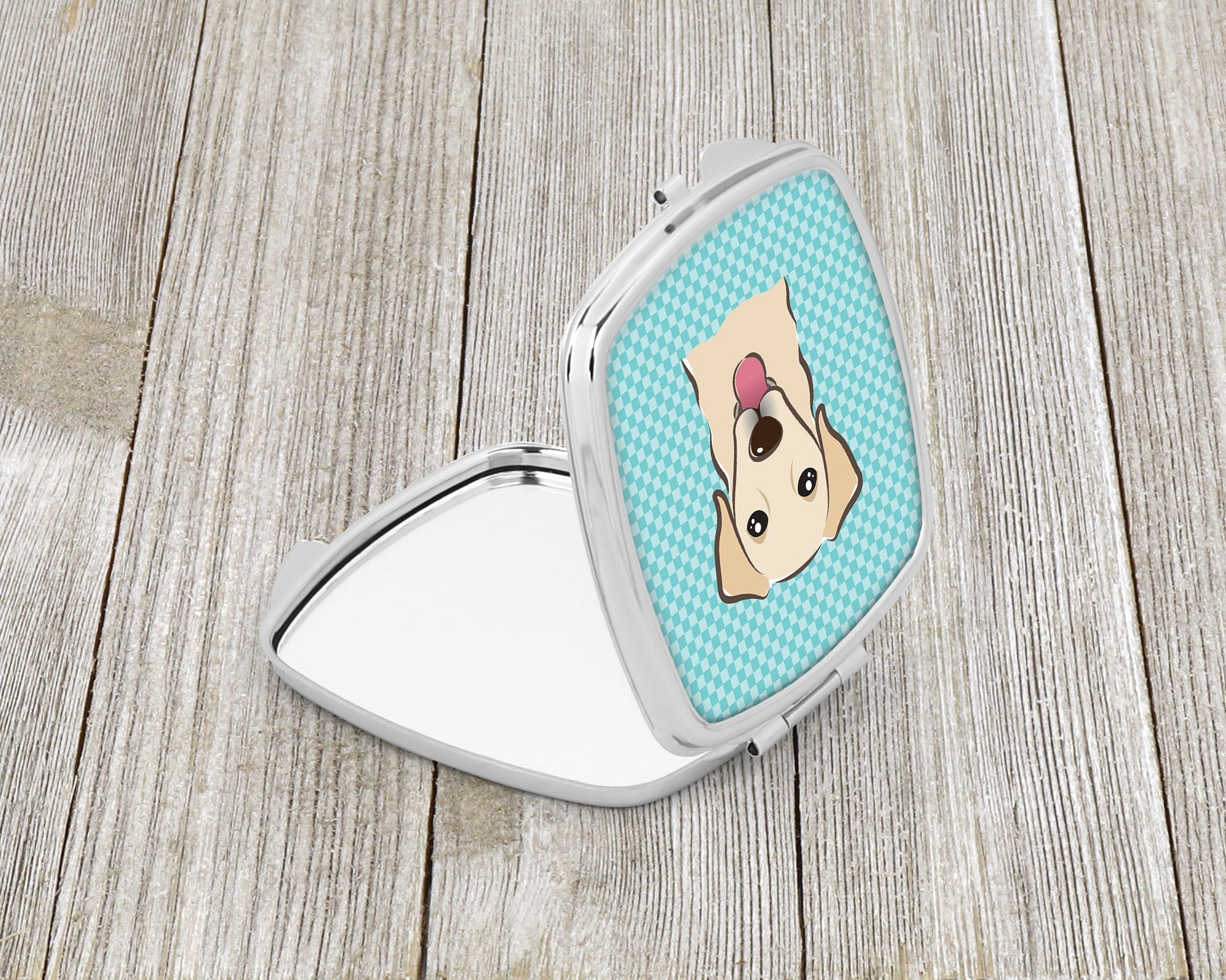 Decorate your space with our Golden Retriever artwork on a Compact Mirror. Introducing our Square Compact Mirror, a blend of elegance, functionality, and compactness, perfect for on-the-go touch-ups. This Silvertone metal mirror, with dimensions of 2.75 inches x 3 inches x .3 inches, fits effortlessly into your purse, handbag, or pocket, ensuring that you can check your appearance anytime, anywhere. Our compact mirror stands out with its eye-catching artwork on the front, adding a dash of style to this practical accessory. It is more than just a mirror; it's a statement piece that reflects your personality and aesthetic. When opened, this compact reveals two mirrors inside, doubling your perspective for precise touch-ups. The Silvertone metal construction ensures durability while maintaining a lightweight feel, making it an ideal everyday carry item. Whether you're rushing to a meeting, prepping for a dinner date, or just need a quick check on your look, our Square Compact Mirror is your reliable companion. Experience the perfect blend of style and practicality with this must-have accessory.