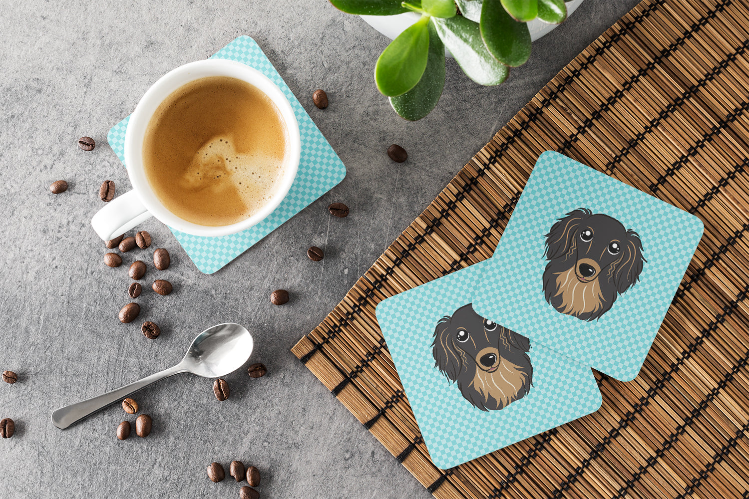 Decorate your space with our Dachshund artwork on a Coaster set. Presenting our Set of 4 Foam Coasters, a stylish and practical addition to your table setting. Each square coaster, measuring 3 1/2 inches by 3 1/2 inches, is perfectly sized to accommodate various drinkware, from coffee mugs to tumblers. These coasters stand out with their full-color artwork, permanently dyed onto the material for a vibrant and fade-resistant finish. They're not just functional, they're a fashionable statement, adding a touch of flair to any gathering or event. Our foam coasters serve a dual purpose - they protect your table from water stains and are perfect for both hot and cold drinks. The material used is similar to that of our high-quality mouse pads, ensuring durability and heat resistance. These coasters are easy to maintain - simply wash them in the top of your dishwasher and lay flat to dry. The design won't come off, ensuring they retain their vivid colors for years. Pair them with one of our insulated coolers or huggers for a cohesive, thoughtful gift set. Enhance your beverage experience with our Set of 4 Foam Coasters.