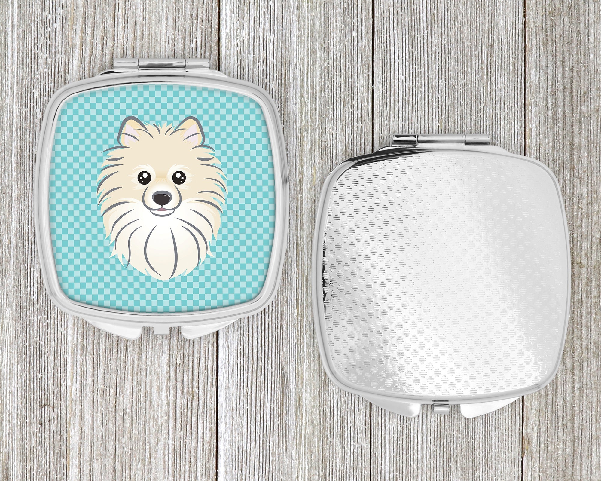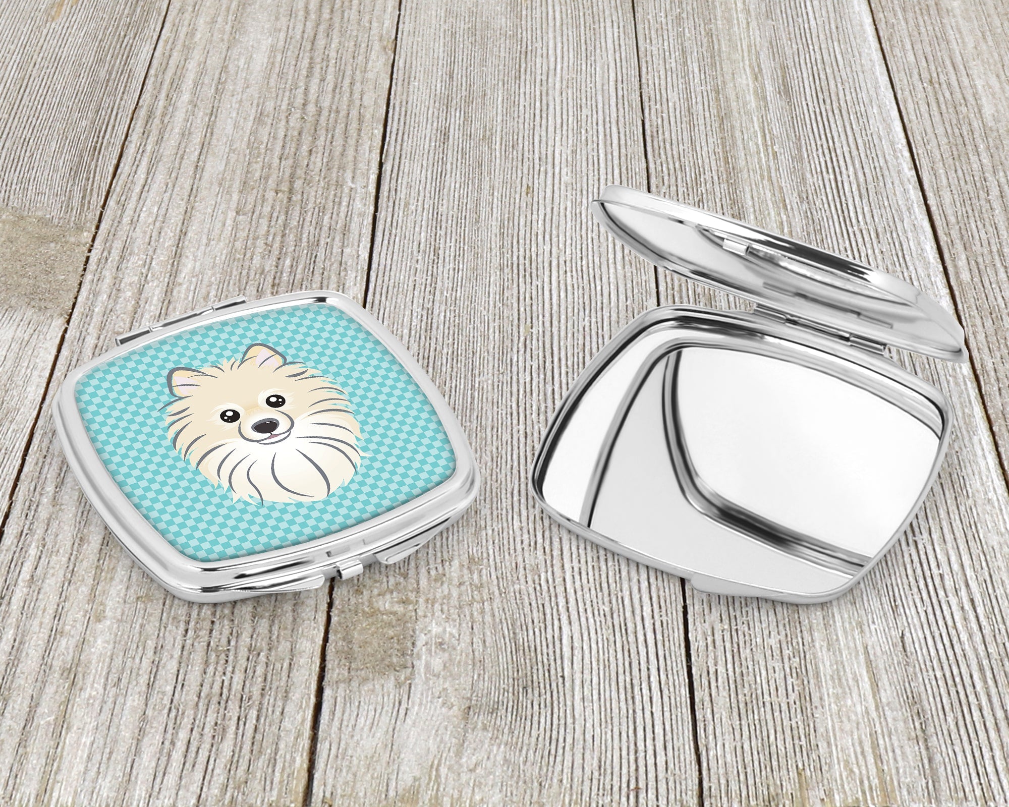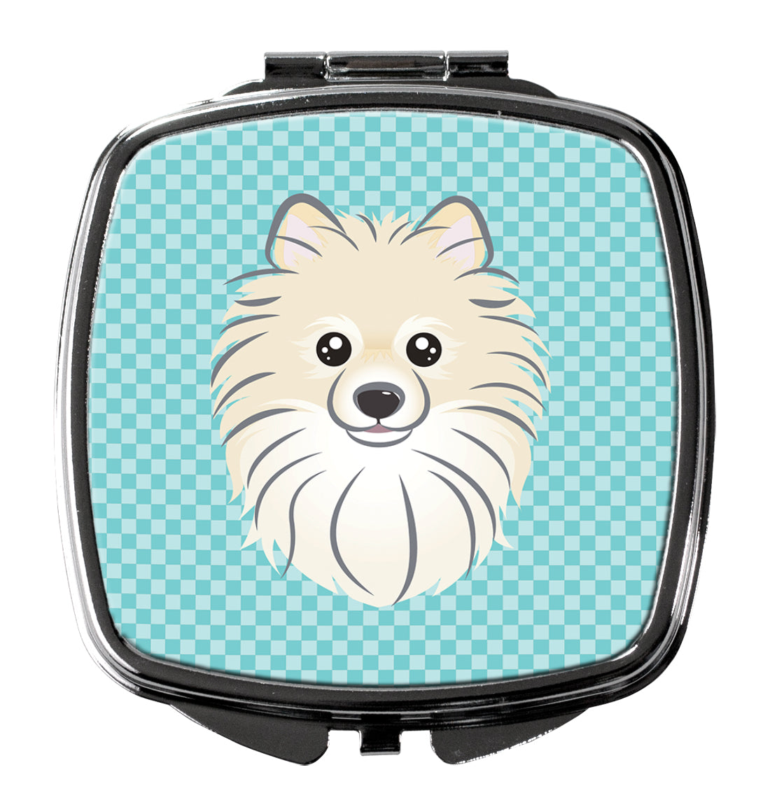 Decorate your space with our Pomeranian artwork on a Compact Mirror. Introducing our Square Compact Mirror, a blend of elegance, functionality, and compactness, perfect for on-the-go touch-ups. This Silvertone metal mirror, with dimensions of 2.75 inches x 3 inches x .3 inches, fits effortlessly into your purse, handbag, or pocket, ensuring that you can check your appearance anytime, anywhere. Our compact mirror stands out with its eye-catching artwork on the front, adding a dash of style to this practical accessory. It is more than just a mirror; it's a statement piece that reflects your personality and aesthetic. When opened, this compact reveals two mirrors inside, doubling your perspective for precise touch-ups. The Silvertone metal construction ensures durability while maintaining a lightweight feel, making it an ideal everyday carry item. Whether you're rushing to a meeting, prepping for a dinner date, or just need a quick check on your look, our Square Compact Mirror is your reliable companion. Experience the perfect blend of style and practicality with this must-have accessory.