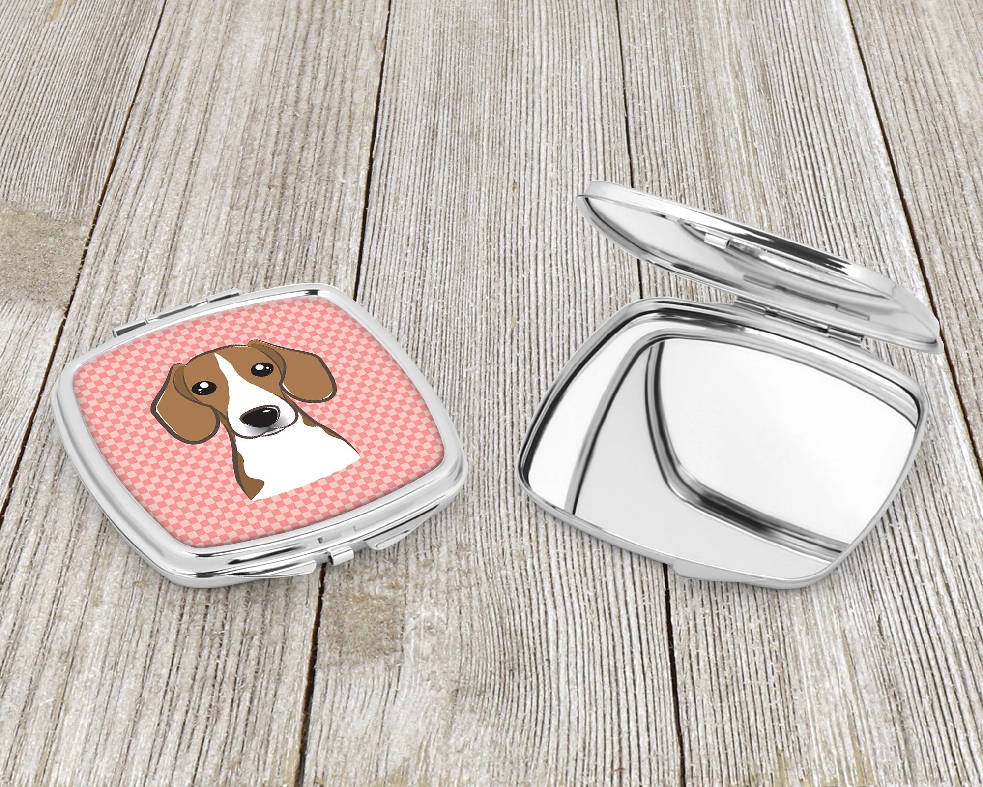 Decorate your space with our Beagle artwork on a Compact Mirror. Introducing our Square Compact Mirror, a blend of elegance, functionality, and compactness, perfect for on-the-go touch-ups. This Silvertone metal mirror, with dimensions of 2.75 inches x 3 inches x .3 inches, fits effortlessly into your purse, handbag, or pocket, ensuring that you can check your appearance anytime, anywhere. Our compact mirror stands out with its eye-catching artwork on the front, adding a dash of style to this practical accessory. It is more than just a mirror; it's a statement piece that reflects your personality and aesthetic. When opened, this compact reveals two mirrors inside, doubling your perspective for precise touch-ups. The Silvertone metal construction ensures durability while maintaining a lightweight feel, making it an ideal everyday carry item. Whether you're rushing to a meeting, prepping for a dinner date, or just need a quick check on your look, our Square Compact Mirror is your reliable companion. Experience the perfect blend of style and practicality with this must-have accessory.