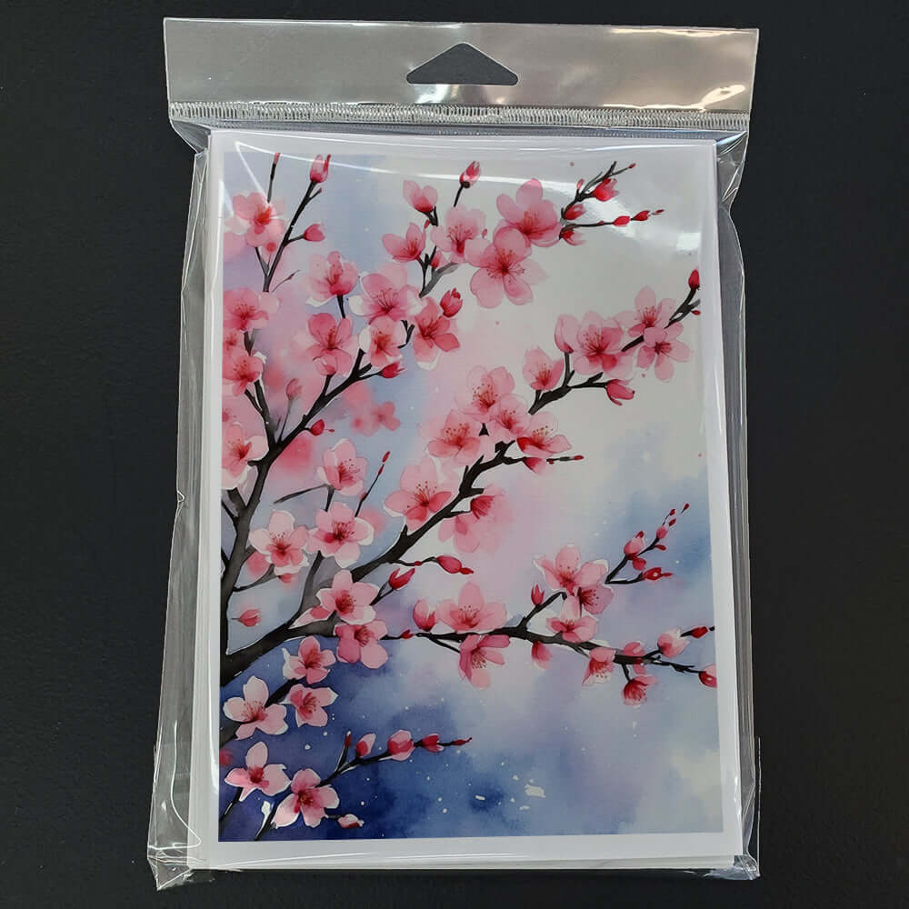 Greeting Cards Pack of 8 featuring breed specific Cherry Blossoms artwork. Celebrate special moments with Caroline's Treasures Printed Greeting Card Pack. This pack includes eight beautifully folded 5x7 cards, accompanied by eight matching white envelopes. With blank interiors, these cards provide ample space for your personalized messages and heartfelt holiday greetings. Each card features captivating full-color artwork, meticulously printed in our facility on high-quality 80 lb cover stock or 216 GSM. The super smooth finish of the white cards enhances the visual impact of the artwork, creating a truly stunning presentation. Designed by our talented in-house artists or licensed artists, the artwork on these cards showcases their creativity and attention to detail. From vibrant illustrations to captivating designs, each card tells its own unique story. Whether it's for birthdays, anniversaries, holidays, or any special occasion, Caroline's Treasures Greeting Card Pack is the perfect way to convey your heartfelt sentiments. Share joy, love, and warm wishes with these exquisite cards and make every moment unforgettable.