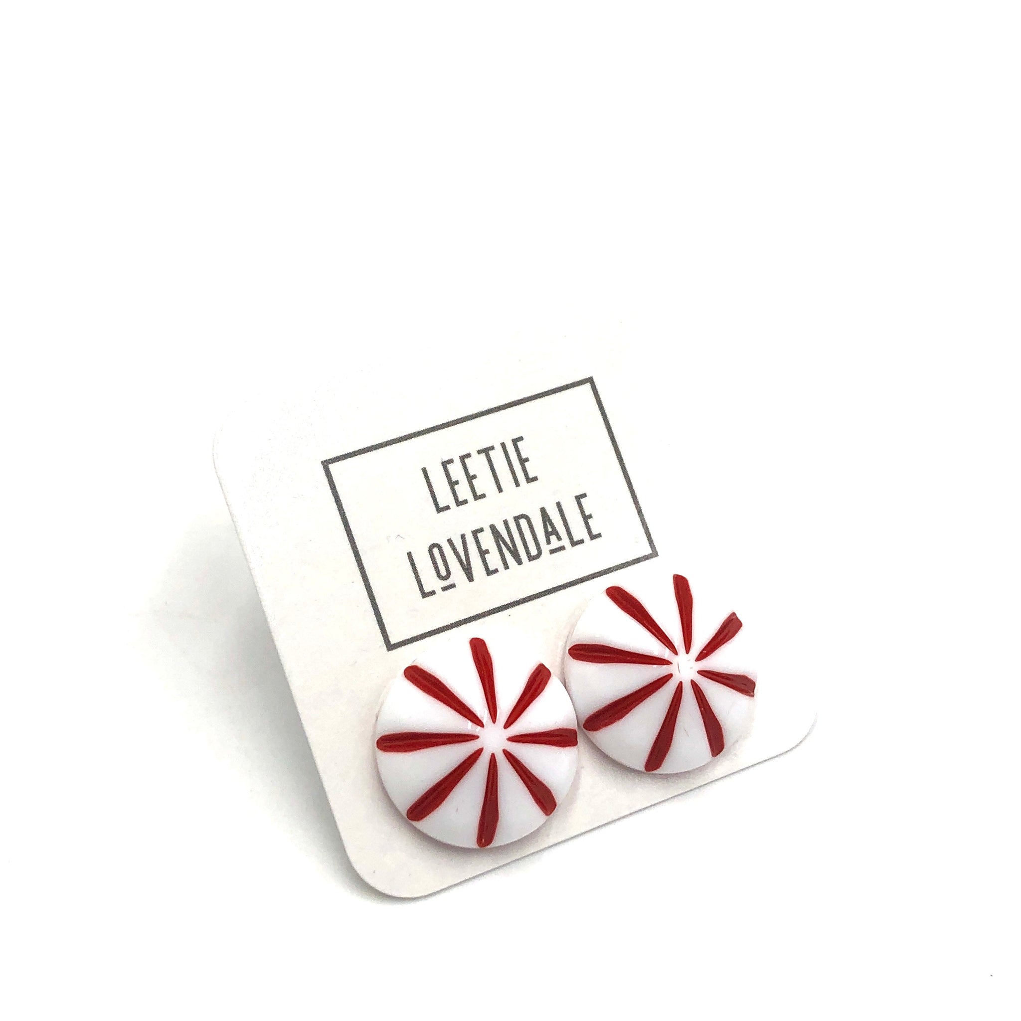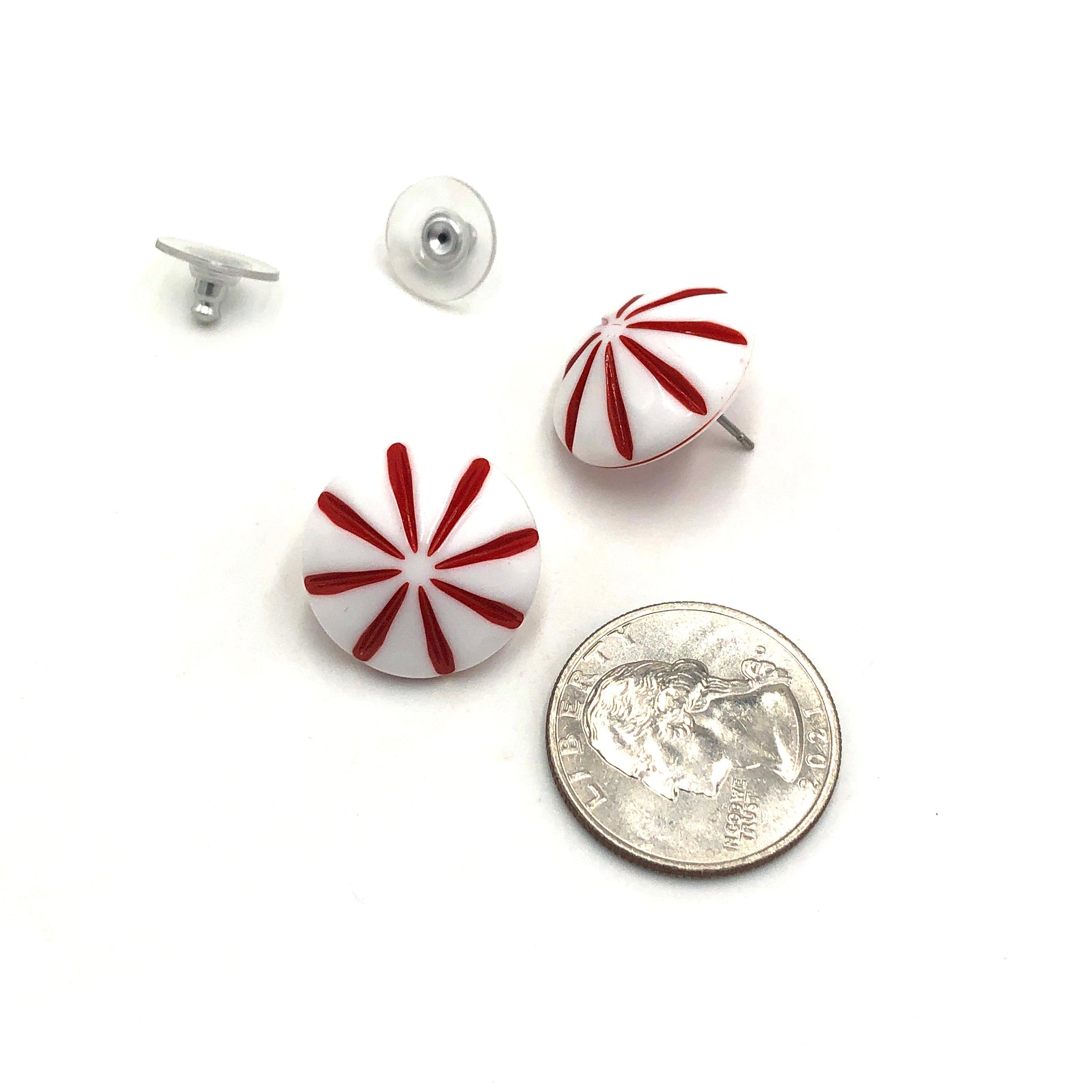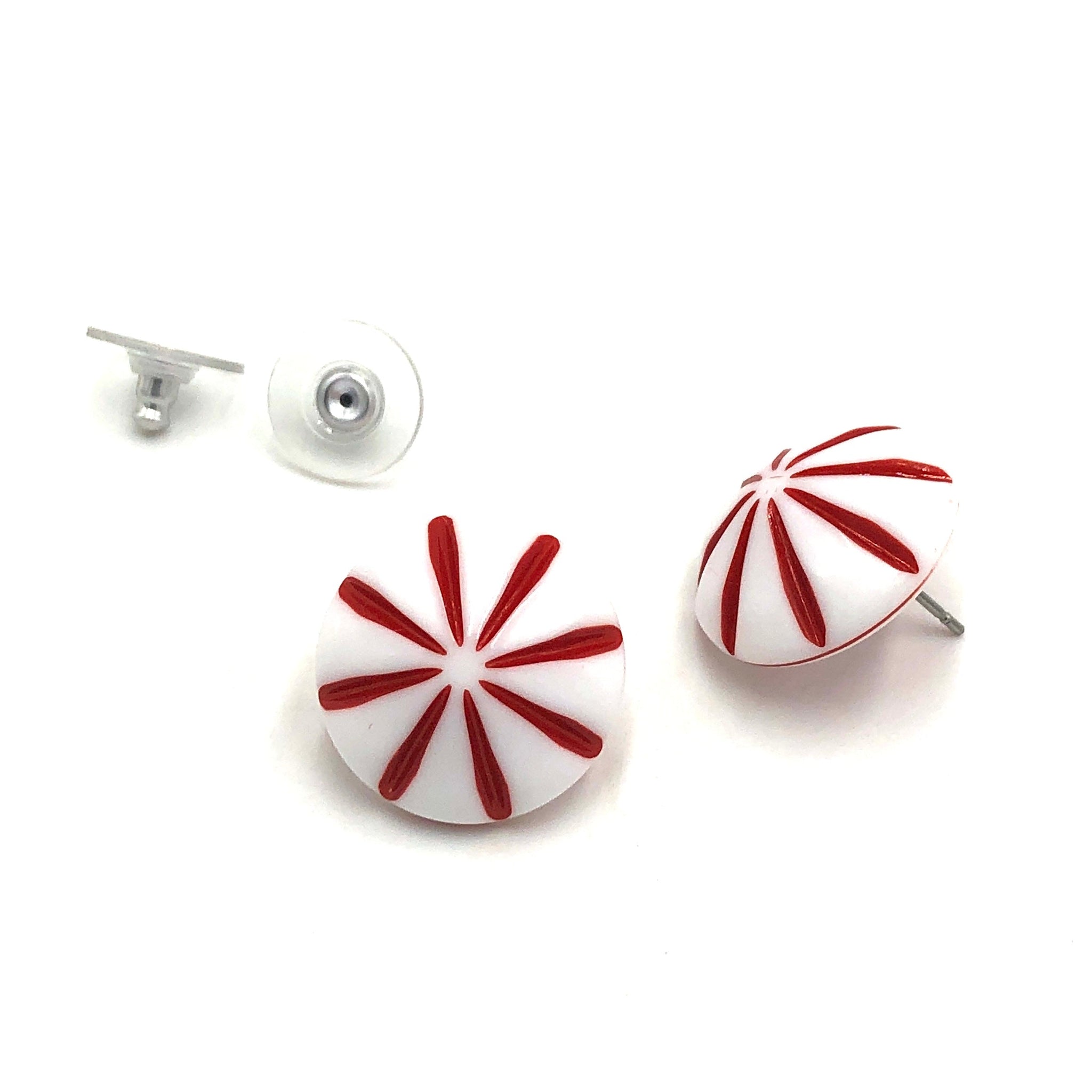 Cherry red & white stud earrings in a daisy motif on a domed button shape. These are the perfect addition to your accessories collection. These are a part of the 'Retro Button Stud' line & comes in lots of other sizes & colors. Each measures about 18mm or just under 3/4" in diameter.