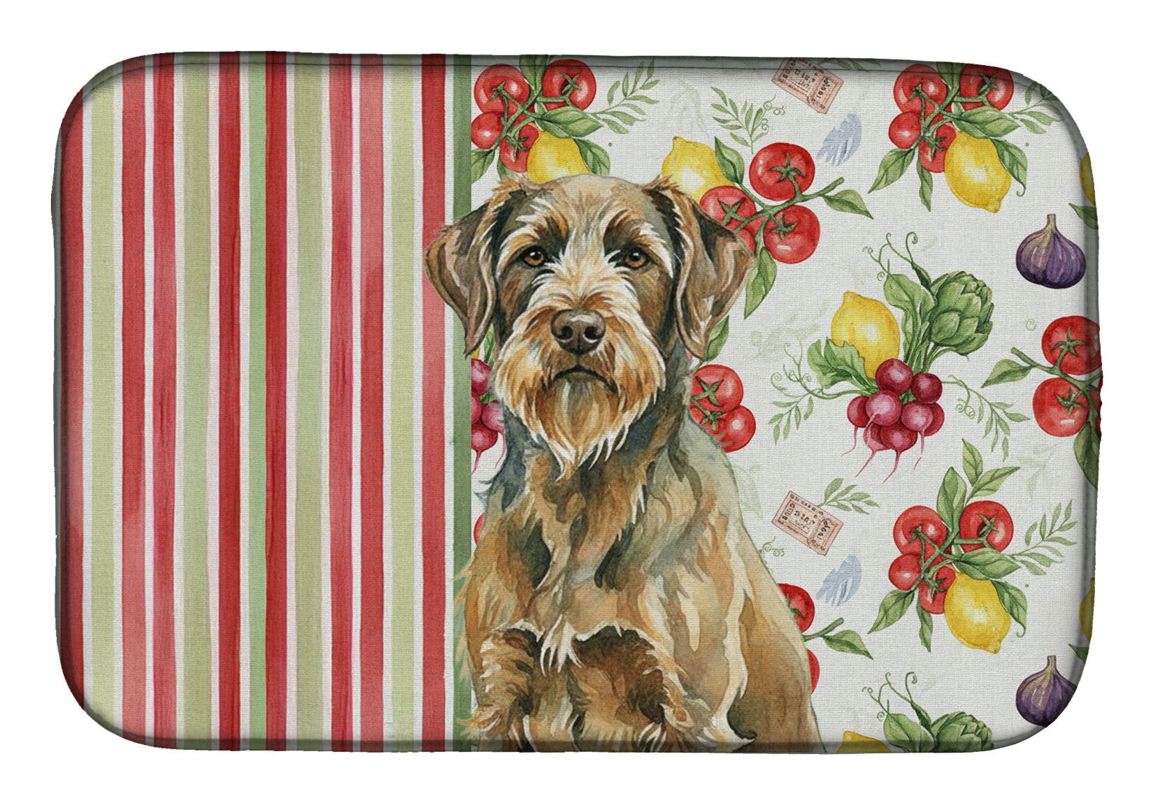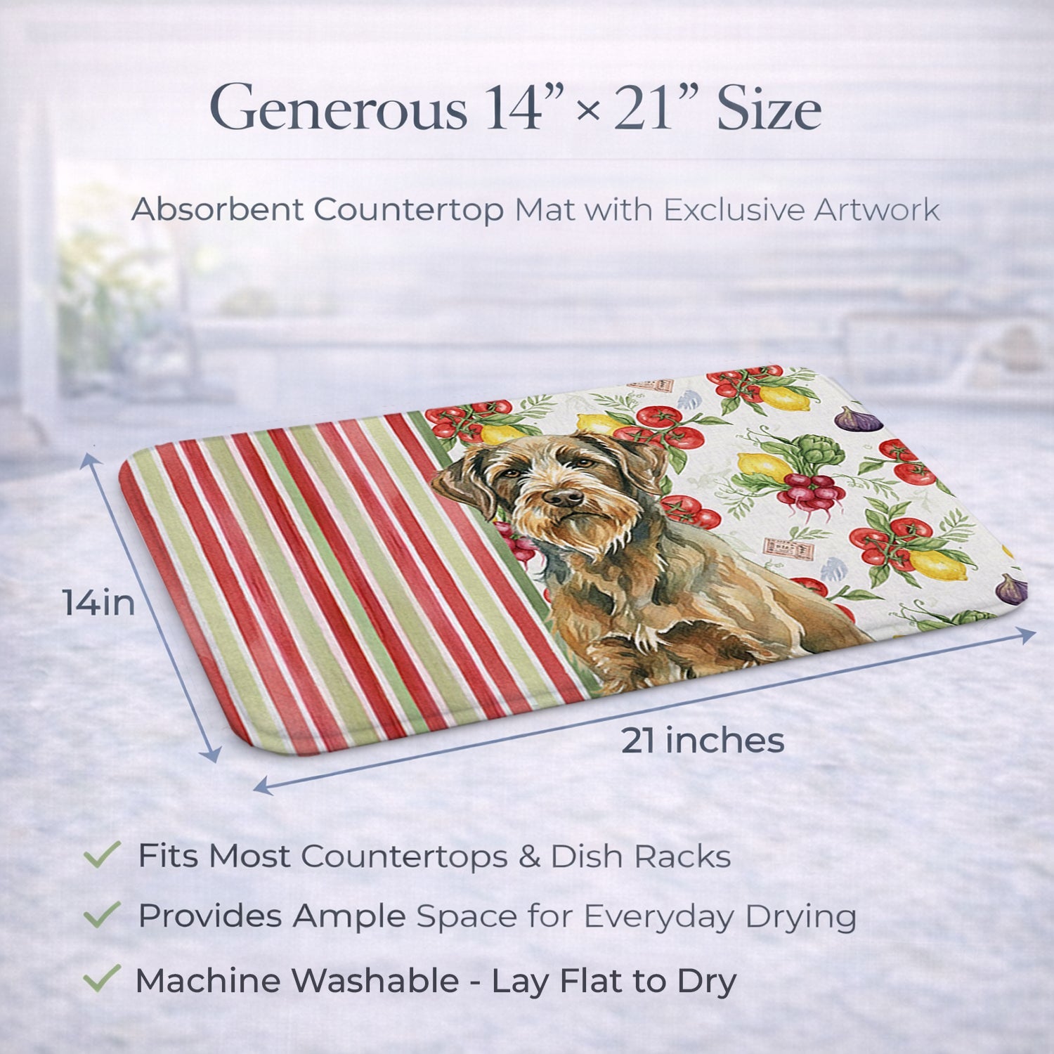 Shown here is the Chestnut Wirehaired Pointing Griffon Vegetables Dish Drying Mat from Caroline's Treasures featuring artwork of a Wirehaired Pointing Griffon in a Everyday design. The detailed illustration and vibrant colors make it a standout accent that celebrates both seasonal style and love for the subject. This image features a vibrant watercolor vegetable pattern with tomatoes, lemons, artichokes, figs, radishes, and leafy greens arranged in a repeating design, paired with classic red and green stripes. The bright, garden-fresh palette creates a cheerful, farmhouse-inspired look that feels lively, welcoming, and perfect for kitchen décor. Everyday décor celebrates personal style and the small moments that make a house feel like home. Thoughtful designs add warmth and personality that can be enjoyed year-round. Say goodbye to messy countertops and soggy dish towels with our innovative dish drying mat. Our high-quality dish drying pad is designed to keep your countertops dry while offering a stylish and efficient solution. Whether you're air drying dishes, glasses, stemware, silverware, pots, pans, bottles, or even fruits and vegetables, our dish mat is the perfect choice. The 14 inches x 21 inches size fits most counters and dish drying racks, and the non-slip design ensures stability. Made with water-absorbent polyester and a polyurethane foam insert, our dish drying mat is not only functional but also durable. It's machine washable and printed in the USA for long-lasting use. The beautiful artwork adds flair to your kitchen decor, making it a perfect housewarming gift or present for any occasion. Upgrade your kitchen experience with our absorbent and versatile dish drying mat. Perfect for: Kitchen counters and sinks, everyday dish drying and countertop protection, Dogs-themed homes, or year-round use for Wirehaired Pointing Griffon lovers. Wirehaired Pointing Griffons are versatile sporting dogs known for their intelligence and rugged coats. This breed is valued for its loyalty, endurance, and strong hunting instincts. Makes a heartfelt gift for: Wirehaired Pointing Griffon owners, Dogs lovers, Everyday gifts, pet parents, friends who adore their Wirehaired Pointing Griffon, or anyone celebrating Dogs.