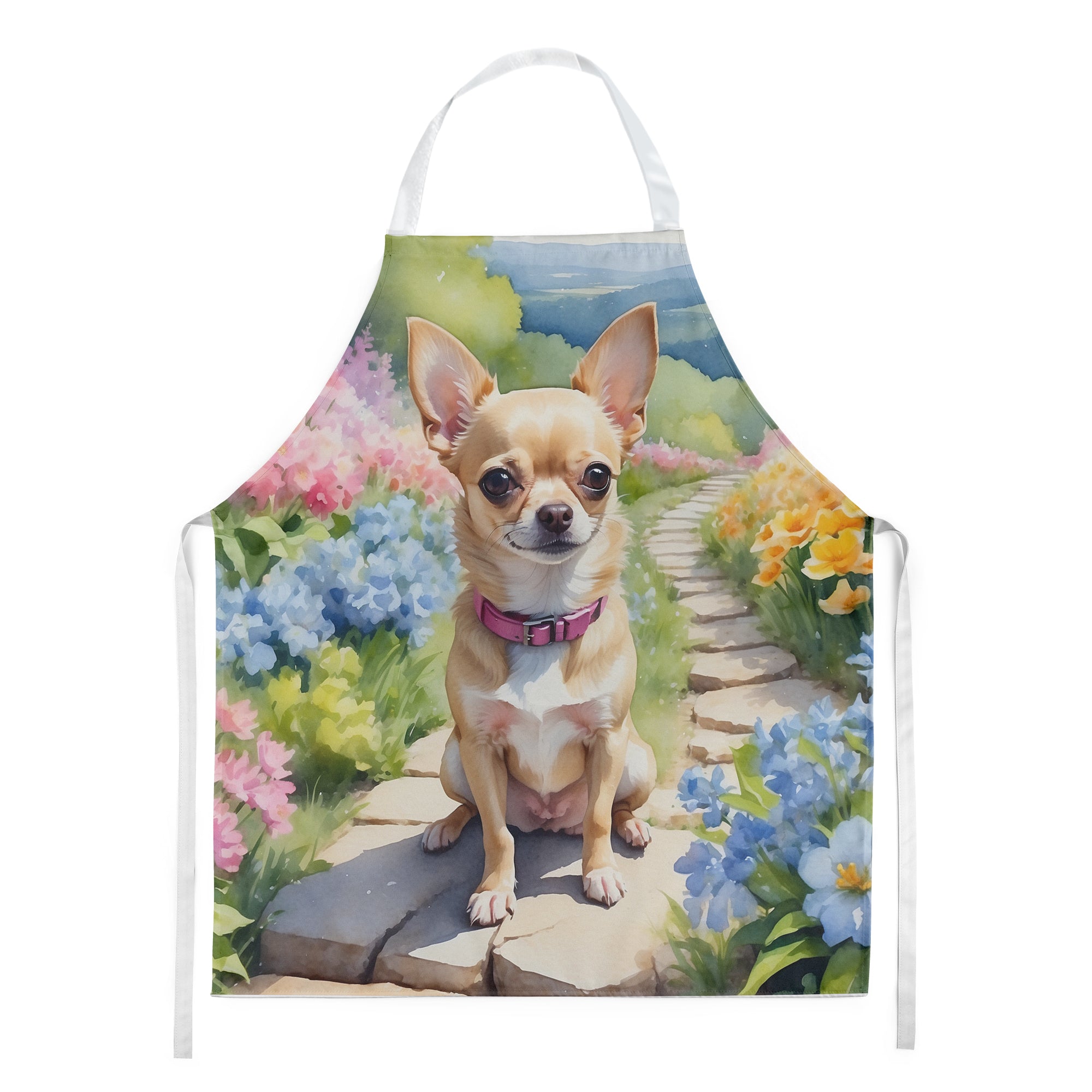 Decorate your space with our Chihuahua artwork on a Apron. Bring a bit of Spring into your home with a Spring Apron. Elevate your cooking, baking, and grilling experiences with our versatile Kitchen or BBQ Apron. This Bib Style apron isn't just limited to culinary activities - it also serves as an excellent baking apron, artist apron, server apron, gardening apron, or even a dog grooming apron. The apron showcases vibrant full-color artwork contributed by one of our talented artists, bringing a dash of style to your daily tasks. With dimensions of approximately 27"W x 30"H, it provides ample coverage to protect your clothing from spills and splashes. Our apron is meticulously crafted from 100% Ultra Spun Polyester, known for its durability and lightweight nature. The apron comes with white tie straps, ensuring a comfortable and adjustable fit for all. It's a perfect choice for kitchen apron enthusiasts, whether you are a woman or a man. Designed for easy maintenance, this apron is fully machine washable. The quick-drying polyester material actively reduces staining, keeping your apron looking fresh and new for longer. Our beautifully designed apron isn't just a functional kitchen accessory - it's a fashion statement in the culinary world!