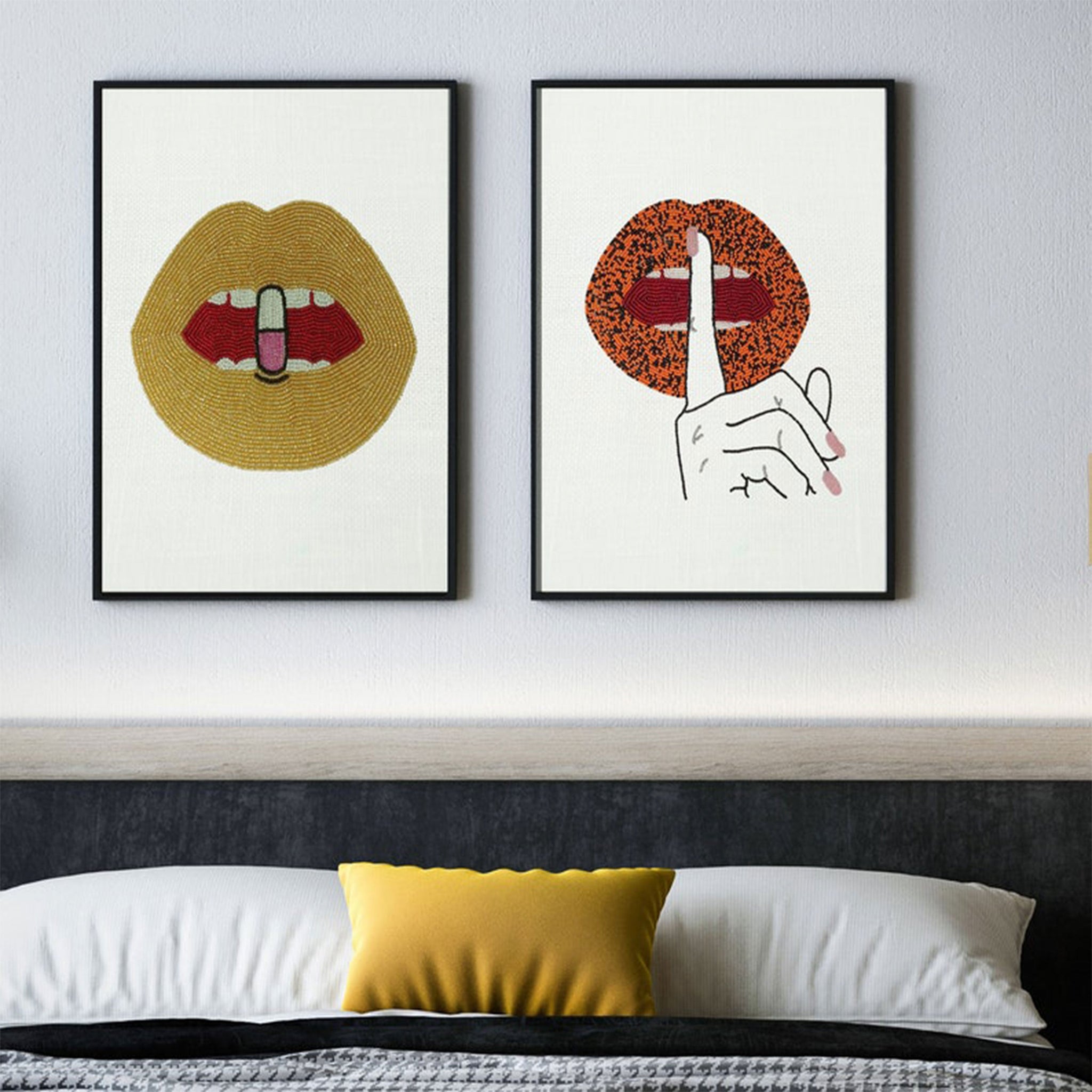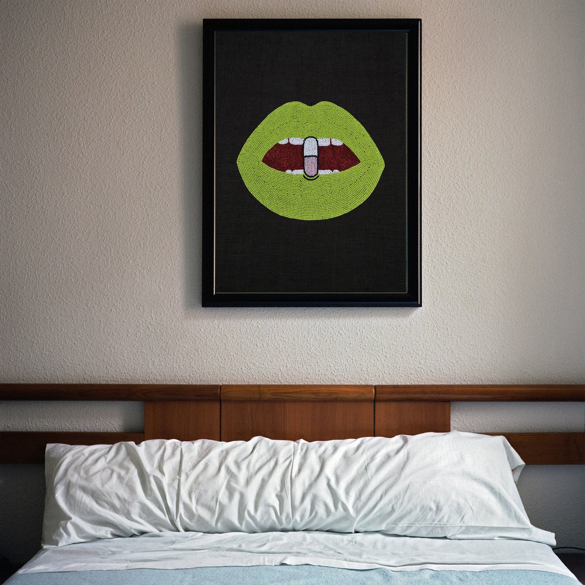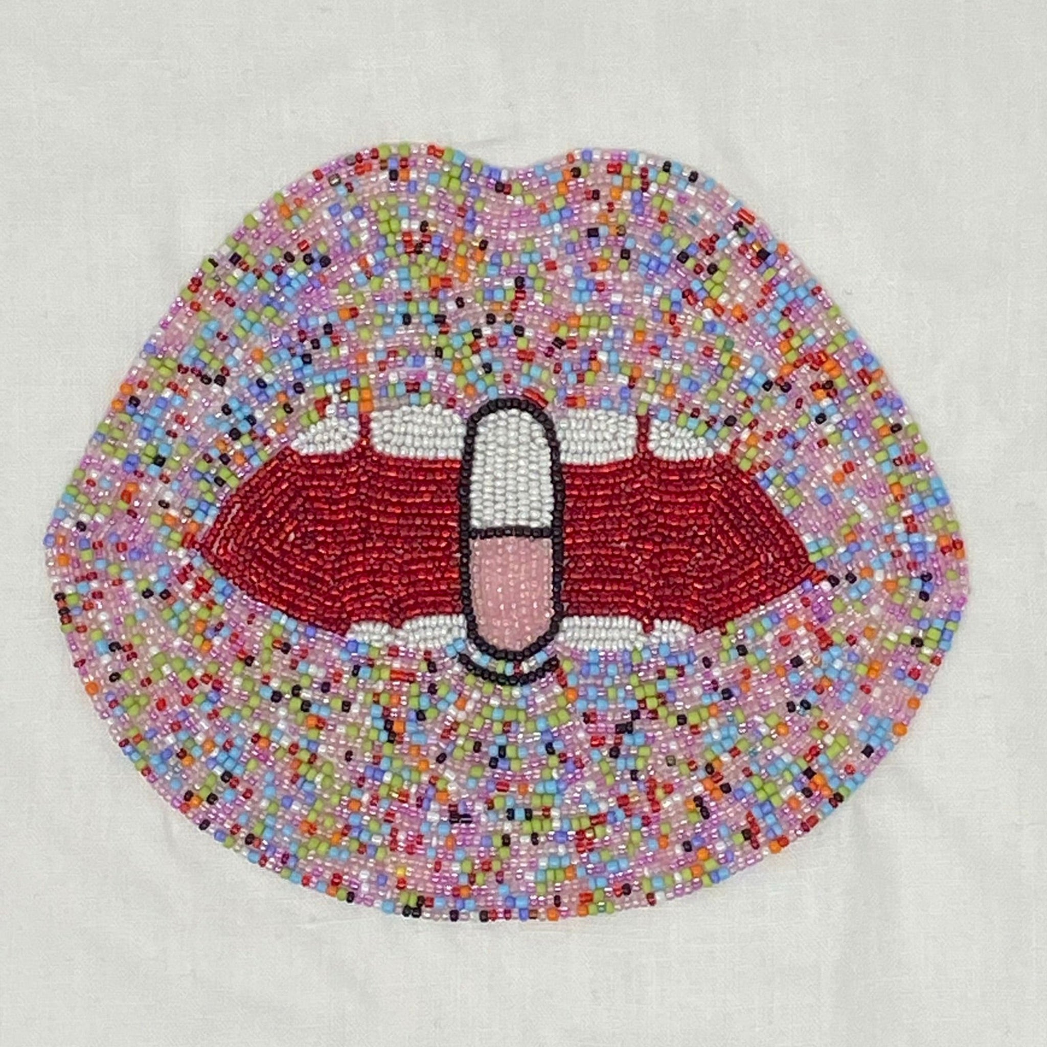 "Chill Pill" is a pop-art wall art that looks great in any style setting. The eye is quickly drawn to the beads that are individually stitched, one by one onto an ivory pure linen fabric. Each bead is hand sewn, one by one to ensure the image retains its form over time. This gorgeous and iconic art will add a touch of glam to any room or office! A great gift idea that will bring a smile to your face every time you see it!