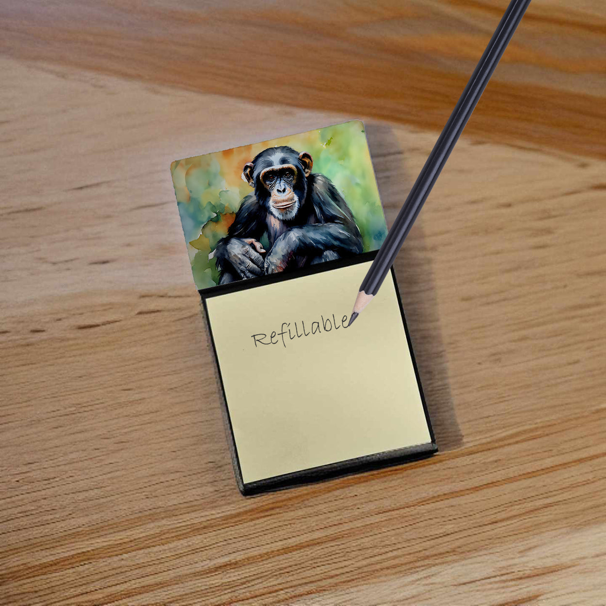 Decorate your space with our Chimpanzee artwork on a Sticky Note Holder. Add a touch of creativity and flair to your desk with the Decorative Sticky Note Holder from Caroline's Treasures. This uniquely designed sticky note dispenser will not only keep your notes in one place but also add an artistic element to your workspace. The top of the holder features beautiful artwork that is sure to catch the eye. Crafted for convenience, this sticky note holder comes with a small pad of 3-inch x 3-inch sticky notes at the bottom. The holder is designed for easy refilling; simply remove the last sheet of a new sticky note pad and stick it onto the board. This feature ensures you will always have sticky notes at your disposal. This Sticky Note Holder makes a perfect gift. Be it for your colleagues at work, your Facebook friends, or even your dog groomer or hairdresser, this versatile product fits the bill. You can use it for making grocery lists, leaving notes for loved ones, or for jotting down important reminders. The bottom board is rigid and can be magnetized by adding a business card size magnet to the back (sold separately). This makes it even more versatile, allowing you to place it on a refrigerator or any other magnetic surface. With this Sticky Note Holder, you're not only organizing your notes, but also personalizing your space.